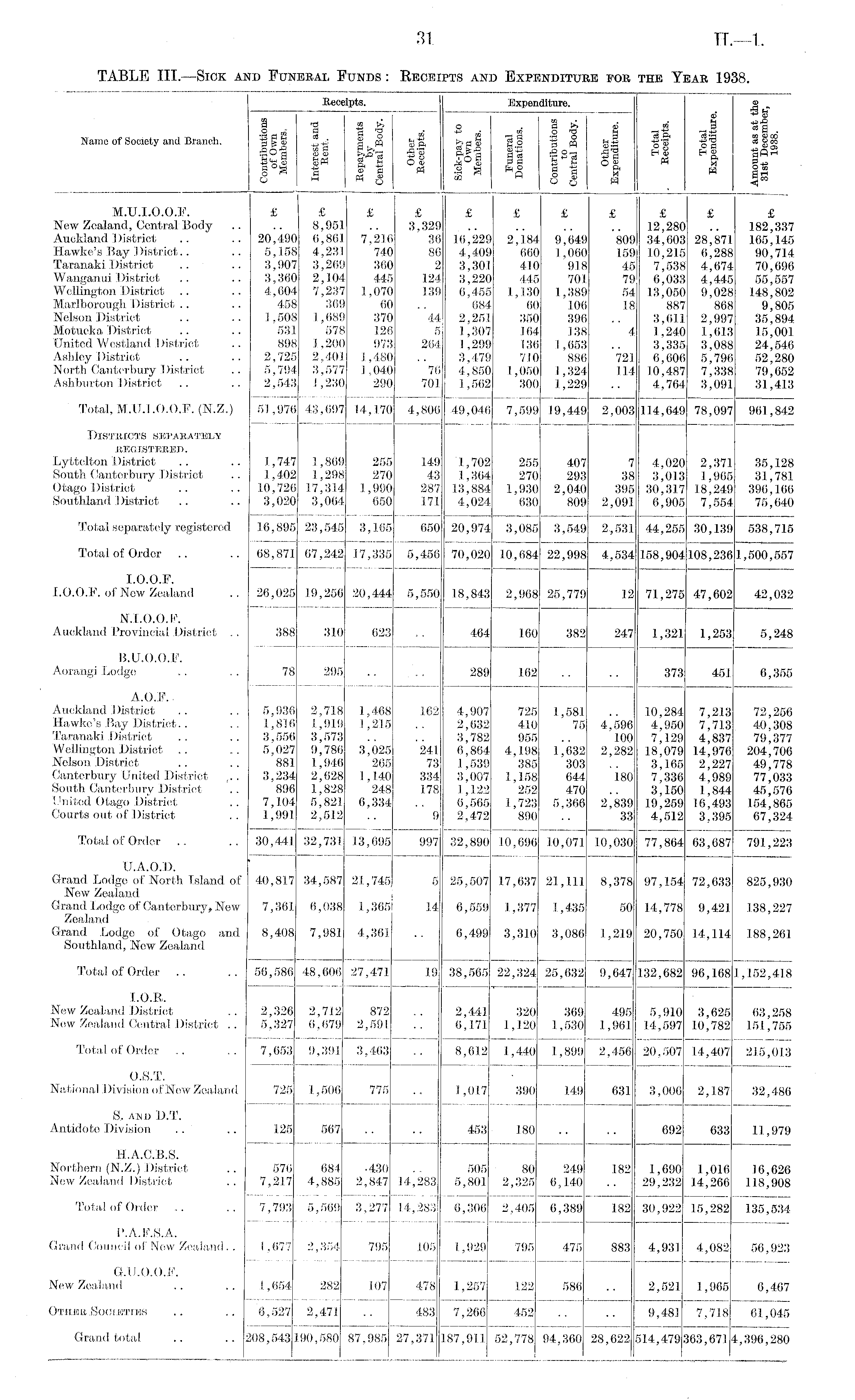 TABLE III. —Sick and Funeral Funds: Receipts and Expenditure for the Year 1938.
