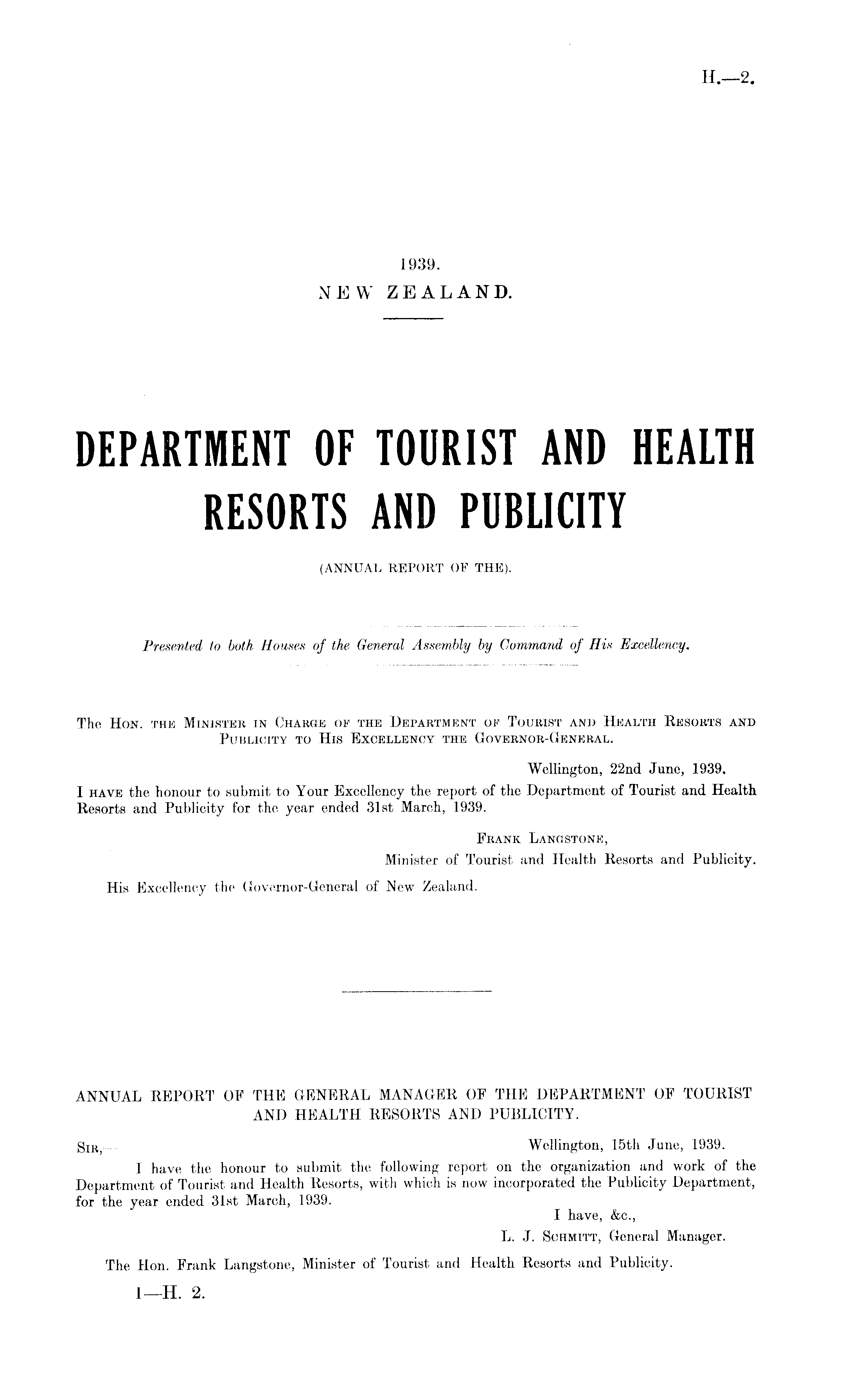 ANNUAL REPORT OF THE GENERAL MANAGER OF THE DEPARTMENT OF TOURIST AND HEALTH RESORTS AND PUBLICITY. Sib, — Wellington, 15th June, 1939. I have the honour to submit the following report on the organization and work of the Department of Tourist and Health Resorts, with which is now incorporated the Publicity Department, for the year ended 31st March, 1939. I have, &c., L. J. Schmitt, General Manager. The Hon. Frank Langstone, Minister of Tourist and Health Resorts and Publicity.