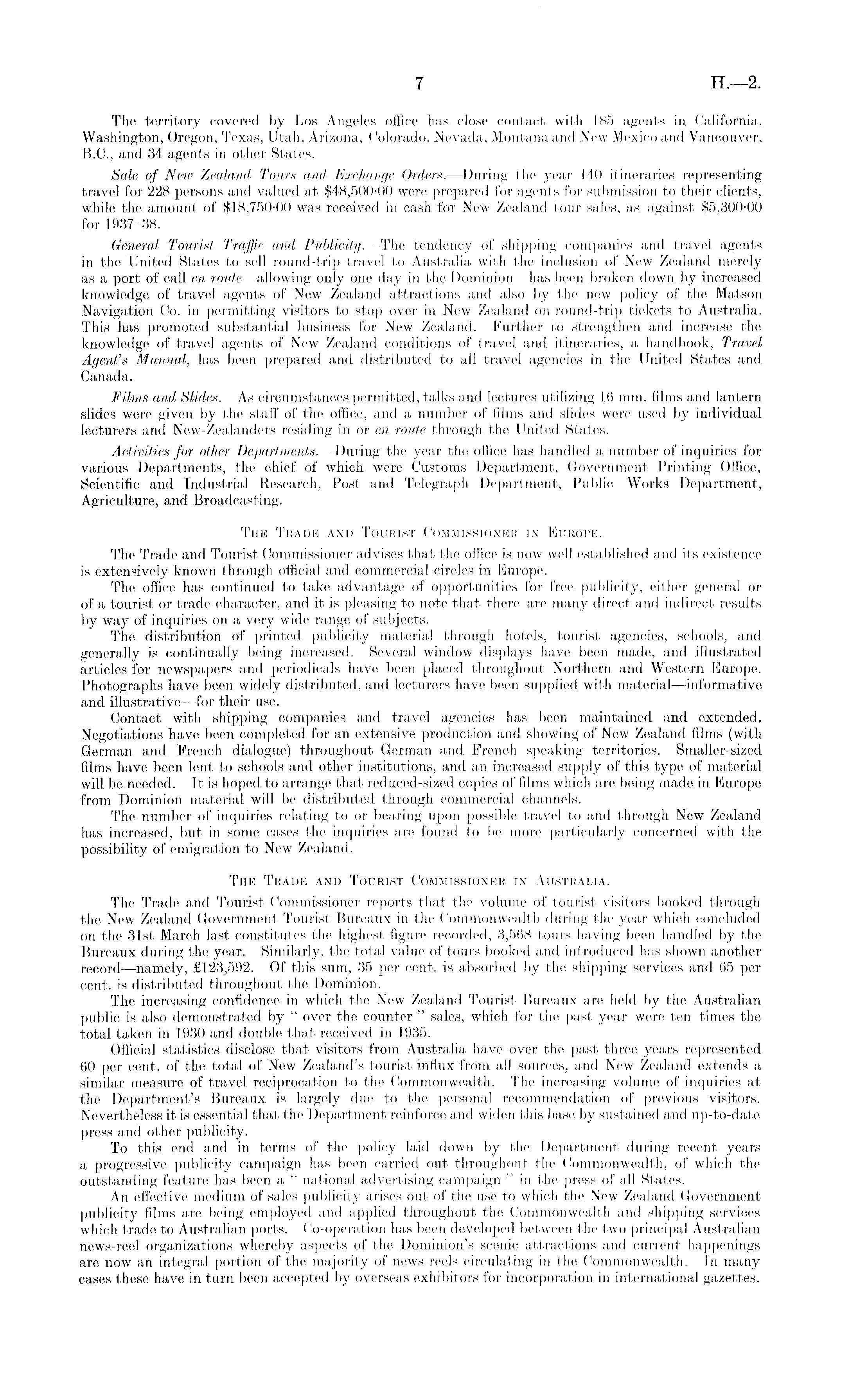 The territory covered by Los Angeles office has close contact with 185 agents in California, Washington, Oregon, Texas, Utah, Arizona, Colorado, Nevada, Montana and New Mexico and Vancouver, 8.C., and 34 agents in other States. Sale of New Zealand Tours and Exchange Orders. —During the year 140 itineraries representing travel for 228 persons and valued at $48,50000 were prepared for agents for submission to their clients, while the amount of $18,750-00 was received in cash for New Zealand tour sales, as against $5,300-00 for 1937-38. General Tourist Traffic and Publicity. —The tendency of shipping companies and travel agents in the United States to sell round-trip travel to Australia with the inclusion of New Zealand merely as a port of call en route —allowing only one day in the Dominion- has been broken down by increased knowledge of travel agents of New Zealand attractions and also by the new policy of the Matson Navigation Co. in permitting visitors to stop over in New Zealand on round-trip tickets to Australia. This has promoted substantial business for New Zealand. Further to strengthen and increase the knowledge of travel agents of New Zealand conditions of travel and itineraries, a handbook, Travel Agent's Manual, has been prepared and distributed to all travel agencies in the United States and Canada. Films and Slides. —As circumstances permitted, talks and lectures utilizing 16 mm. films and lantern slides were given by the staff of the office, and a number of films and slides were used by individual lecturers and New-Zealanders residing in or en route through the United States. Activities for other Departments. —During the year the office has handled a number of inquiries for various Departments, the chief of which were Customs Department, Government Printing Office, Scientific and Industrial Research, Post and Telegraph Department, Public Works Department, Agriculture, and Broadcasting. The Trade and Tourist Commissioner in Europe. The Trade and Tourist Commissioner advises that the office is now well established and its existence is extensively known through official and commercial circles in Europe. The office has continued to take advantage of opportunities for free publicity, either general or of a tourist or trade character, and it is pleasing to note that there are many direct and indirect results by way of inquiries on a very wide range of subjects. The distribution of printed publicity material through hotels, tourist agencies, schools, and generally is continually being increased. Several window displays have been made, and illustrated articles for newspapers and periodicals have been placed throughout Northern and Western Europe. Photographs have been widely distributed, and lecturers have been supplied with material —informative and illustrative —for their use. Contact with shipping companies and travel agencies has been maintained and extended. Negotiations have been completed for an extensive production and showing of New Zealand films (with German and French dialogue) throughout German and French speaking territories. Smaller-sized films have been lent to schools and other institutions, and an increased supply of this type of material will be needed. It is hoped to arrange that reduced-sized copies of films which are being made in Europe from Dominion material will be distributed through commercial channels. The number of inquiries relating to or bearing upon possible travel to and through New Zealand has increased, but in some cases the inquiries are found to be more particularly concerned with the possibility of emigration to New Zealand. The Trade and Tourist Commissioner in Australia. The Trade and Tourist Commissioner reports that the volume of tourist visitors booked through the New Zealand Government Tourist Bureaux in the Commonwealth during the year which concluded on the 31st March last constitutes the highest figure recorded, 3,568 tours having been handled by the Bureaux during the year. Similarly, the total value of tours booked and introduced has shown another record —namely, £123,592. Of this sum, 35 per cent, is absorbed by the shipping services and 65 per cent, is distributed throughout the Dominion. The increasing confidence in which the New Zealand Tourist Bureaux are held by the Australian public is also demonstrated by " over the counter " sales, which for the past year were ten times the total taken in 1930 and double that received in 1935. Official statistics disclose that visitors from Australia have over the past three years represented 60 per cent, of the total of New Zealand's tourist influx from all sources, and New Zealand extends a similar measure of travel reciprocation to the Commonwealth. The increasing volume of inquiries at the Department's Bureaux is largely due to the personal recommendation of previous visitors. Nevertheless it is essential that the Department reinforce and widen this base by sustained and up-to-date press and other publicity. To this end and in terms of the policy laid down by the Department during recent years a progressive publicity campaign has been carried out throughout the Commonwealth, of which the outstanding feature has been a " national advertising campaign " in the press of all States. An effective medium of sales publicity arises out of the use to which the New Zealand Government publicity films are being employed and applied throughout the Commonwealth and shipping services which trade to Australian ports. Co-operation has been developed between the two principal Australian news-reel organizations whereby aspects of the Dominion's scenic attractions and current happenings are now an integral portion of the majority of news-reels circulating in the Commonwealth. In many cases these have in turn been accepted by overseas exhibitors for incorporation in international gazettes.