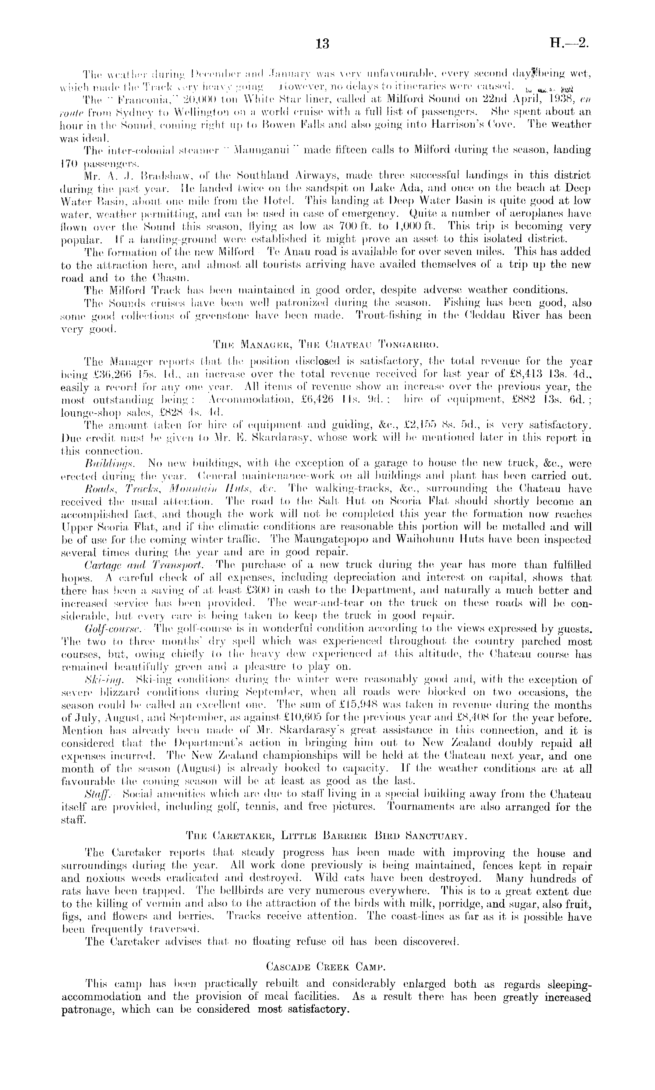 The weather during December and January was very unfavourable, every second day|[being wet, which, made the Track very heavy going. However, no delays to itineraries were caused, y. The " Franconia," 20,000 ton White Star liner, called at Milford Sound on 22nd April, 1938, en route from Sydney to Wellington on a world cruise with a full list of passengers. She spent about an hour in the Sound, coming right up to Bowen Falls and also going into Harrison's Cove. The weather was ideal. The inter-colonial steamer " Maunganui " made fifteen calls to Milford during the season, landing 170 passengers. Mr. A. J. Bradshaw, of the Southland Airways, made three successful landings in this district during the past year. He landed twice on the sandspit on Lake Ada, and once on the beach at Deep Water Basin, about one mile from the Hotel. This landing at Deep Water Basin is quite good at low water, weather permitting, and can be used in case of emergency. Quite a number of aeroplanes have flown over the Sound this season, flying as low as 700 ft. to 1,000 ft. This trip is becoming very popular. If a landing-ground were established it might prove an asset to this isolated district. The formation of the new Milford -To Anau road is available for over seven miles. This has added to the attraction here, and almost all tourists arriving have availed themselves of a trip up the new road and to the Chasm. The Milford Track has been maintained in good order, despite adverse weather conditions. The Sounds cruises have been well patronized during the season. Fishing has been good, also some good collections of greenstone have been made. Trout-fishing in the Cleddau River has been very good. The Manager, The Chateau Tongariro. The Manager reports that the position disclosed is satisfactory, the total revenue for the year being £36,266 15s. Id., an increase over the total revenue received for last year of £8,413 13s. 4d., easily a record for any one year. All items of revenue show an increase over the previous year, the most outstanding being : Accommodation, £6,426 lis. 9d. ; hire of equipment, £882 13s. 6d. ; lounge-shop sales, £828 4s. 4d. The amount taken for hire of equipment and guiding, &c., £2,155 Bs. 5d., is very satisfactory. Due credit must be given to Mr. B. Skardarasy, whose work will be mentioned later in this report in this connection. Buildings.—No new buildings, with the exception of a garage to house the new truck, &c., were erected during the year. General maintenance-work on all buildings and plant has been carried out. jßoads, Tracks, Mountain Huts, &c. —The walking-tracks, &c., surrounding the Chateau have received the usual attention. The road to the Salt Hut on Scoria Flat should shortly become an accomplished fact, and though the work will not be completed this year the formation now reaches Upper Scoria Flat, and if the climatic conditions are reasonable this portion will be metalled and will be of use for the coming winter traffic. The Maungatepopo and Waihohunu Huts have been inspected several times during the year and are in good repair. Cartage and Transport.—The purchase of a new truck during the year has more than fulfilled hopes. A careful check of all expenses, including depreciation and interest on capital, shows that there has been a saving of at least £300 in cash to the Department, and naturally a much better and increased service has been provided. The wear-and-tear on the truck on these roads will be considerable, but every care is being taken to keep the truck in good repair. Golf-course. —The golf-course is in wonderful condition according to the views expressed by guests. The two to three months' dry spell which was experienced throughout the country parched most courses, but, owing chiefly to the heavy dew experienced at this altitude, the Chateau course has remained beautifully green and a pleasure to play on. Ski-ing. —Ski-ing conditions during the winter were reasonably good and, with the exception of severe blizzard conditions during September, when all roads were blocked on two occasions, the season could be called an excellent one. The sum of £15,948 was taken in revenue during the months of July, August, and September, as against £10,605 for the previous year and £8,408 for the year before. Mention has already been made of Mr. Skardarasy's great assistance in this connection, and it is considered that the Department's action in bringing him out to New Zealand doubly repaid all expenses incurred. The New Zealand championships will be held at the Chateau next year, and one month of the season (August) is already booked to capacity. If the weather conditions are at all favourable the coming season will be at least as good as the last. Staff. —Social amenities which are due to staff living in a special building away from the Chateau itself are provided, including golf, tennis, and free pictures. Tournaments are also arranged for the staff. The Caretaker, Little Barrier Bird Sanctuary. The Caretaker reports that steady progress has been made with improving the house and surroundings during the year. All work done previously is being maintained, fences kept in repair and noxious weeds eradicated and destroyed. Wild cats have been destroyed. Many hundreds of rats have been trapped. The bellbirds are very numerous everywhere. This is to a great extent due to the killing of vermin and also to the attraction of the birds with milk, porridge, and sugar, also fruit, figs, and flowers and berries. Tracks receive attention. The coast-lines as far as it is possible have been frequently traversed. The Caretaker advises that no floating refuse oil has been discovered. Cascade Creek Camp. This camp has been practically rebuilt and considerably enlarged both as regards sleepingaccommodation and the provision of meal facilities. As a result there has been greatly increased patronage, which can be considered most satisfactory.