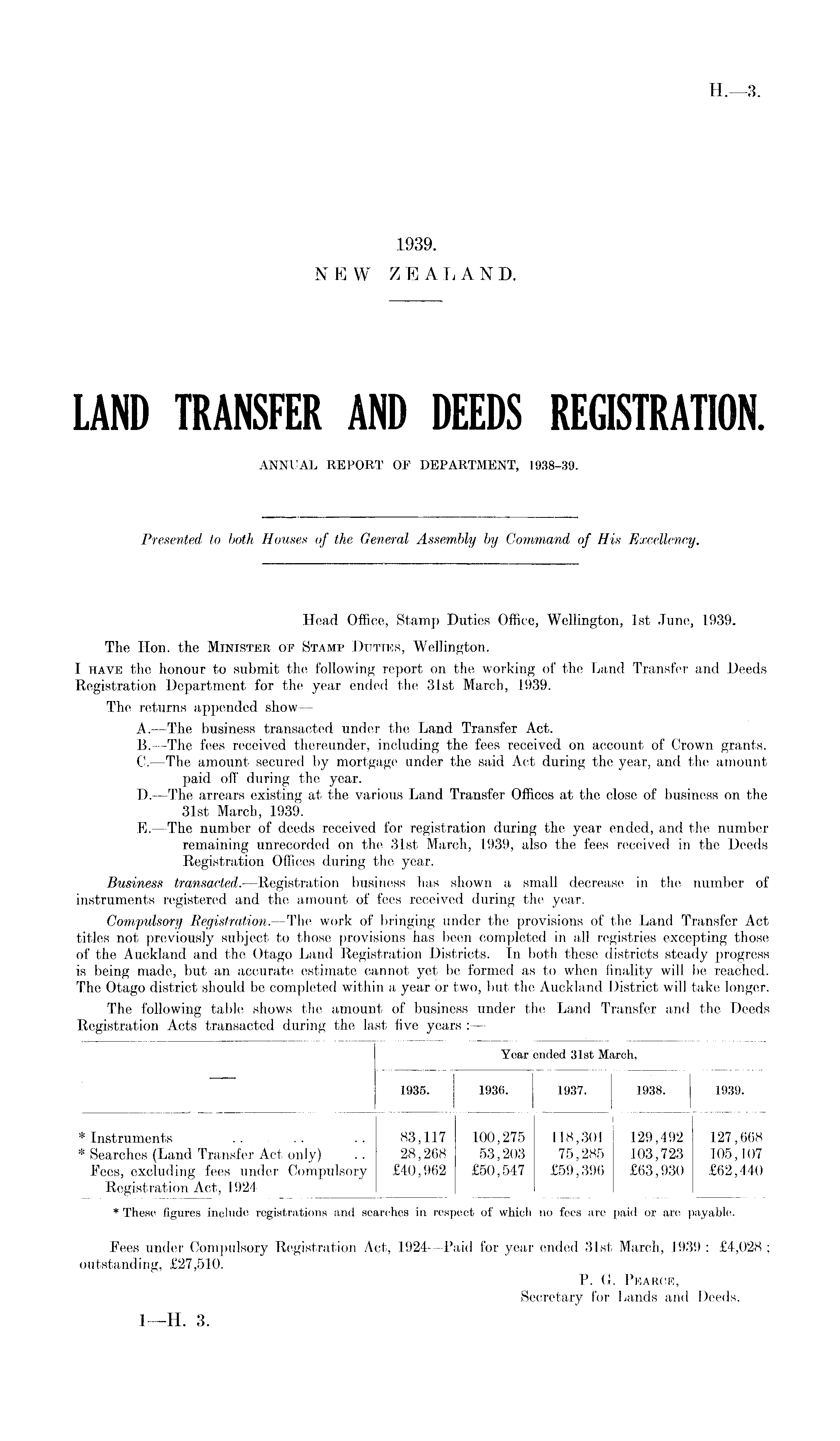Head Office, Stamp Duties Office, Wellington, Ist June, 1939. The Hon. the Minister of Stamp Duties, Wellington. I have the honour to submit the following report on the working of the Land Transfer and Deeds Registration Department for the year ended the 31st March, 1939. The returns appended show — A.—The business transacted under the Land Transfer Act. B.—The fees received thereunder, including the fees received on account of Crown grants. C. —The amount secured by mortgage under the said Act during the year, and the amount paid off during the year. D.—The arrears existing at the various Land Transfer Offices at the close of business on the 31st March, 1939. E. —The number of deeds received for registration during the year ended, and the number remaining unrecorded on the 31st March, 1939, also the fees received in the Deeds Registration Offices during the year. Business transacted. —Registration business has shown a small decrease in the number of instruments registered and the amount of fees received during the year. Compulsory Registration. —The work of bringing under the provisions of the Land Transfer Act titles not previously subject to those provisions has been completed in all registries excepting those of the Auckland and the Otago Land Registration Districts. In both these districts steady progress is being made, but an accurate estimate cannot yet be formed as to when finality will be reached. The Otago district should be completed within a year or two, but the Auckland District will take longer. The following table shows the amount of business under the Land Transfer and the Deeds Registration Acts transacted during the last five years : —