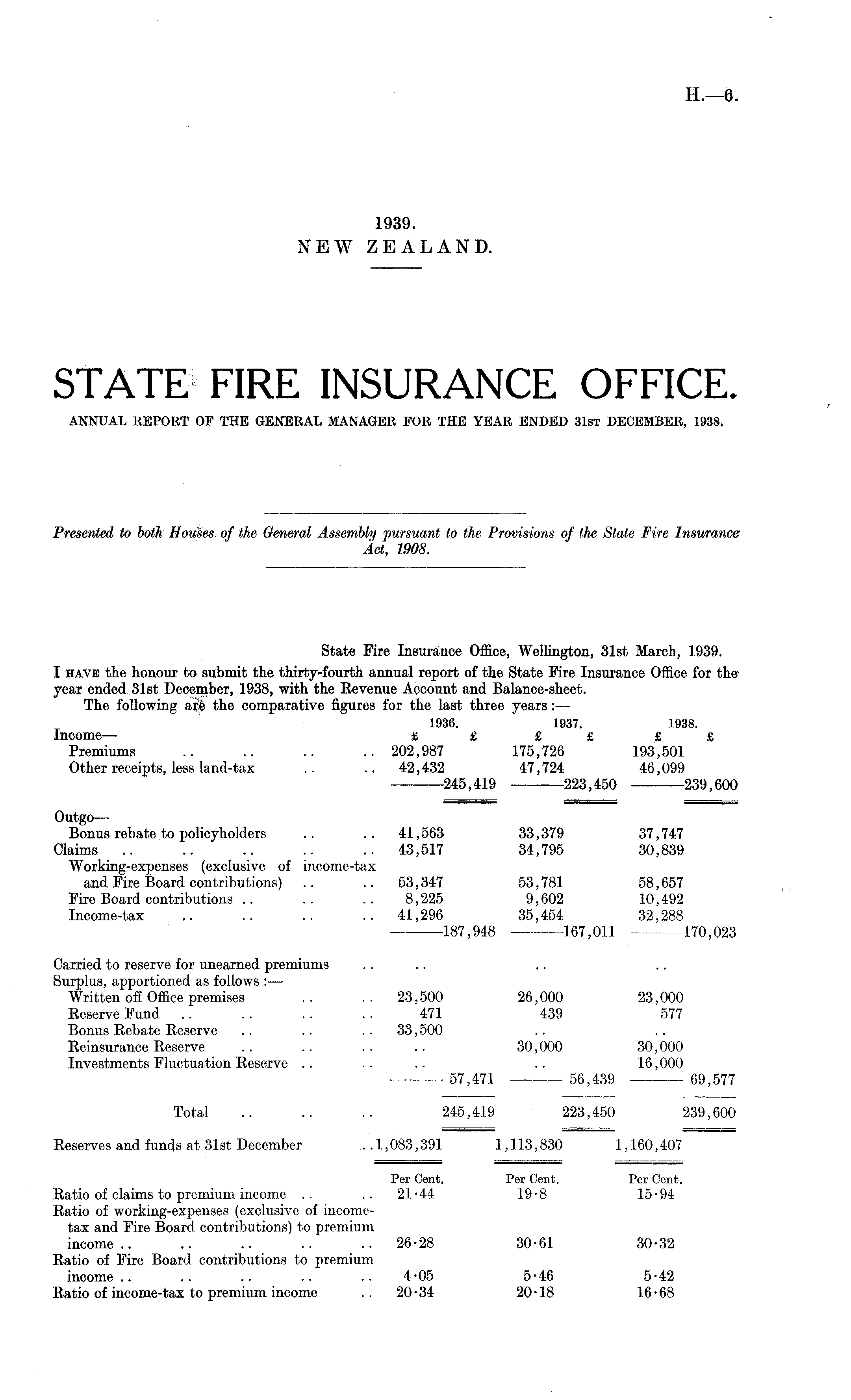 STATE FIRE INSURANCE OFFICE ANNUAL REPORT OF THE GENERAL MANAGER FOR THE YEAR ENDED 31st DECEMBER, 1938.