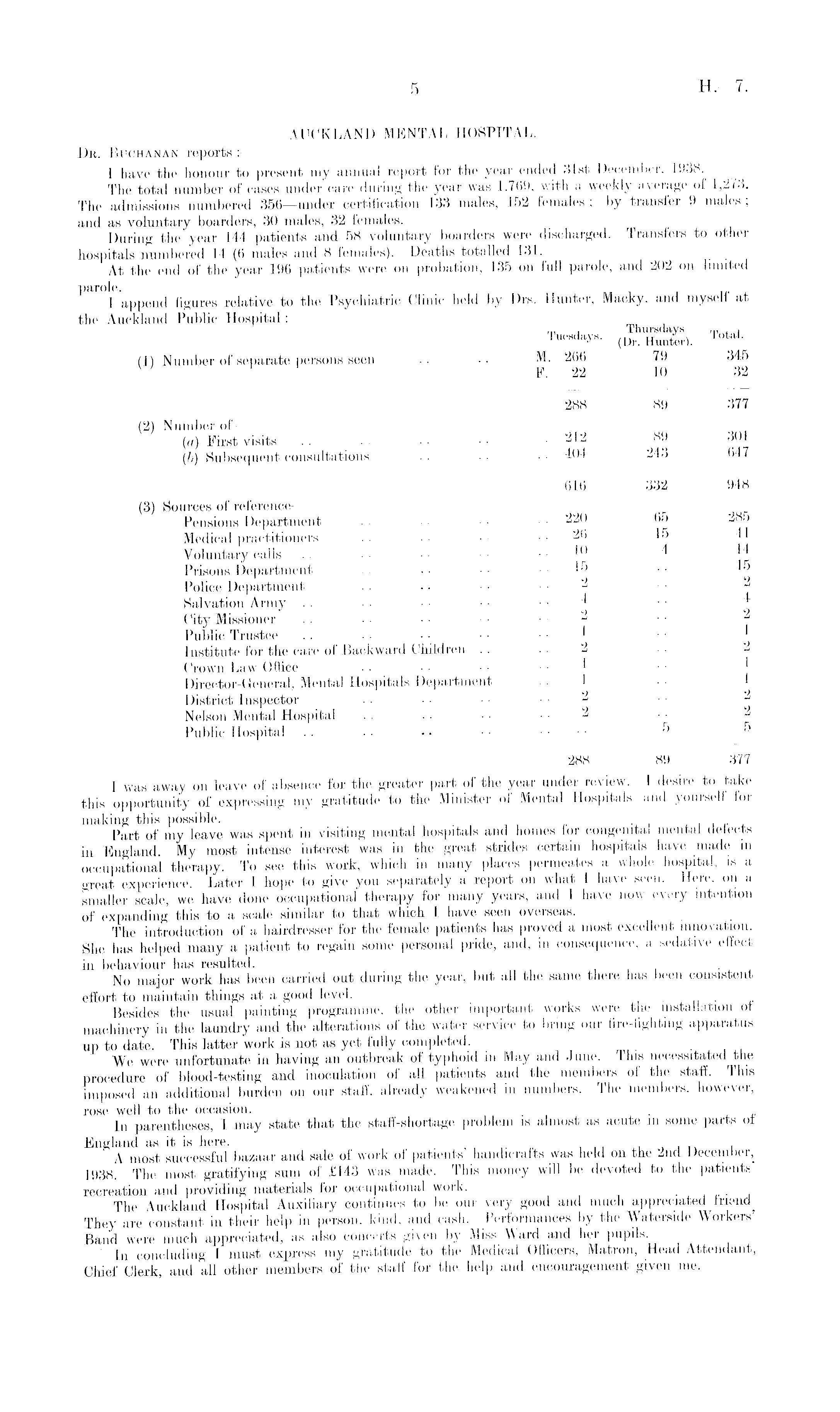 AUCKLAND MENTAL HOSPITAL. 1)k. Buchanan reports : — I have the honour to present my annual report for the year ended 31st December, 1938. The total number of oases under care during the year was 1,769, with a weekly average of 1,2/3. The admissions numbered 356 —under certification 133 males, 152 females ; by transfer 9 males , and as voluntary boarders, 30 males, 32 females. During the year 144 patients and 58 voluntary boarders were discharged. Transfers to other hospitals numbered 14 (6 males and 8 females). Deaths totalled 131. At the end of the year 196 patients were on probation, 135 on full parole, and 202 on limited parole. . I append figures relative to the Psychiatric Clinic held by Drs. Hunter, Macky, and myself at the Auckland Public Hospital: — Total. (1) Number of separate persons seen .. M. 266 79 345 v F. 22 10 32 288 89 377 (2) Number of — (a) First visits . . • ■ ■ ■ ■ ..212 89 301 (b) Subsequent consultations .. • • • • 404 243 647 616 332 948 (3) Sources of reference — _ Pensions Department .. ■ ■ 220 65 285 Medical practitioners • • ■ • • • . . 26 15 4-1 Voluntary calls .. •• ' '4 Prisons Department ■■ ..15 .. 15 Police Department . . .. ■ • . . 2 . . 2 Salvation Army .. • ■ • • • • . . 4 .. 4 City Missioner .. • ■ ■ ■ • ■ • • 2 Public Trustee .. • • • ■ ' • • * Institute for the care of Backward Children . . • ■ 2 Crown Law Office . • • • • • ■ • 1 Director-General, Mental Hospitals Department 1 ■ • 1 District Inspector .. • • • ■ ■ ■ 2 .. 2 Nelson Mental Hospital . . .. • ■ ■ • 2 Public Hospital 288 89 377 1 was away on leave of absence for the greater part of the year under review. I desire to take this opportunity of expressing my gratitude to the Minister of Mental Hospitals and yourself for making this possible. Part of my leave was spent in visiting mental hospitals and homes lor congenital mental detects in England. My most intense interest was in the great strides certain hospitals have made in occupational therapy. To see this work, which in many places permeates a whole hospital, is a great experience. Later I hope to give you separately a report on what I have seen. Here, on a smaller scale, we have done occupational therapy for many years, and I have now every intention of expanding this to a scale similar to that which I have seen overseas. The introduction of a hairdresser for the female patients has proved a most excellent innovation. She has helped many a patient to regain some personal pride, and, in consequence, a sedative effect in behaviour has resulted. , No major work has been carried out during the year, but all the same there has been consistent effort to maintain things at a good level. Besides the usual painting programme, the other important works were the installation of machinery in the laundry and the alterations of the water service to bring our fire-lighting apparatus up to date. This latter work is not as yet fully completed. We were unfortunate in having ail outbreak of typhoid in May and June. This necessitated the procedure of blood-testing and inoculation of all patients and the members of the staff. This imposed an additional burden on our staff, already weakened in numbers. The members, however, rose well to the occasion. In parentheses, I may state that the staff-shortage problem is almost as acute m some parts of England as it is here. , , Tl , A most successful bazaar and sale of work of patients handicrafts was held on the 2nd December, 1938 The most gratifying sum of £143 was made. This money will be devoted to the patients recreation and providing materials for occupational work. _ The Auckland Hospital Auxiliary continues to be our very good and much appreciated friend They are constant in their help in person, kind, and cash. Performances by the Waterside Workers' Band were much appreciated, as also concerts given by Miss Ward and her pupils. In concluding I must express my gratitude to the Medical Officers, Matron, Head Attendant, Chief Clerk, and all other members of the staff for the help and encouragement given me.