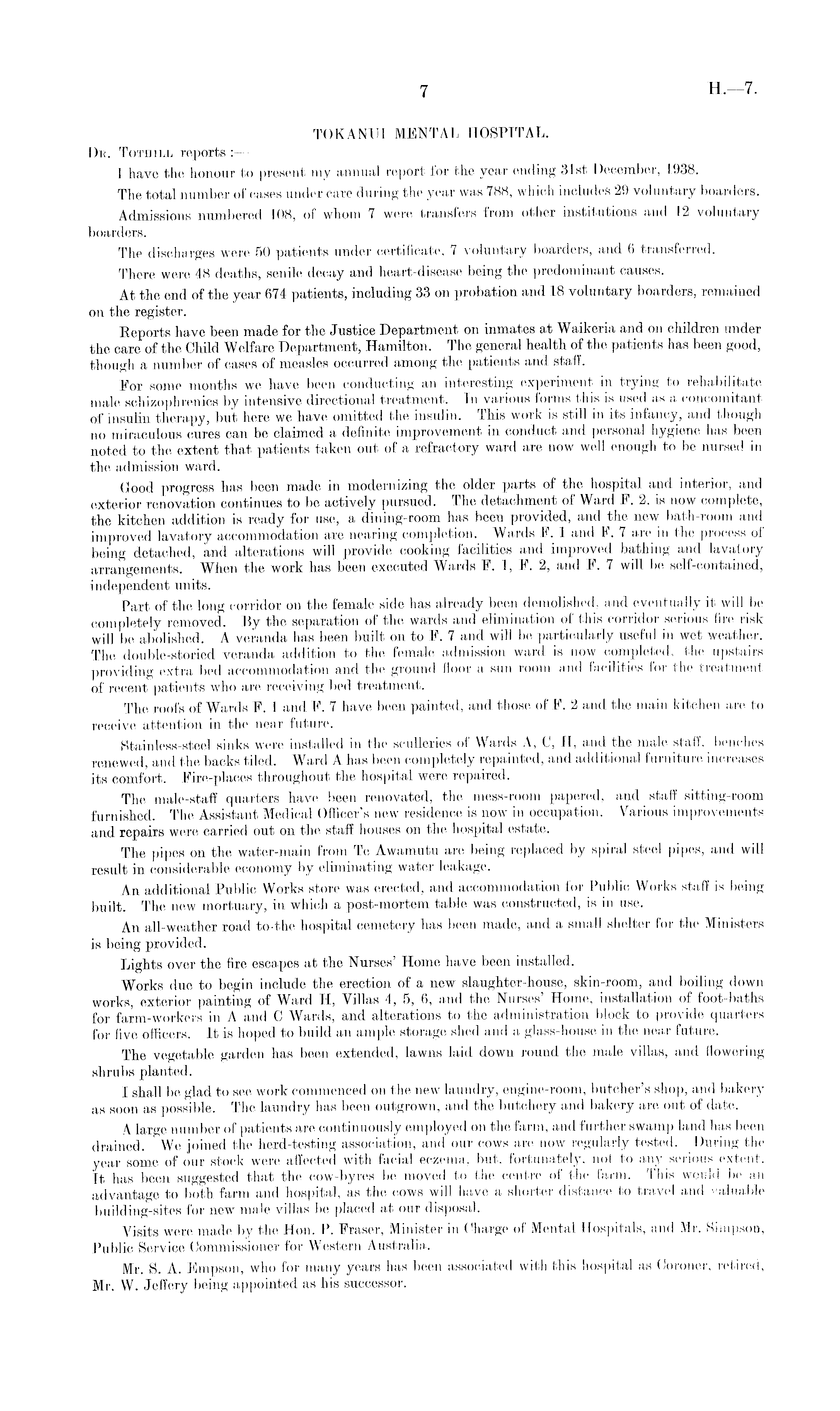 TOKANUI MENTAL HOSPITAL. Dk. Tothill reports : — I have the honour to present my annual report for the year ending 31st December, 1938. The total number of cases under care during the year was 788, which includes 29 voluntary boarders. Admissions numbered 108, of whom 7 were transfers from other institutions and 12 voluntary boarders. The discharges were 50 patients under certificate, 7 voluntary boarders, and 6 transferred. There were 48 deaths, senile decay and heart-disease being the predominant causes. At the end of the year 674 patients, including 33 on probation and 18 voluntary boarders, remained on the register. Reports have been made for the Justice Department on inmates at Waikeria and on children under the care of the Child Welfare Department, Hamilton. The general health of the patients has been good, though a number of cases of measles occurred among the patients and staff. For some months we have been conducting an interesting experiment in trying to rehabilitate male schizophrenics by intensive directional treatment. In various forms this is used as a concomitant of insulin therapy, but here we have omitted the insulin. This work is still in its infancy, and though no miraculous cures can be claimed a definite improvement in conduct and personal hygiene has been noted to the extent that patients taken out of a refractory ward are now well enough to be nursed in the admission ward. Good progress has been made in modernizing the older parts of the hospital and interior, and exterior renovation continues to be actively pursued. The detachment of Ward P. 2. is now complete, the kitchen addition is ready for use, a dining-room has been provided, and the new bath-room and improved lavatory accommodation are nearing completion. Wards F. 1 and P. 7 are in the process of being detached, and alterations will provide cooking facilities and improved bathing and lavatory arrangements. When the work has been executed Wards P. 1, P. 2, and P. 7 will be self-contained, independent units. Part of the long corridor on the female side has already been demolished, and eventually it will be completely removed. By the separation of the wards and elimination of this corridor serious fire risk will be abolished. A veranda has been built on to P. 7 and will be particularly useful in wet weather. The double-storied veranda addition to the female admission ward is now completed, the upstairs providing extra bed accommodation and the ground floor a sun room and facilities for the treatment of recent patients who are receiving bed. treatment. The roofs of Wards F. 1 and F. 7 have been painted, and those of F. 2 and the main kitchen are to receive attention in the near future. Stainless-steel sinks were installed in the sculleries of Wards A, C, H, and the male staff, benches renewed, and the backs tiled. Ward A has been completely repainted, and additional furniture increases its comfort. Fire-places throughout the hospital were repaired. The male-staff quarters have been renovated, the mess-room papered, and staff sitting-room furnished. The Assistant Medical Officer's new residence is now in occupation. Various improvements and repairs were carried out on the staff houses on the hospital estate. The pipes on the water-main from Te Awamutu are being replaced by spiral steel pipes, and will result in considerable economy by eliminating water leakage. An additional Public Works store was erected, and accommodation for Public Works staff is being built. The new mortuary, in which a post-mortem table was constructed, is in use. An all-weather road to-the hospital cemetery has been made, and a small shelter for the Ministers is being provided. Lights over the fire escapes at the Nurses' Home have been installed. Works due to begin include the erection of a new slaughter-house, skin-room, and boiling down works, exterior painting of Ward H, Villas 4, 5, 6, and the Nurses' Home, installation of foot-baths for farm-workers in A and C Wards, and alterations to the administration block to provide quarters for five officers. It is hoped to build an ample storage shed and a glass-house in the near future. The vegetable garden has been extended, lawns laid down round the male villas, and flowering shrubs planted. I shall be glad to see work commenced on the new laundry, engine-room, butcher's shop, and bakery as soon as possible. The laundry has been outgrown, and the butchery and bakery are out of date. A large number of patients are continuously employed on the farm, and further swamp land has been drained. We joined the herd-testing association, and our cows are now regularly tested. During the year some of our stock were affected with facial eczema, but, fortunately, not to any serious extent. It has been suggested that the cow-byres bo moved to the centre of the farm. This would be an advantage to both farm and hospital, as the cows will have a shorter distance to travel and valuable building-sites for new male villas be placed at our disposal. Visits were made by the Hon. P. Fraser, Minister in Charge of Mental Hospitals, and Mr. Simpson, Public Service Commissioner for Western Australia. Mr. S. A. Empson, who for many years has been associated with this hospital as Coroner, retired, Mr. W. Jeffery being appointed as his successor.