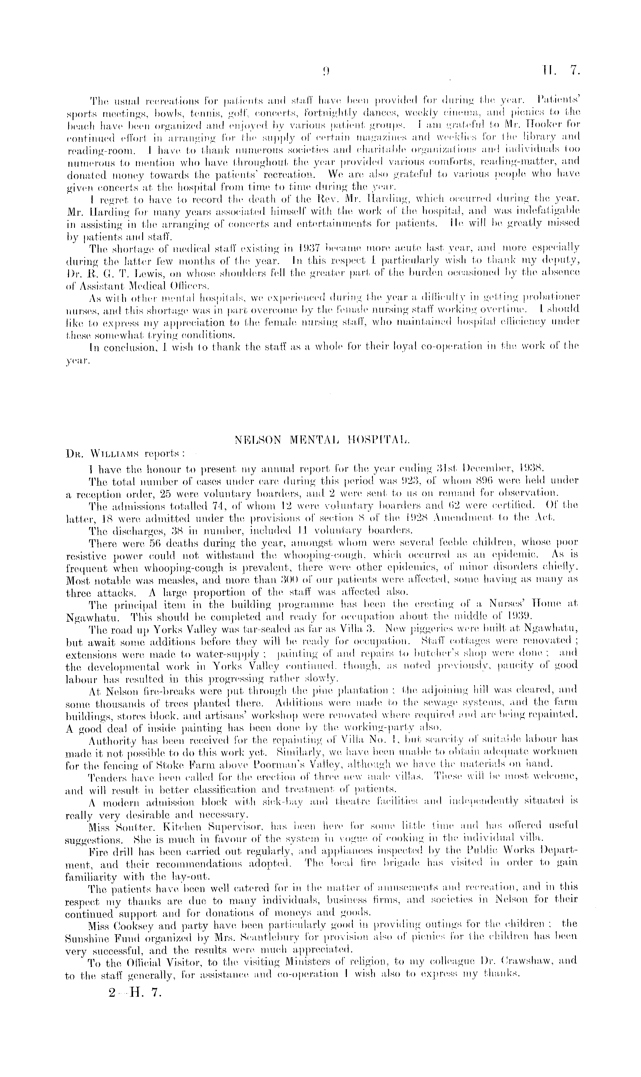 NELSON MENTAL HOSPITAL. Dr. Williams reports : — I have the honour to present my annual report for the year ending 31st December, 1938. The total number of cases under care during this period was 923, of whom 896 were held under a reception order, 25 were voluntary boarders, and 2 were sent to us on remand for observation. The admissions totalled 74, of whom 12 were voluntary boarders and 62 were certified. Of the latter, 18 were admitted under the provisions of section 8 of the 1928 Amendment to the Act. The discharges, 38 in number, included 11 voluntary boarders. There were 56 deaths during the year, amongst whom were several feeble children, whose poor resistive power could not withstand the whooping-cough, which occurred as an epidemic. As is frequent when whooping-cough is prevalent, there were other epidemics, of minor disorders chiefly. Most notable was measles, and more than 300 of oar patients were affected, some having as many as three attacks. A large proportion of the staff was affected also. The principal item in the building programme has been the erecting of a Nurses' Home at Ngawhatu. This should be completed and ready for occupation about the middle of 1939. The road up Yorks Valley was tar-sealed as far as Villa 3. New piggeries were built at Ngawhatu, but await some additions before they will be ready for occupation. Staff cottages were renovated ; extensions were made to water-supply ; painting of and repairs to butcher's shop were done ; and the developmental work in Yorks Valley continued, though, as noted previously, paucity of good labour has resulted in this progressing rather slowly. At Nelson fire-breaks were put through the pine plantation ; the adjoining hill was cleared, and some thousands of trees planted there. Additions were made to the sewage systems, and the farm buildings, stores block, and artisans' workshop were renovated where required and are being repainted. A good deal of inside painting has been done by the working-party also. Authority has been received for the repainting of Villa No. 1, but scarcity of suitable labour has made it not possible to do this work yet. Similarly, we have been unable to obtain adequate workmen for the fencing of Stoke Farm above Poorman's Valley, although we have the materials on hand. Tenders have been called for the erection of three new male villas. These will be most welcome, and will result in better classification and treatment of patients. A modern admission block with sick-bay and theatre facilities and independently situated is really very desirable and necessary. Miss Soutter, Kitchen Supervisor, has been here for some little time and has offered useful suggestions. She is much in favour of the system in vogue of cooking in the individual villa. Fire drill has been carried out regularly, and appliances inspected by the Public Works Department, and their recommendations adopted. The local fire brigade has visited in order to gain familiarity with the lay-out. The patients have been well catered for in the matter of amusements and recreation, and in this respect my thanks are due to many individuals, business firms, and societies in Nelson for their continued support and for donations of moneys and goods. Miss Cooksey and party have been particularly good in providing outings for the children ; the Sunshine Fund organized by Mrs. Scantlebury for provision also of picnics for the children has been very successful, and the results were much appreciated. To the Official Visitor, to the visiting Ministers of religion, to my colleague Dr. Crawshaw, and to the staff generally, for assistance and co-operation I wish also to express my thanks.