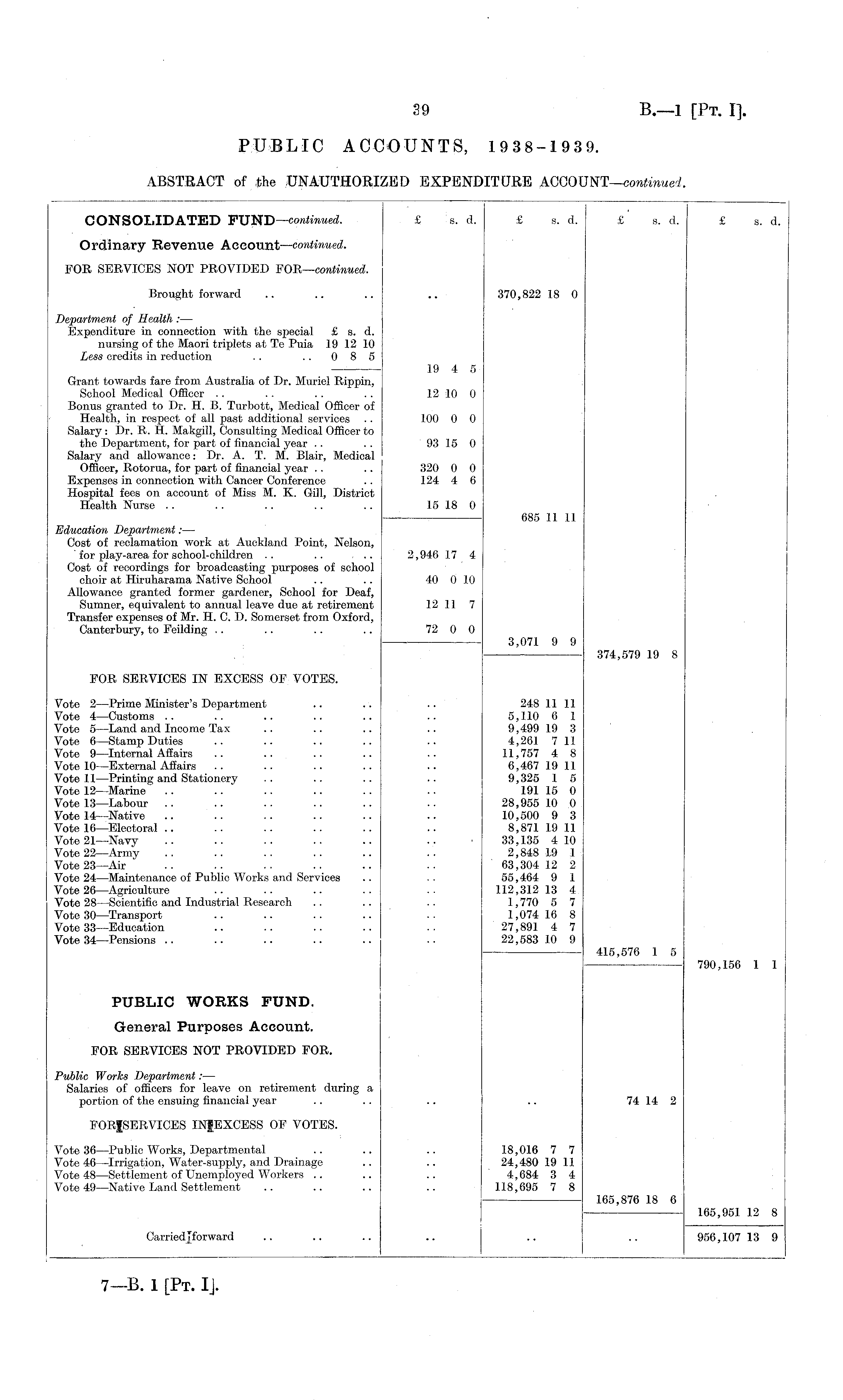 CONSOLIDATED FUND —continued. £ s. d. £ s. d. £ s. d. £ s. d. Ordinary Revenue Account—continued. FOR SERVICES NOT PROVIDED FOR—continued. Brought forward .. .. .. .. 370,822 18 0 Department of Health : — Expenditure in connection with the special £ s. d. nursing of the Maori triplets at Te Puia 19 12 10 Less credits in reduction .. . . 0 8 5 — 19 4 5 Grant towards fare from Australia of Dr. Muriel Rippin, School Medical Officer .. .. .. . . 12 10 0 Bonus granted to Dr. H. B. Turbott, Medical Officer of Health, in respect of all past additional services .. 100 0 0 Salary: Dr. R. H. Makgill, Consulting Medical Officer to the Department, for part of financial year .. .. 93 15 0 Salary and allowance: Dr. A. T. M. Blair, Medical Officer, Rotorua, for part of financial year .. .. 320 0 0 Expenses in connection with Cancer Conference .. 124 4 6 Hospital fees on account of Miss M. K. Gill, District Health Nurse .. . . .. .. .. 15 18 0 — 685 11 11 Education Department:— Cost of reclamation work at Auckland Point, Nelson, for play-area for school-children .. .. .. 2,946 17 4 Cost of recordings for broadcasting purposes of school choir at Hiruharama Native School . . .. 40 0 10 Allowance granted former gardener, School for Deaf, Sumner, equivalent to annual leave due at retirement 12 11 7 Transfer expenses of Mr. H. C. D. Somerset from Oxford, Canterbury, to Feilding .. .. .. .. 72 0 0 — 3,071 9 9 374,579 19 8 FOR SERVICES IN EXCESS OF VOTES. Vote 2 —Prime Minister's Department .. .. .. 248 11 11 Vote 4 —Customs .. .. .. .. .. .. 5,110 6 1 Vote 5—Land and Income Tax .. .. .. .. 9,499 19 3 Vote 6—Stamp Duties .. .. .. .. .. 4,261 7 11 Vote 9 —Internal Affairs .. .. .. .. .. 11,757 4 8 Vote 10—External Affairs .. .. .. .. .. 6,467 19 11 Vote II—Printing and Stationery .. .. .. .. 9,325 I 5 Vote 12—Marine .. .. .. .. .. .. 191 15 0 Vote 13 —Labour .. .. . . .. .. .. 28,955 10 0 Vote 14 —Native .. .. .. .. .. .. 10,500 9 3 Vote 16—Electoral .. .. .. .. .. .. 8,87119 11 Vote 21 —Navy .. .. .. .. .. .. 1 33,135 4 10 Vote 22—Army .. .. .. .. .. .. 2,848 1.9 1 Vote 23—Air .. .. .. .. .. .. 63,304 12 2 Vote 24—Maintenance of Public Works and Services .. .. 55,464 9 1 Vote 26—Agriculture .. .. .. .. .. 112,312 13 4 Vote 28—Scientific and Industrial Research .. .. .. 1,770 5 7 Vote 30 —Transport .. .. .. .. . ■ 1,074 16 8 Vote 33 —Education .. .. .. .. .. 27,891 4 7 Vote 34 —Pensions .. .. .. .. .. •• 22,583 109 415,576 1 5 790,156 1 1 PUBLIC WORKS FUND. General Purposes Account. FOR SERVICES NOT PROVIDED FOR. Public Works Department:— Salaries of officers for leave on retirement during a portion of the ensuing financial year .. .. .. .. 74 14 2 FORJSERVICES INJEXCESS OF VOTES. Vote 36 —Public Works, Departmental .. .. .. 18,016 7 7 Vote 46 —Irrigation, Water-supply, and Drainage .. .. 24,480 19 11 Vote 48—Settlement of Unemployed Workers .. .. .. 4,684 3 4 Vote 49—Native Land Settlement .. .. .. .. 118,695 7 8 165,876 18 6 165,951 12 8 Carried Jfor ward .. .. .. .. j .. .. 956,107 13 9