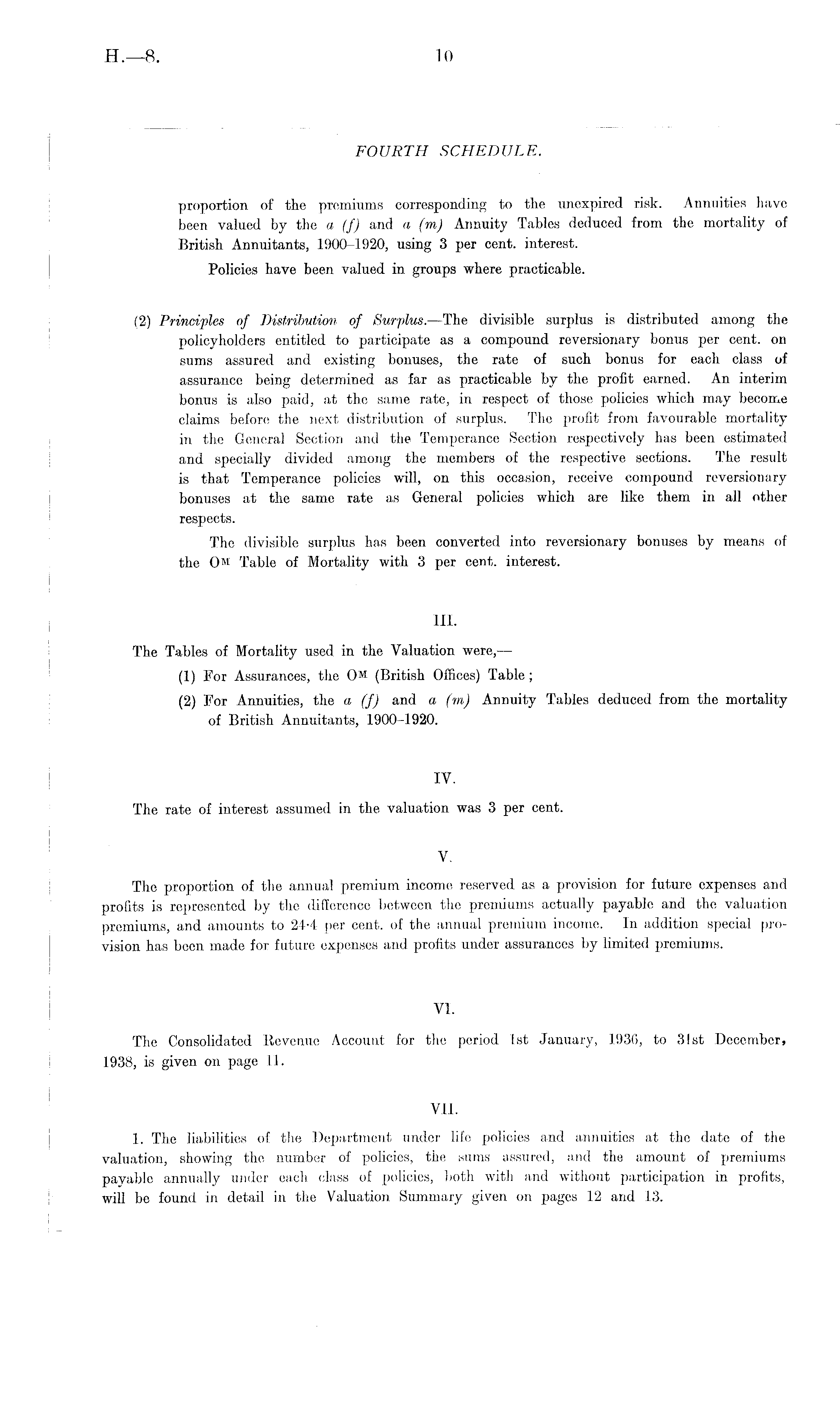 proportion of the premiums corresponding to the unexpired risk. Annuities have been valued by the a (f) and a (m) Annuity Tables deduced from the mortality of British Annuitants, 1900-1920, using 3 per cent, interest. Policies have been valued in groups where practicable. (2) Principles of Distribution of Surplus. —The divisible surplus is distributed among the policyholders entitled to participate as a compound reversionary bonus per cent, on sums assured and existing bonuses, the rate of such bonus for each class of assurance being determined as far as practicable by the profit earned. An interim bonus is also paid, at the same rate, in respect of those policies which may become claims before the next distribution of surplus. The profit from favourable mortality in the General Section and the Temperance Section respectively has been estimated and specially divided among the members of the respective sections. The result is that Temperance policies will, on this occasion, receive compound reversionary bonuses at the same rate as General policies which are like them in all other respects. The divisible surplus has been converted into reversionary bonuses by means of the Om Table of Mortality with 3 per cent, interest. 111. The Tables of Mortality used in the Valuation were, — (1) For Assurances, the 0 M (British Offices) Table; (2) For Annuities, the a (f) and a (m) Annuity Tables deduced from the mortality of British Annuitants, 1900-1920. IV. The rate of interest assumed in the valuation was 3 per cent. V. The proportion of the annual premium income reserved as a provision for future expenses and profits is represented by the difference between the premiums actually payable and the valuation premiums, and amounts to 24-4 per cent, of the annual premium income. In addition special provision has been made for future expenses and profits under assurances by limited premiums. VI. The Consolidated Revenue Account for the period Ist January, 1936, to 31st December, 1938, is given on page 11. VII. 1. The liabilities of the Department under life policies and annuities at the date of the valuation, showing the number of policies, the sums assured, and the amount of premiums payable annually under each class of policies, both with and without participation in profits, will be found in detail in the Valuation Summary given on pages 12 and 13.