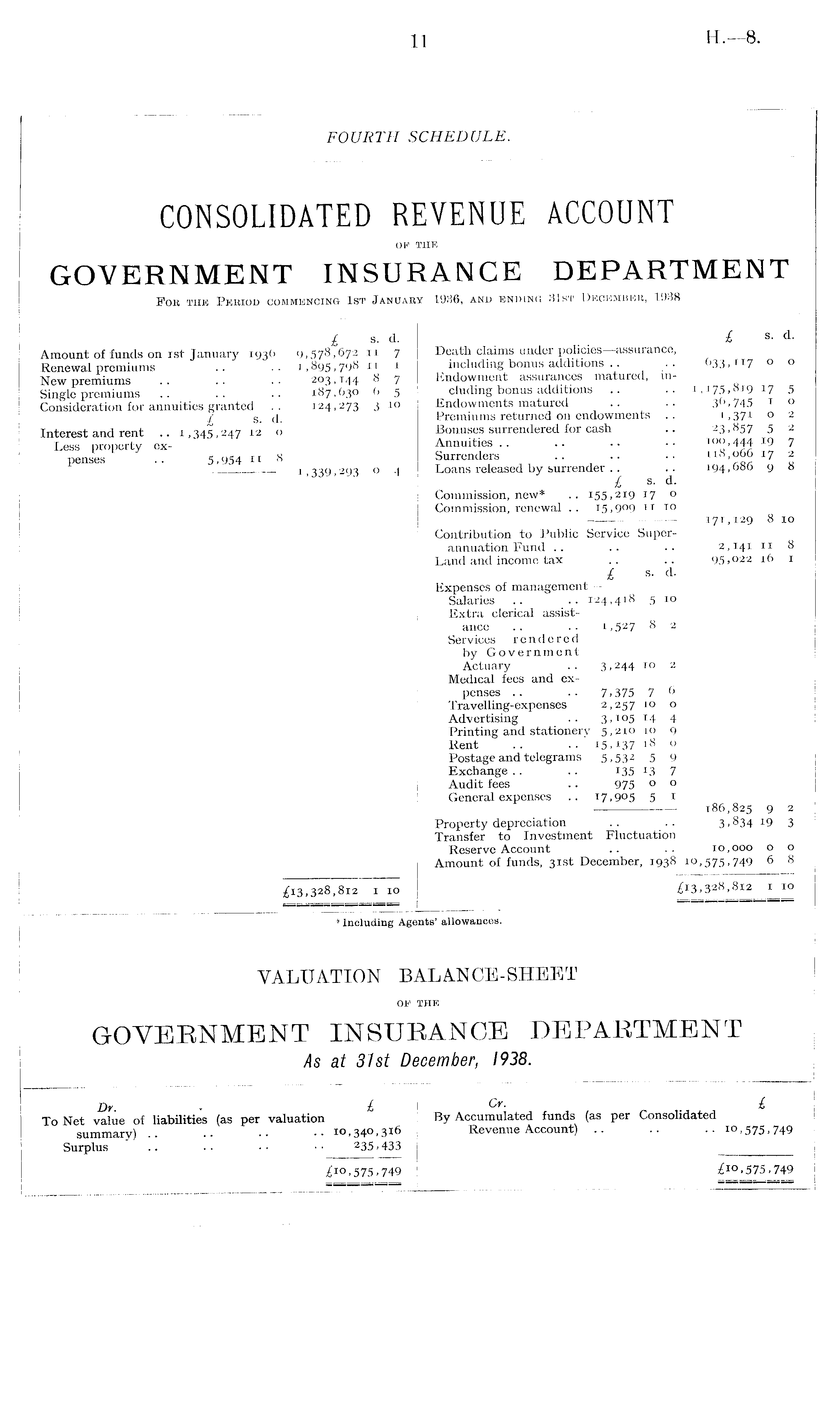 VALUATION BALANCE-SHEET OP THE GOVERNMENT INSURANCE DEPARTMENT As at 31st December, 1938. Dr. • £ Cr - £ To Net value of liabilities (as per valuation By Accumulated funds (as per Consolidated summary) .. .. •• ..10,340,316 Revenue Account) .. .. ..10,575,749 Surplus .. . • • • ■ ■ 235 , 433 _______ £1°>575.749