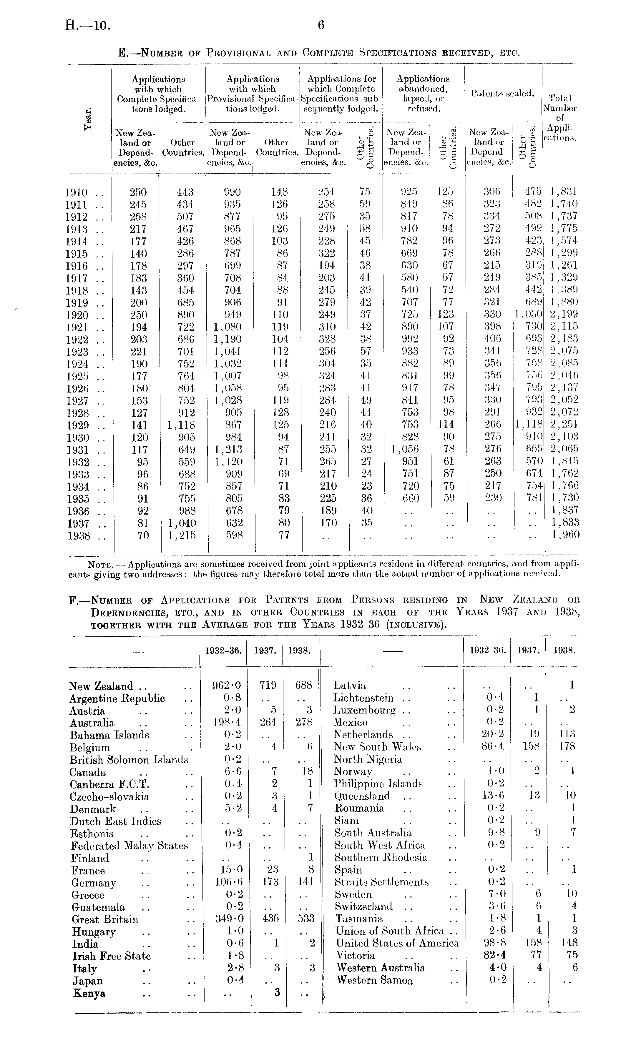 F. —Number of Applications for Patents from Persons residing in New Zealand or Dependencies, etc., and in other Countries in each of the Years 1937 and 1938, together with the Average for the Years 1932-36 (inclusive).