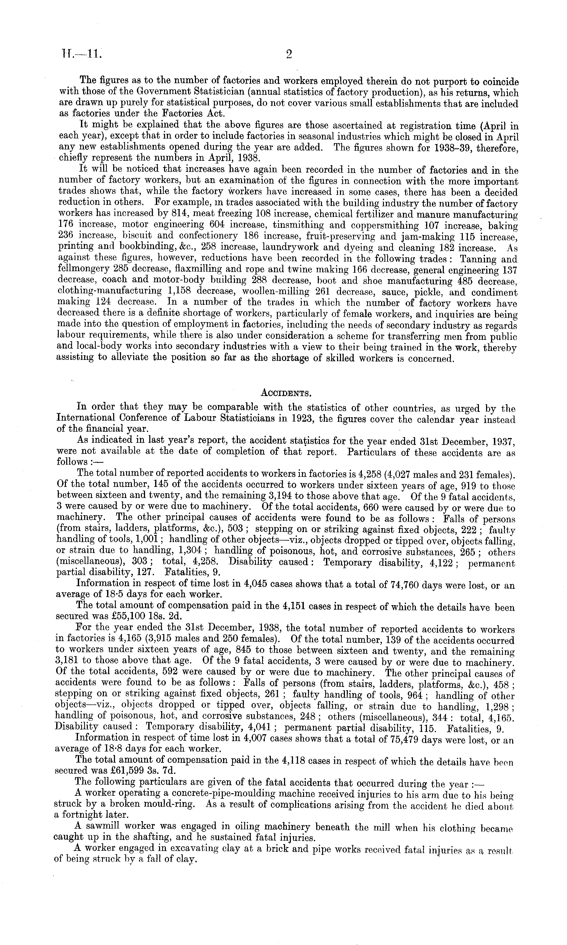 The figures as to the number of factories and workers employed therein do not purport to coincide with those of the Government Statistician (annual statistics of factory production), as his returns, which are drawn up purely for statistical purposes, do not cover various small establishments that are included as factories under the Factories Act. It might be explained that the above figures are those ascertained at registration time (April in each year), except that in order to include factories in seasonal industries which might be closed in April any new establishments opened during the year are added. The figures shown for 1938-39, therefore, chiefly represent the numbers in April, 1938. It will be noticed that increases have again been recorded in the number of factories and in the number of factory workers, but an examination of the figures in connection with the more important trades shows that, while the factory workers have increased in some cases, there has been a decided reduction in others. For example, in trades associated with the building industry the number of factory workers has increased by 814, meat freezing 108 increase, chemical fertilizer and manure manufacturing 176 increase, motor engineering 604 increase, tinsmithing and coppersmithing 107 increase, baking 236 increase, biscuit and confectionery 186 increase, fruit-preserving and jam-making 115 increase, printing and bookbinding, &0., 258 increase, laundrywork and dyeing and cleaning 182 increase. As against these figures, however, reductions have been recorded in the following trades : Tanning and fellmongery 285 decrease, flaxmilling and rope and twine making 166 decrease, general engineering 137 decrease, coach and motor-body building 288 decrease, boot and shoe manufacturing 485 decrease, clothing-manufacturing 1,158 decrease, woollen-milling 261 decrease, sauce, pickle, and condiment making 124 decrease. In a number of the trades in which the number of factory workers have decreased there is a definite shortage of workers, particularly of female workers, and inquiries are being made into the question of employment in factories, including the needs of secondary industry as regards labour requirements, while there is also under consideration a scheme for transferring men from public and local-body works into secondary industries with a view to their being trained in the work, thereby assisting to alleviate the position so far as the shortage of skilled workers is concerned. Accidents. In order that they may be comparable with the statistics of other countries, as urged by the International Conference of Labour Statisticians in 1923, the figures cover the calendar year instead of the financial year. As indicated in last year's report, the accident statistics for the year ended 31st December, 1937, were not available at the date of completion of that report. Particulars of these accidents are as follows :— The total number of reported accidents to workers in factories is 4,258 (4,027 males and 231 females). Of the total number, 145 of the accidents occurred to workers under sixteen years of age, 919 to those between sixteen and twenty, and the remaining 3,194 to those above that age.' Of the 9 fatal accidents, 3 were caused by or were due to machinery. Of the total accidents, 660 were caused by or were due to machinery. The other principal causes of accidents were found to be as follows : Falls of persons (from stairs, ladders, platforms, &c.), 503 ; stepping on or striking against fixed objects, 222 ; faulty handling of tools, 1,001; handling of other objects—viz., objects dropped or tipped over, objects falling, or strain due to handling, 1,304 ; handling of poisonous, hot, and corrosive substances, 265 ; others (miscellaneous), 303; total, 4,258. Disability caused: Temporary disability, 4,122; permanent partial disability, 127. Fatalities, 9. Information in respect of time lost in 4,045 cases shows that a total of 74,760 days wore lost, or an average of 18-5 days for each worker. The total amount of compensation paid in the 4,151 cases in respect of which the details have been secured was £55,100 18s. 2d. For the year ended the 31st December, 1938, the total number of reported accidents to workers in factories is 4,165 (3,915 males and 250 females). Of the total number, 139 of the accidents occurred to workers under sixteen years of age, 845 to those between sixteen and twenty, and the remaining 3,181 to those above that age. Of the 9 fatal accidents, 3 were caused by or were due to machinery. Of the total accidents, 592 were caused by or were due to machinery. The other principal causes of accidents were found to be as follows : Falls of persons (from stairs, ladders, platforms, &c.), 458 ; stepping on or striking against fixed objects, 261 ; faulty handling of tools, 964 ; handling of other objects—viz., objects dropped or tipped over, objects falling, or strain due to handling, 1,298 ; handling of poisonous, hot, and corrosive substances, 248 ; others (miscellaneous), 344 : total, 4,165. Disability caused : Temporary disability, 4,041 ; permanent partial disability, 115. Fatalities, 9. Information in respect of time lost in 4,007 cases shows that a total of 75,479 days were lost, or an average of 18-8 days for each worker. The total amount of compensation paid in the 4,118 cases in respect of which the details have been secured was £61,599 3s. 7d. The following particulars are given of the fatal accidents that occurred during the year A worker operating a concrete-pipe-moulding machine received injuries to his arm due to his being struck by a broken mould-ring. As a result of complications arising from the accident he died about a fortnight later. A sawmill worker was engaged in oiling machinery beneath the mill when his clothing became caught up in the shafting, and he sustained fatal injuries. A worker engaged in excavating clay at a brick and pipe works received fatal injuries as a result of bein
