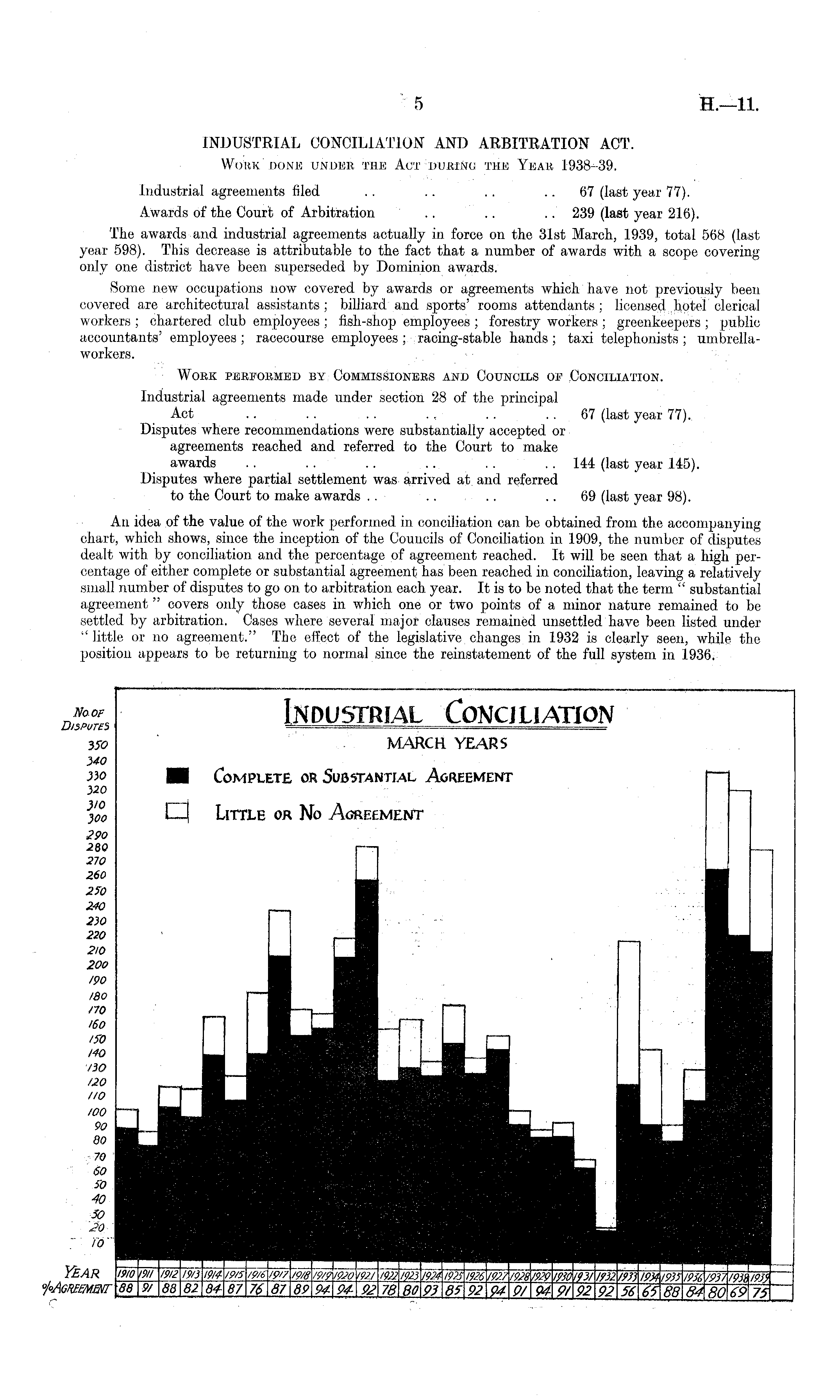 INDUSTRIAL CONCILIATION AND ARBITRATION ACT. Work done under the Act during the Year 1938 39. Industrial agreements filed .. .. .. 67 (last year 77). Awards of the Court of Arbitration .. .. .. 239 (last year 216). The awards and industrial agreements actually in force on the 31st March, 1939, total 568 (last year 598). This decrease is attributable to the fact that a number of awards with a scope covering only one district have been superseded by Dominion awards. Some new occupations now covered by awards or agreements which have not previously been covered are architectural assistants ; billiard and sports' rooms attendants ; licensed hotel clerical workers ; chartered club employees ; fish-shop employees ; forestry workers ; greenkeepers ; public accountants' employees ; racecourse employees ; racing-stable hands ; taxi telephonists ; umbrellaworkers. Work performed by Commissioners and Councils oe Conciliation. Industrial agreements made under section 28 of the principal Act .. .. .. ~ .. 67 (last year 77). Disputes where recommendations were substantially accepted or agreements reached and referred to the Court to make awards .. .. .. .. .. .. 144 (last year 145). Disputes where partial settlement was arrived at, and referred to the Court to make awards .. .. .. 69 (last year 98). An idea of the value of the work performed in conciliation can be obtained from the accompanying chart, which shows, since the inception of the Councils of Conciliation in 1909, the number of disputes dealt with by conciliation and the percentage of agreement reached. It will be seen that a high percentage of either complete or substantial agreement has been reached in conciliation, leaving a relatively small number of disputes to go on to arbitration each year. It is to be noted that the term " substantial agreement" covers only those cases in which one or two points of a minor nature remained to be settled by arbitration. Cases where several major clauses remained unsettled have been listed under " little or no agreement." The effect of the legislative changes in 1932 is clearly seen, while the position appears to be returning to normal since the reinstatement of the full system in 1936.