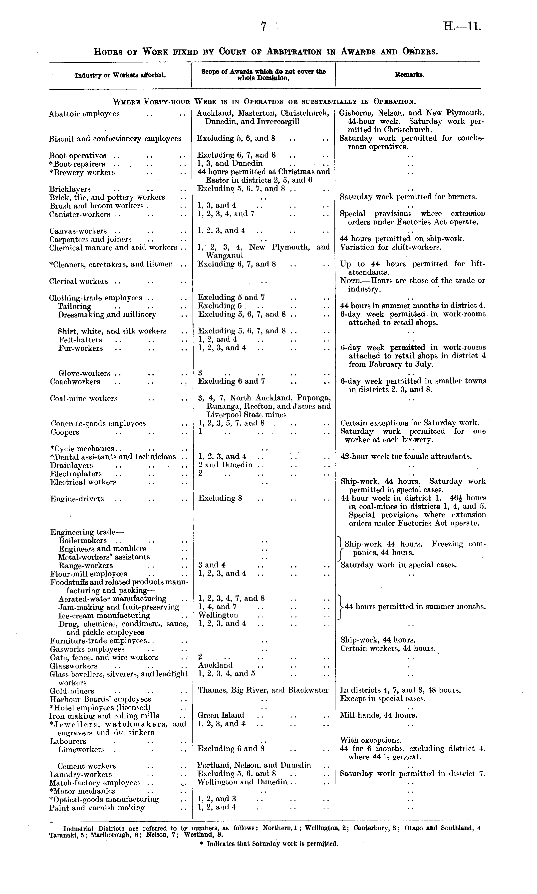 _ . . „ T , Scope of Awards which do not cover the Industry or Workers affected. wh0]e Dominion. Kemarks. Where Fobty-hotjr Week is in Operation or substantially in Operation. Abattoir employees .. .. Auckland, Masterton, Christehureh, Gisborne, Nelson, and New Plymouth, Dunedin, and Invercargill 44-hour week. Saturday work permitted in Christehureh. Biscuit and confectionery employees Excluding 6, (i, and 8 .. .. Saturday work permitted for concheroom operatives. Boot operatives .. .. .. Excluding 6, 7, and 8 * Boot-repairers .. .. 1, 3, and Dunedin * Brewery workers .. 44 hours permitted at Christmas and Easter in districts 2, 5, and 6 Bricklayers .. .. . • Excluding 5, 6, 7, and 8 .. Brick, tile, and pottery workers .. .. Saturday work permitted for burners. Brush and broom workers .. .. 1,3, and 4 Canister-workers .. .. 1, 2, 3, 4, and 7 .. .. Special provisions where extension orders under Factories Act operate. Canvas-workers .. .. .. 1, 2, 3, and 4 Carpenters and joinors .... .. 44 houra pormitted on ship-work. Chemical manure and acid workers .. 1, 2, 3, 4, New Plymouth, and Variation for shift-workers. Wanganui *Cleaners, caretakers, and liftmen .. Excluding 6, 7, and 8 .. .. Up to 44 hours permitted for 1 iftattendants. Clerical workers .. .. .. .. Note.—Hours are those of the trade or industry. Clothing-trade employees .. .. Excluding 5 and 7 Tailoring .. . • • • Excluding 5 .. .. 44 hours in summer months in district 4. Dressmaking and millinery .. Excluding 5, 6, 7, and 8 .. .. 6-day week permitted in work-rooms attached to retail shops. Shirt, white, and silk workers .. Excluding 5, 6, 7, and 8 .. Felt-hatters .. . • 1, 2, and 4 Fur-workers .. .. .. 1, 2, 3, and 4 .. .. 6-day week permitted in work-rooms attached to retail shops in district 4 from February to July. Glove-workers .. .. 3 .. .. ,. Coachworkers .. .. .. Excluding 6 and 7 .. .. 6-day week permitted in smaller towns in districts 2, 3, and 8. Coal-mine workers .. .. 3, 4, 7, North Auckland, Puponga, Runanga, Reef ton, and James and Liverpool State mines Concrete-goods employees .. 1, 2, 3, 5, 7, and 8 .. .. Certain oxccptions for Saturday work. Coopers .. .. 1 .. .. .. . • Saturday work permitted for one worker at each brewery. "Cycle mechanics...... "Dental assistants and technicians .. 1,2, 3, and 4 . . .. 42-hour week for female attendants. Drainlayers .. . . 2 and Dunedin Electroplaters .. .. 2 Electrical workers .. .. .. Ship-work, 44 hours. Saturday work permitted in special cases. Engine-drivers .. .. .. Excluding 8 .. .. .. 44-hour week in district 1. 46| hours in coal-mines in districts 1, 4, and 5. Special provisions where extension orders under Factories Act operate. Engineering trade — Boilermakers .. .. .. .. 1 Ship-work 44 hours. Freezing comEngmeers and moulders .. .. f panics, 44 hours. Metal-workers assistants .. .. J 1 Range-workers .. 3 and 4 .. .. .. Saturday work in special oases. Flour-mill employees .. .. 1, 2, 3, and 4 Foodstuffs and related products manufacturing and packing'— Aerated-water manufacturing .. 1, 2, 3, 4, 7, and 8 .. • • 1 Jam-making and fruit-preserving 1, 4, and 7 .. .. .. >44 hours permitted in summer months. Ice-cream manufacturing .. Wellington .. .. • • J Drug, chemical, condiment, sauce, 1, 2, 3, and 4 and pickle employees Furniture-trade employees.. .. . • Ship-work, 44 hours. Gasworks employees .. .. .. Certain workers, 44 hours. Gate, fence, and wire workers 2 Glassworkers .. . . .. Auckland Glass bevellers, silverers, and leadligbt 1,2, 3, 4, and 5 workers Gold-miners .. • • . . Thames, Big River, and Blackwater In districts 4, 7, and 8, 48 hours. Harbour Boards'employees .. .. Except in special cases. *Hotel employees (licensed) Iron making and rolling mills .. Green Island .. .. .. Mill-hands, 44 hours. "Jewellers, watchmakers, and 1, 2, 3, and 4 engravers and die sinkers Labourers .. .. .. • • With exceptions. Limeworkers .. .. . . Excluding 6 and 8 .. 44 for 6 months, excluding district 4, where 44 is general. Cement-workers .. .. Portland, Nelson, and Dunedin Laundry-workers .. •. Excluding 5, 6, and 8 .. .. Saturday work permitted in district 7. Match-factory employees .. ... Wellington and Dunedin .. "Motor mechanics .... * Optical-goods manufacturing .. 1, 2, and 3 Paint and varnish making . . 1,2, and 4 Industrial Districts arc referred to by numbers, as follows: Northern, 1; Wellington, 2; Canterbury, 8; Otago and Southland, 4 Taranikl, 5; Marlborough, 6; Nelson, 7; Wesfcland, 8. * Indicates that Saturday work is permitted.