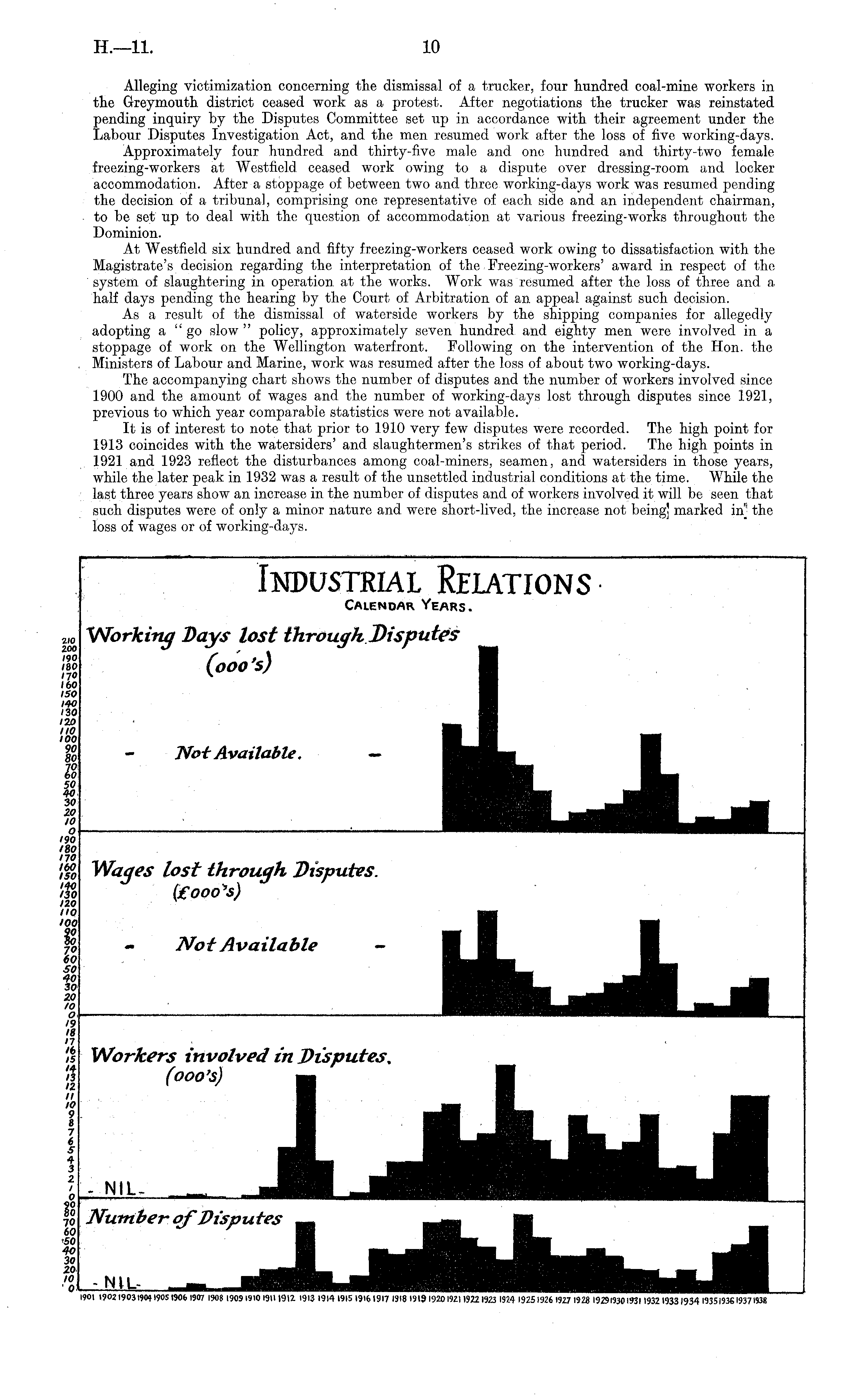 Alleging victimization concerning the dismissal of a trucker, four hundred coal-mine workers in the Greymouth district ceased work as a protest. After negotiations the trucker was reinstated pending inquiry by the Disputes Committee set up in accordance with their agreement under the Labour Disputes Investigation Act, and the men resumed work after the loss of five working-days. Approximately four hundred and thirty-five male and one hundred and thirty-two female freezing-workers at Westfield ceased work owing to a dispute over dressing-room and locker accommodation. After a stoppage of between two and three working-days work was resumed pending the decision of a tribunal, comprising one representative of each side and an independent chairman, to be set up to deal with the question of accommodation at various freezing-works throughout the Dominion. At Westfield six hundred and fifty freezing-workers ceased work owing to dissatisfaction with the Magistrate's decision regarding the interpretation of the Freezing-workers' award in respect of the system of slaughtering in operation at the works. Work was resumed after the loss of three and a half days pending the hearing by the Court of Arbitration of an. appeal against such decision. As a result of the dismissal of waterside workers by the shipping companies for allegedly adopting a "go slow " policy, approximately seven hundred and eighty men were involved in a stoppage of work on the Wellington waterfront. Following on the intervention of the Hon. the Ministers of Labour and Marine, work was resumed after the loss of about two working-days. The accompanying chart shows the number of disputes and the number of workers involved since 1900 and the amount of wages and the number of working-days lost through disputes since 192.1, previous to which year comparable statistics were not available. It is of interest to note that prior to 1910 very few disputes were recorded. The high point for 1913 coincides with the watersiders' and slaughtermen's strikes of that period. The high points in 1921 and 1923 reflect the disturbances among coal-miners, seamen, and watersiders in those years, while the later peak in 1932 was a result of the unsettled industrial conditions at the time. While the last three years show an increase in the number of disputes and of workers involved it will be seen that such disputes were of only a minor nature and were short-lived, the increase not being] marked in[' the loss of wages or of working-days.