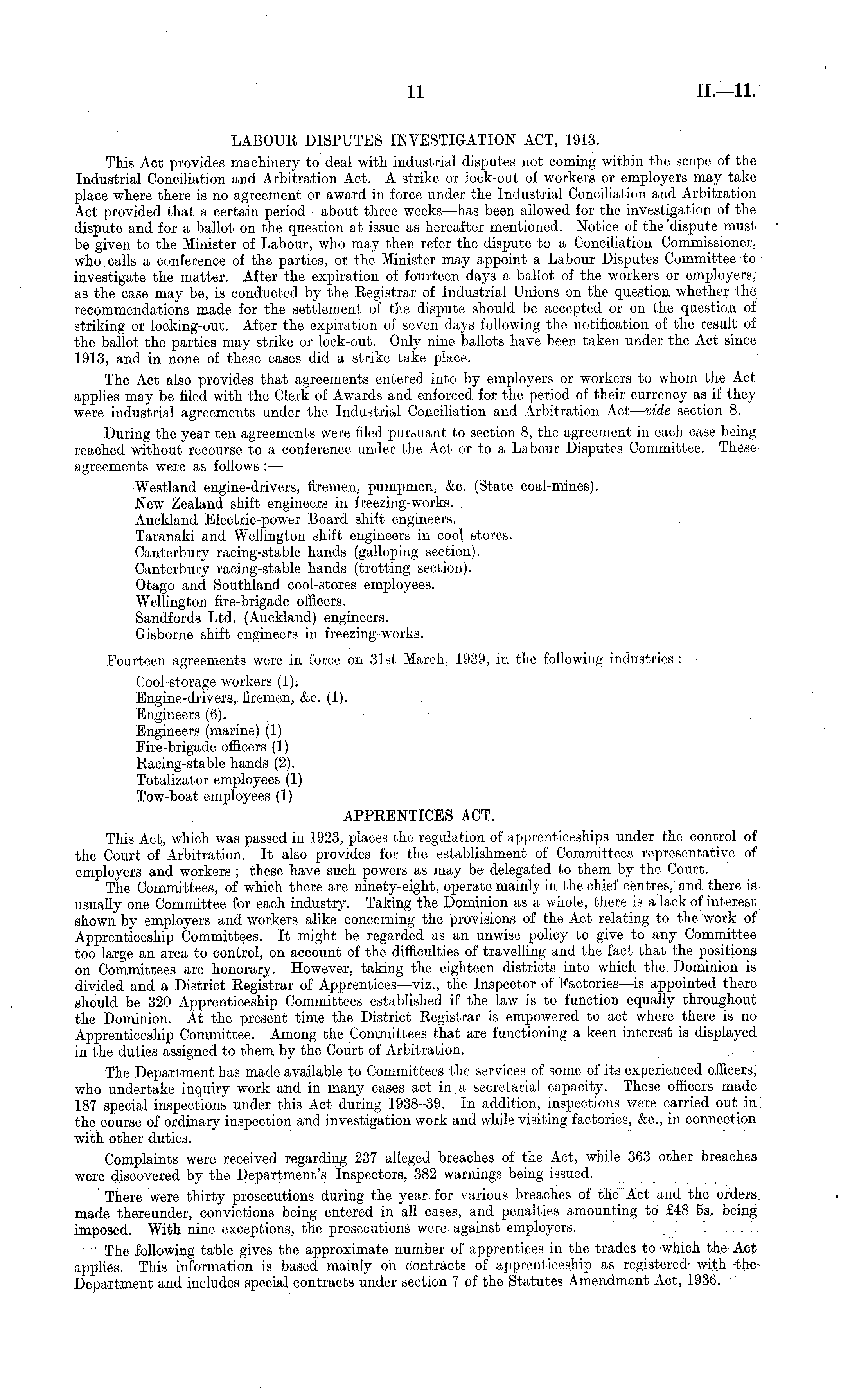 LABOUR DISPUTES INVESTIGATION ACT, 1913. This Act provides machinery to deal with industrial disputes not coming within the scope of the Industrial Conciliation and Arbitration Act. A strike or lock-out of workers or employers may take place where there is no agreement or award in force under the Industrial Conciliation and Arbitration Act provided that a certain period—about three weeks —has been allowed for the investigation of the dispute and for a ballot on the question at issue as hereafter mentioned. Notice of the dispute must be given to the Minister of Labour, who may then refer the dispute to a Conciliation Commissioner, who calls a conference of the parties, or the Minister may appoint a Labour Disputes Committee to investigate the matter. After the expiration of fourteen days a ballot of the workers or employers, as the case may be, is conducted by the Registrar of Industrial Unions on the question whether the recommendations made for the settlement of the dispute should be accepted or on the question of striking or locking-out. After the expiration of seven days following the notification of the result of the ballot the parties may strike or lock-out. Only nine ballots have been taken under the Act since; 1913, and in none of these cases did a strike take place. The Act also provides that agreements entered into by employers or workers to whom the Act applies may be filed with the Clerk of Awards and enforced for the period of their currency as if they were industrial agreements under the Industrial Conciliation and Arbitration Act —vide section 8. During the year ten agreements were filed pursuant to section 8, the agreement in each case being reached without recourse to a conference under the Act or to a Labour Disputes Committee. These agreements were as follows : — Westland engine-drivers, firemen, pumpmen, &c. (State coal-mines). New Zealand shift engineers in freezing-works. Auckland Electric-power Board shift engineers. Taranaki and Wellington shift engineers in cool stores. Canterbury racing-stable hands (galloping section). Canterbury racing-stable hands (trotting section). Otago and Southland cool-stores employees. Wellington fire-brigade officers. Sandfords Ltd. (Auckland) engineers. Gisborne shift engineers in freezing-works. Fourteen agreements were in force on 31st March, 1939, in the following industries : — Cool-storage workers (1). Engine-drivers, firemen, &c. (1). Engineers (6). Engineers (marine) (1) Fire-brigade officers (1) Racing-stable hands (2). Totalizator employees (1) Tow-boat employees (1) APPRENTICES ACT. This Act, which was passed in 1923, places the regulation of apprenticeships under the control of the Court of Arbitration. It also provides for the establishment of Committees representative of employers and workers ; these have such powers as may be delegated to them by the Court. The Committees, of which there are ninety-eight, operate mainly in the chief centres, and there is usually one Committee for each industry. Taking the Dominion as a whole, there is a lack of interest shown by employers and workers alike concerning the provisions of the Act relating to the work of Apprenticeship Committees. It might be regarded as an unwise policy to give to any Committee too large an area to control, on account of the difficulties of travelling and the fact that the positions on Committees are honorary. However, taking the eighteen districts into which the Dominion is divided and a District Registrar of Apprentices—viz., the Inspector of Factories —is appointed there should be 320 Apprenticeship Committees established if the law is to function equally throughout the Dominion. At the present time the District Registrar is empowered to act where there is no Apprenticeship Committee. Among the Committees that are functioning a keen interest is displayed in the duties assigned to them by the Court of Arbitration. The Department has made available to Committees the services of some of its experienced officers, who undertake inquiry work and in many cases act in a secretarial capacity. These officers made 187 special inspections under this Act during 1938-39. In addition, inspections were carried out in the course of ordinary inspection and investigation work and while visiting factories, &c., in connection with other duties. Complaints were received regarding 237 alleged breaches of the Act, while 363 other breaches were discovered by the Department's Inspectors, 382 warnings being issued. There were thirty prosecutions during the year for various breaches of the Act and the orders, made thereunder, convictions being entered in all cases, and penalties amounting to £48 ss. being imposed. With nine exceptions, the prosecutions were against employers. The following table gives the approximate number of apprentices in the trades to which the Act applies. This information is based mainly on contracts of apprenticeship as registered with theDepartment and includes special contracts under section 7 of the Statutes Amendment Act, 1936.