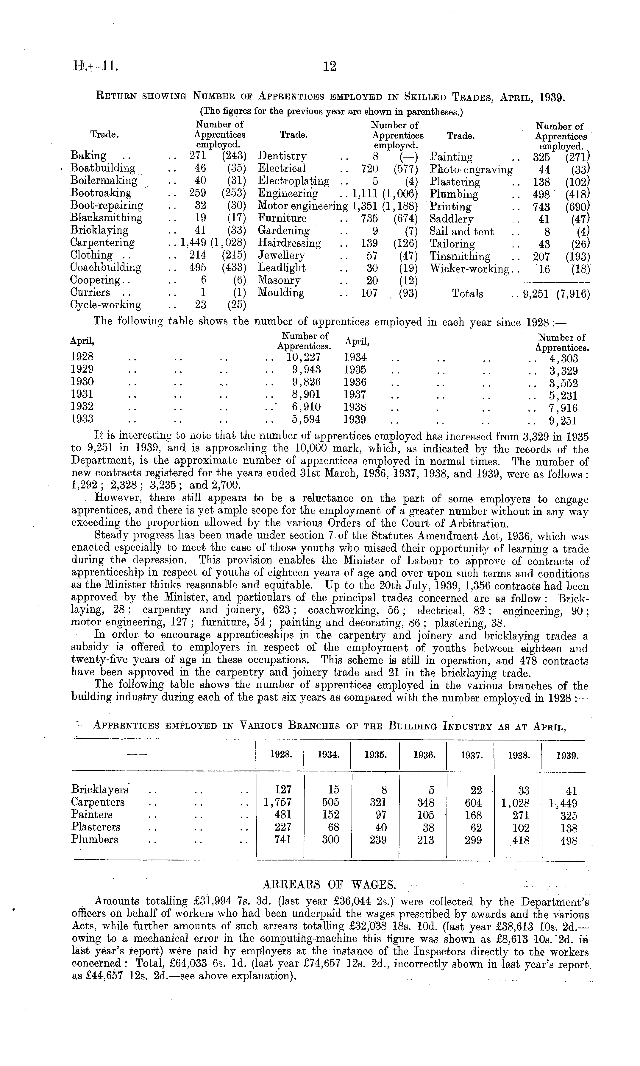 Return showing Number op Apprentices employed in Skilled Trades, April, 1939. (The figures for the previous year are shown in parentheses.) Number of Number of Number of Trade. Apprentices Trade. Apprentices Trade. Apprentices employed. employed. employed. Baking .. .. 271 (243) Dentistry .. 8 ( —) Painting .. 325 (271) Boatbuilding .. 46 (35) Electrical .. 720 (577) Photo-engraving 44 (33) Boilermaking .. 40 (31) Electroplating .. 5 (4) Plastering .. 138 (102) Bootmaking .. 259 (253) Engineering ..1,111(1,006) Plumbing .. 498 (418) Boot-repairing .. 32 (30) Motor engineering 1,351 (1,188) Printing .. 743 (690) Blacksmithing .. 19 (17) Furniture .. 735 (674) Saddlery .. 41 (47) Bricklaying .. 41 (33) Gardening .. 9 (7) Sail and tent .. 8 (4) Carpentering ..1,449 (1,028) Hairdressing .. 139 (126) Tailoring .. 43 (26) Clothing .. .. 214 (215) Jewellery .. 57 (47) Tinsmithing .. 207 (193) Coachbuilding .. 495 (433) Leadlight .. 30 (19) Wicker-working.. 16 (18) Coopering.. .. 6 (6) Masonry .. 20 (12) —— Curriers .. .. 1 (1) Moulding .. 107 (93) Totals .. 9,251 (7,916) Cycle-working .. 23 (25) The following table shows the number of apprentices employed in each year since 1928 :— Ami] Number of . .. Number of Pl ' Apprentices. Apnl> Apprentices. 1928 .. .. .. .. 10,227 1934 .. .. .. .. 4,303 1929 .. .. .. .. 9,943 1935 .. .. .. .. 3,329 1930 .. .. ... .. 9,826 1936 .. .. .. .. 3,552 1931 .. .. .. .. 8,901 1937 .. .. .. 5,231 1932 .. .. .. 6,910 1938 .. .. .. .. 7,916 1933 5,594 1939 .. 9,251 It is interesting to note that the number of apprentices employed has increased from 3,329 in 1935 to 9,251 in 1939, and is approaching the 10,000 mark, which, as indicated by the records of the Department, is the approximate number of apprentices employed in normal times. The number of new contracts registered for the years ended 31st March, 1936, 1937, 1938, and 1939, were as follows : 1,292; 2,328; 3,235; and 2,700. However, there still appears to be a reluctance on the part of some employers to engage apprentices, and there is yet ample scope for the employment of a greater number without in any way exceeding the proportion allowed by the various Orders of the Court of Arbitration. Steady progress has been made under section 7 of the - Statutes Amendment Act, 1936, which was enacted especially to meet the case of those youths who missed their opportunity of learning a trade during the depression. This provision enables the Minister of Labour to approve of contracts of apprenticeship in respect of youths of eighteen years of age and over upon such terms and conditions as the Minister thinks reasonable and equitable. Up to the 20th July, 1939, 1,356 contracts had been approved by the Minister, and particulars of the principal trades concerned are as follow : Bricklaying, 28; carpentry and joinery, 623; coachworking, 56; electrical, 82; engineering, 90; motor engineering, 127 ; furniture, 54 ; painting and decorating, 86 ; plastering, 38. In order to encourage apprenticeships in the carpentry and joinery and bricklaying trades a subsidy is offered to employers in respect of the employment of youths between eighteen and twenty-five years of age in these occupations. This scheme is still in operation, and 478 contracts have been approved in the carpentry and joinery trade and 21 in the bricklaying trade. The following table shows the number of apprentices employed in the various branches of the building industry during each of the past six years as compared with the number employed in 1928 : —
