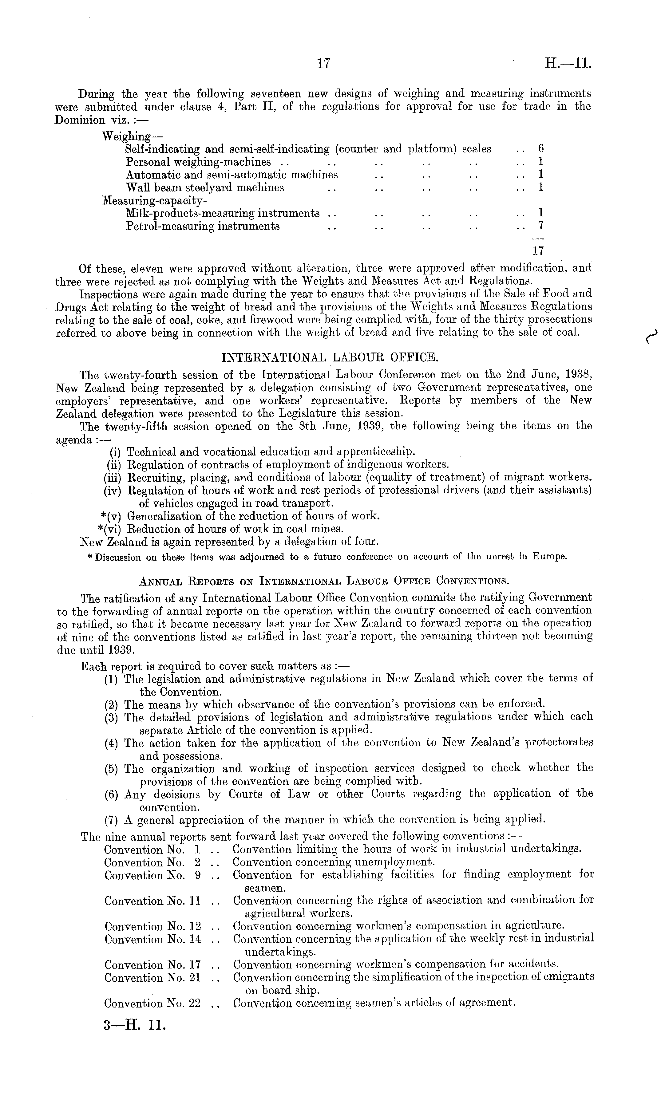 During the year the following seventeen new designs of weighing and measuring instruments were submitted under clause 4, Part 11, of the regulations for approval for use for trade in the Dominion viz.:— Weighing — Self-indicating and semi-self-indicating (counter and platform) scales .. 6 Personal weighing-machines .. .. .. .. .. .. 1 Automatic and semi-automatic machines .. .. .. 1 Wall beam steelyard machines .. .. .. .. .. 1 Measuring-capacity — Milk-products-measuring instruments .. .. . • . • 1 Petrol-measuring instruments .. .. .. • ■ .. 7 17 Of these, eleven were approved without alteration, three were approved after modification, and three were rejected as not complying with the Weights and Measures Act and Regulations. Inspections were again made during the year to ensure that the provisions of the Sale of Food and Drugs Act relating to the weight of bread and the provisions of the Weights and Measures Regulations relating to the sale of coal, coke, and firewood were being complied with, four of the thirty prosecutions referred to above being in connection with the weight of bread and five relating to the sale of coal. INTERNATIONAL LABOUR OFFICE. The twenty-fourth session of the International Labour Conference met on the 2nd June, 1938, New Zealand being represented by a delegation consisting of two Government representatives, one employers' representative, and one workers' representative. Reports by members of the New Zealand delegation were presented to the Legislature this session. The twenty-fifth session opened on the Bth June, 1939, the following being the items on the agenda : — (i) Technical and vocational education and apprenticeship. (ii) Regulation of contracts of employment of indigenous workers. (iii) Recruiting, placing, and conditions of labour (equality of treatment) of migrant workers. (iv) Regulation of hours of work and rest periods of professional drivers (and their assistants) of vehicles engaged in road transport. *(v) Generalization of the reduction of hours of work. *(vi) Reduction of hours of work in coal mines. New Zealand is again represented by a delegation of four. * Discussion on these items was adjourned to a future conference on account of the unrest in Europe. Annual Reports on International Labour Office Conventions. The ratification of any International Labour Office Convention commits the ratifying Government to the forwarding of annual reports on the operation within the country concerned of each convention so ratified, so that it became necessary last year for New Zealand to forward reports on the operation of nine of the conventions listed as ratified in last year's report, the remaining thirteen not becoming due until 1939. Each report is required to cover such matters as : — (1) The legislation and administrative regulations in New Zealand which cover the terms of the Convention. (2) The means by which observance of the convention's provisions can be enforced. (3) The detailed provisions of legislation and administrative regulations under which each separate Article of the convention is applied. (4) The action taken for the application of the convention to New Zealand's protectorates and possessions. (5) The organization and working of inspection services designed to check whether the provisions of the convention are being complied with. (6) Any decisions by Courts of Law or other Courts regarding the application of the convention. (7) A general appreciation of the manner in which the convention is being applied. The nine annual reports sent forward last year covered the following conventions : — Convention No. 1 .. Convention limiting the hours of work in industrial undertakings. Convention No. 2 .. Convention concerning unemployment. Convention No. 9 .. Convention for establishing facilities for finding employment for seamen. Convention No. 11 .. Convention concerning the rights of association and combination for agricultural workers. Convention No. 12 .. Convention concerning workmen's compensation in agriculture. Convention No. 14 .. Convention concerning the application of the weekly rest in industrial undertakings. Convention No. 17 .. Convention concerning workmen's compensation for accidents. Convention No. 21 .. Convention concerning the simplification of the inspection of emigrants on board ship. Convention No. 22 ~ Convention concerning seamen's articles of agreement.