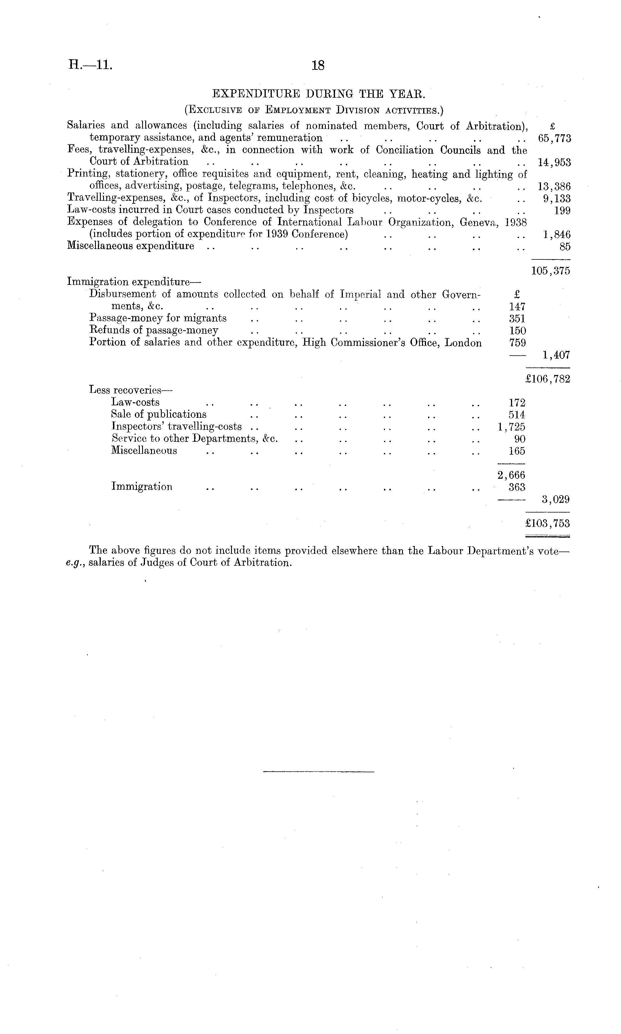 EXPENDITURE DURING THE YEAR. (Exclusive of Employment Division activities.) Salaries and allowances (including salaries of nominated members, Court of Arbitration), £ temporary assistance, and agents' remuneration .. .. .. .. .. 65,773 Fees, travelling-expenses, &c., in connection with work of Conciliation Councils and the Court of Arbitration .. .. .. .. .. .. .. .. 14,953 Printing, stationery, office requisites and equipment, rent, cleaning, heating and lighting of offices, advertising, postage, telegrams, telephones, &c. .. .. .. .. 13,386 Travelling-expenses, &c., of Inspectors, including cost of bicycles, motor-cycles, &c. .. 9,133 Law-costs incurred in Court cases conducted by Inspectors .. .. .. .. 199 Expenses of delegation to Conference of International Labour Organization, Geneva, 1938 (includes portion of expenditure for 1939 Conference) .. .. .. .. 1,846 Miscellaneous expenditure .. .. .. .. .. .. .. .. 85 105,375 Immigration expenditure— Disbursement of amounts collected on behalf of Imperial and other Govern- £ ments, &c. .. .. .. . . .. . . .. 147 Passage-money for migrants .. .. .. .. .. .. 351 Refunds of passage-money .. .. .. .. .. .. 150 Portion of salaries and other expenditure, High Commissioner's Office, London 759 1,407 £106,782 Less recoveries— Law-costs .. .. .. .. .. .. .. 172 Sale of publications .. .. .. .. .. .. 514 Inspectors'travelling-costs .. .. .. .. .. .. 1,725 Service to other Departments, &c. .. .. .. .. .. 90 Miscellaneous .. .. .. .. .. .. .. 165 2,666 Immigration .. .. .. .. .. .. .. 363 3,029 £103,753 The above figures do not include items provided elsewhere than the Labour Department's vote — e.g., salaries of Judges of Court of Arbitration.