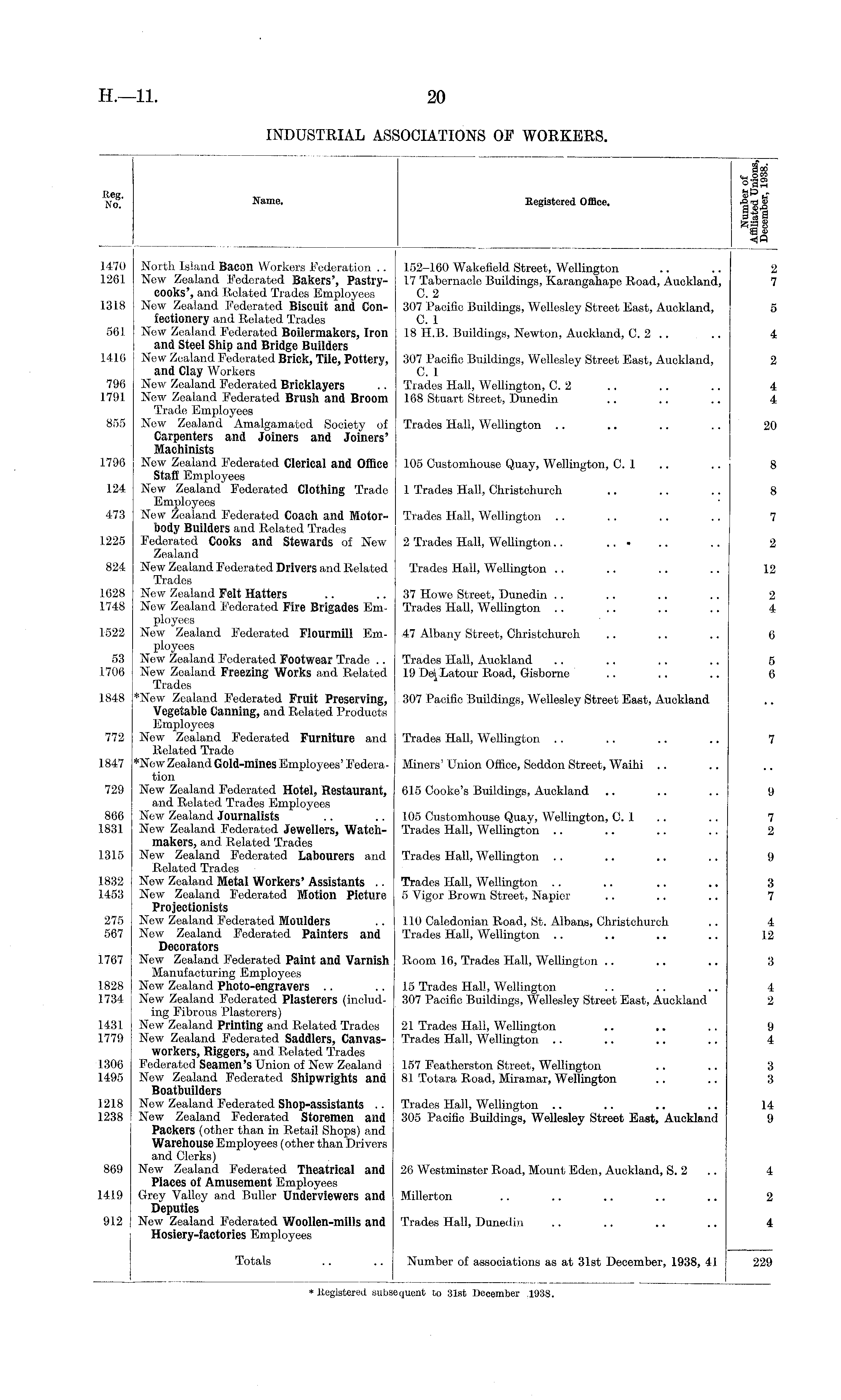 1m' °*as ffo.' Name, Registered Office. 'a'Sii II a ® j; Q — i " 1470 North Island Bacon Workers Federation .. 152-160 Wakefield Street, Wellington .. .. 2 1261 New Zealand Federated Bakers', Pastry- 17 Tabernacle Buildings, Karangahape Road, Auckland, 7 cooks', and Related Trades Employees C. 2 1318 New Zealand Federated Biscuit and Con- 307 Pacific Buildings, Wellesley Street East, Auckland, 5 fectionery and Related Trades C. 1 561 New Zealand Federated Boilermakers, Iron 18 II.B. Buildings, Newton, Auckland, C. 2 .. .. 4 and Steel Ship and Bridge Builders 1416 New Zealand Federated Brick, Tile, Pottery, 307 Pacific Buildings, Wellesley Street East, Auckland, 2 and Clay Workers 0. 1 796 New Zealand Federated Bricklayers .. Trades Hall, Wellington, C. 2 .. .. .. 4 1791 New Zealand Federated Brush and Broom 168 Stuart Street, Dunedin .. .. .. 4 Trade Employees 855 New Zealand Amalgamated Society of Trades Hall, Wellington .. .. .. .. 20 Carpenters and Joiners and Joiners' Machinists 1796 Now Zealand Federated Clerical and Ofiice 105 Customhouse Quay, Wellington, C. 1 .. .. 8 Stall Employees 124 New Zealand Federated Clothing Trade 1 Trades Hall, Christchurch .. .. .. 8 Employees 473 New Zealand Federated Coach and Motor- Trades Hall, Wellington .. .. .. .. 7 body Builders and Related Trades 1225 Federated Cooks and Stewards of New 2 Trades Hall, Wellington.. .. • .. .. 2 Zealand 824 New Zealand Federated Drivers and Related Trades Hall, Wellington .. .. .. .. 12 Trades 1628 New Zealand Felt Hatters .. 37 Howe Street, Dunedin . . .. .. .. 2 1748 New Zealand Federated Fire Brigades Em- Trades Hall, Wellington .. .. .. .. 4 ployees 1522 New Zealand Federated Flourmill Em- 47 Albany Street, Christchurch .. .. .. 6 ployees 53 New Zealand Federated Footwear Trade .. Trades Hall, Auckland .. .. .. .. 5 1706 New Zealand Freezing Works and Related 19 Dei Latour Road, Gisborne .. .. .. 6 Trades 1848 *New Zealand Federated Fruit Preserving, 307 Pacific Buildings, Wellesley Street East, Auckland Vegetable Canning, and Related Products Employees 772 Now Zealand Federated Furniture and Trades Hall, Wellington .. .. .. .. 7 Related Trade 1847 *New Zealand Gold-mines Employees'Federa- Miners' Union Office, Seddon Street, Waihi .. tion 729 New Zealand Federated Hotel, Restaurant, 615 Cooke's Buildings, Auckland .. .. .. 9 and Related Trades Employees 866 New Zealand Journalists .. .. 105 Customhouse Quay, Wellington, C. 1 .. 7 1831 New Zealand Federated Jewellers, Watch- Trades Hall, Wellington .... .. .. 2 makers, and Related Trades 1315 New Zealand Federated Labourers and Trades Hall, Wellington .. .. .. .. 9 Related Trades 1832 New Zealand Metal Workers' Assistants .. Trades Hall, Wellington .. .. .. .. 3 1453 New Zoaland Federated Motion Picture 5 Vigor Brown Street, Napier .. .. .. 7 Projectionists 275 New Zealand Federated Moulders .. 110 Caledonian Road, St. Albans, Christchurch .. 4 567 New Zealand Federated Painters and Trades Hall, Wellington .. .. .. .. 12 Decorators 1767 New Zealand Federated Paint and Varnish Room 16, Trades Hall, Wellington .. .. .. 3 Manufacturing Employees 1828 Now Zealand Photo-engravers .. 15 Trades Hall, Wellington .. .. .. 4 1734 New Zealand Federated Plasterers (includ- 307 Pacific Buildings, Wellesley Street East, Auckland 2 ing Fibrous Plasterers) 1431 New Zealand Printing and Related Trades 21 Trades Hall, Wellington .. .. .. 9 1779 New Zealand Federated Saddlers, Canvas- Trades Hall, Wellington .. .. .. .. 4 workers, Riggers, and Related Trades 1306 Federated Seamen's Union of New Zealand 157 Featherston Street, Wellington .. .. 3 1495 New Zealand Federated Shipwrights and 81 Totara Road, Miramar, Wellington .. .. 3 Boatbuilders 1218 New Zealand Federated Shop-assistants .. Trades Hall, Wellington .. .. .. .. 14 1238 New Zealand Federated Storemen and 305 Pacific Buildings, Wellesley Street East, Auckland 9 Packers (other than in Retail Shops) and Warehouse Employees (other than Drivers and Clerks) 869 New Zealand Federated Theatrical and 26 Westminster Road, Mount Eden, Auckland, S. 2 4 Places of Amusement Employees 1419 Grey Valley and Buller Underviewers and Millerton .. .. .. .. .. 2 Deputies 912 New Zealand Federated Woollen-mills and Trades Hall, Dunedin .. .. .. .. 4 Hosiery-factories Employees Totals .. .. | Number of associations as at 31st December, 1938, 41 229 * .Registered subsequent to 31st December 1938.