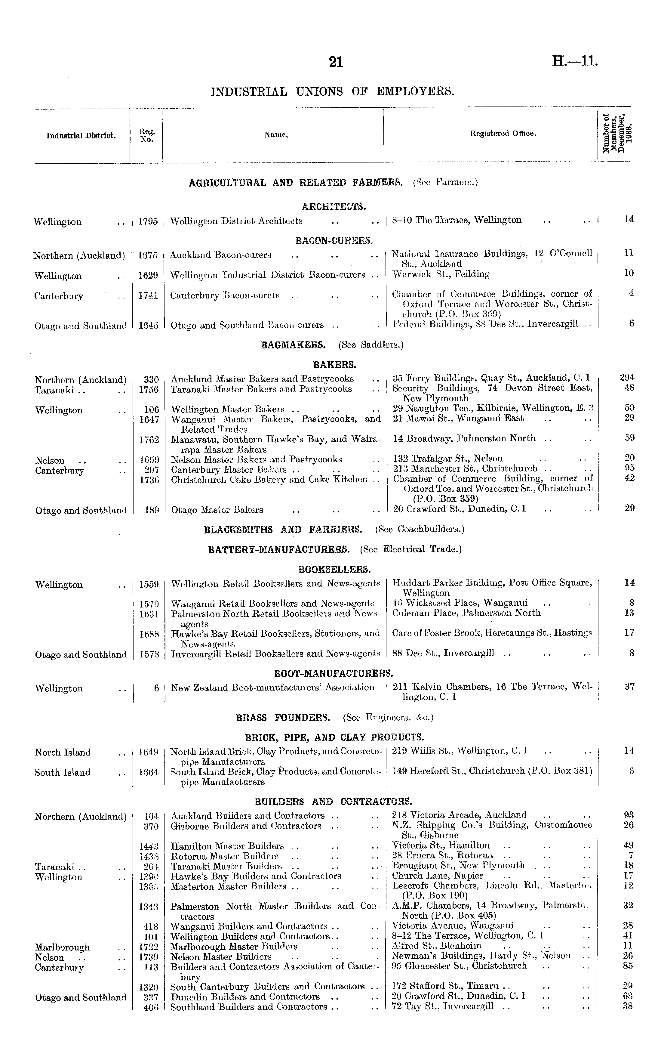 •SgSf _ o "9 co Industrial District. ™l g * Name. Registered 0 ffice. •§ I i S No - ||s ri AGRICULTURAL AND RELATED FARMERS. (See Farmers.) ARCHITECTS. Wellington .. | 1795 | Wellington District Architects .. .. | 8-10 The Torrace, Wellington .. .. I 14 BACON-CURERS. Northern (Auckland) 1675 Auckland Bacon-curers .. .. .. National Insurance Buildings, 12 O'Connell 11 St., Auckland Wellington . 1629 Wellington Industrial District Bacon-curers . . Warwick St., Feilding 10 Canterbury . . 1741 Canterbury Bacon-curers .. .. Chamber of Commerce Buildings, corner of 4 Oxford Terrace and Worcester St., Christchurch (P.O. Box 359) Otago and Southland 1645 Otago and Southland Baeon-curers .. .. Federal Buildings, 88 Dee St., Invercargill . . 6 BAGMAKERS. (See Saddlers.) BAKERS. Northern (Auckland) 330 Auckland Master Bakers and Pastrycooks .. 35 Ferry Buildings, Quay St., Auckland, C. 1 294 Taranaki .. .. 1756 Taranaki Master Bakers and Pastrycooks .. Security Buildings, 74 Devon Street East, 48 New Plymouth Wellington . . 106 Wellington Master Bakers .. .. .. 29 Naughton Tee., Kilbirnie, Wellington, E. 3 50 1647 Wanganui Master Bakers, Pastrycooks, and 21 Mawai St., Wanganui East .. . . 29 Related Trades 1762 Manawatu, Southern Hawke's Bay, and Waira- 14 Broadway, Palmerston North .. .. 59 rapa Master Bakers Nelson .. . . 1659 Nelson Master Bakers and Pastrycooks . 132 Trafalgar St., Nelson .. .. 20 Canterbury .. 297 Canterbury Master Bakers .. .. 213 Manchester St., Christchurch .. .. 95 1736 Christchurch Cake Bakery and Cake Kitchen .. Chamber of Commerce Building, corner of 42 Oxford Tee. and Worcester St., Christchurch (P.O. Box 359) Otago and Southland 189 Otago Master Bakers .. .. .. 20 Crawford St., Dunedin, C. 1 .. . . 29 BLACKSMITHS AND FARRIERS. (See Coachbuilders.) BATTERY-MANUFACTURERS. (See Electrical Trade.) BOOKSELLERS. Wellington .. 1559 Wellington Retail Booksellers and News-agents Huddart Parker Building, Post Office Square, 14 Wellington 1579 Wanganui Retail Booksellers and News-agents 16 Wiclcsteed Place, Wanganui .. 8 1631 Palmerston North Retail Booksellers and News- Coleman Place, Palmerston North 13 agents J 688 Hawke's Bay Retail Booksellers, Stationers, and Care of Foster Brook, Heretaunga St., Hastings 17 News-agents Otago and Southland 1578 Invercargill Retail Booksellers and News-agents 88 Dee St., Invercargill .. .. . . 8 BOOT-MANUFACTURERS. Wellington .. [ 6 1 New Zealand Boot-manufacturers' Association | 211 Kelvin Chambers, 16 The Terrace, Wei- 37 | 1 lington, C. 1 i BRASS FOUNDERS. (See Engineers, &c.) BRICK, PIPE, AND CLAY PRODUCTS. North Island .. 1649 I North Island Brick, Clay Products, and Concrete- 219 Willis St., Wellington, C. 1 .. .. 14 pipe Manufacturers South Island .. 1664 South Island Brick, Clay Products, and Concrete- 149 Hereford St., Christchurch (P.O. Box 381) 6 pipo Manufacturers BUILDERS AND CONTRACTORS. Northern (Auckland) 164 Auckland Builders and Contractors .. . . 218 Victoria Arcade, Auckland .. .. 93 370 Gisborne Builders and Contractors .. .. N.Z. Shipping Co.'s Building, Customhouse 26 St., Gisborne 1443 Hamilton Master Builders .. .. .. Victoria St., Hamilton .. .. . . 49 1438 Rotorua Master Builders .. .. .. 28 Eruera St., Rotorua . . .. . . 7 Taranaki .. .. 204 Taranaki Master Builders .. .. .. Brougham St., New Plymouth .. 18 Wellington . . 1390 Hawke's Bay Builders and Contractors . Church Lane, Napier . . . . 17 1385 Masterton Master Builders .. .. .. Leecroft Chambers, Lincoln Rd„ Masterton 12 (P.O. Box 190) 1343 Palmerston North Master Builders and Con- A.M.P. Chambers, 14 Broadway, Palmerston 32 tractors North (P.O. Box 405) 418 Wanganui Builders and Contractors .. .. Victoria Avenue, Wanganui .. .. 28 101 Wellington Builders and Contractors.. .. 8-12 The Terrace, Wellington, C. 1 .. 41 Marlborough .. 1722 Marlborough Master Builders .. .. Alfred St., Blenheim .. .. .. 11 Nelson . . . . 1739 Nelson Master Builders .. .. Newman's Buildings, Hardy St., Nelson . . 26 Canterbury .. 113 Builders and Contractors Association of Canter- 95 Gloucester St., Christchurch .. . . 85 bury 1320 South Canterbury Builders and Contractors .. 172 Stafford St., Timaru .. .. .. 29 Otago and Southland 337 Dunedin Builders and Contractors .. .. 20 Crawford St., Dunedin, C. 1 .. 68 406 Southland Builders and Contractors .. 72 Tay St., Invercargill .. .. .. 38