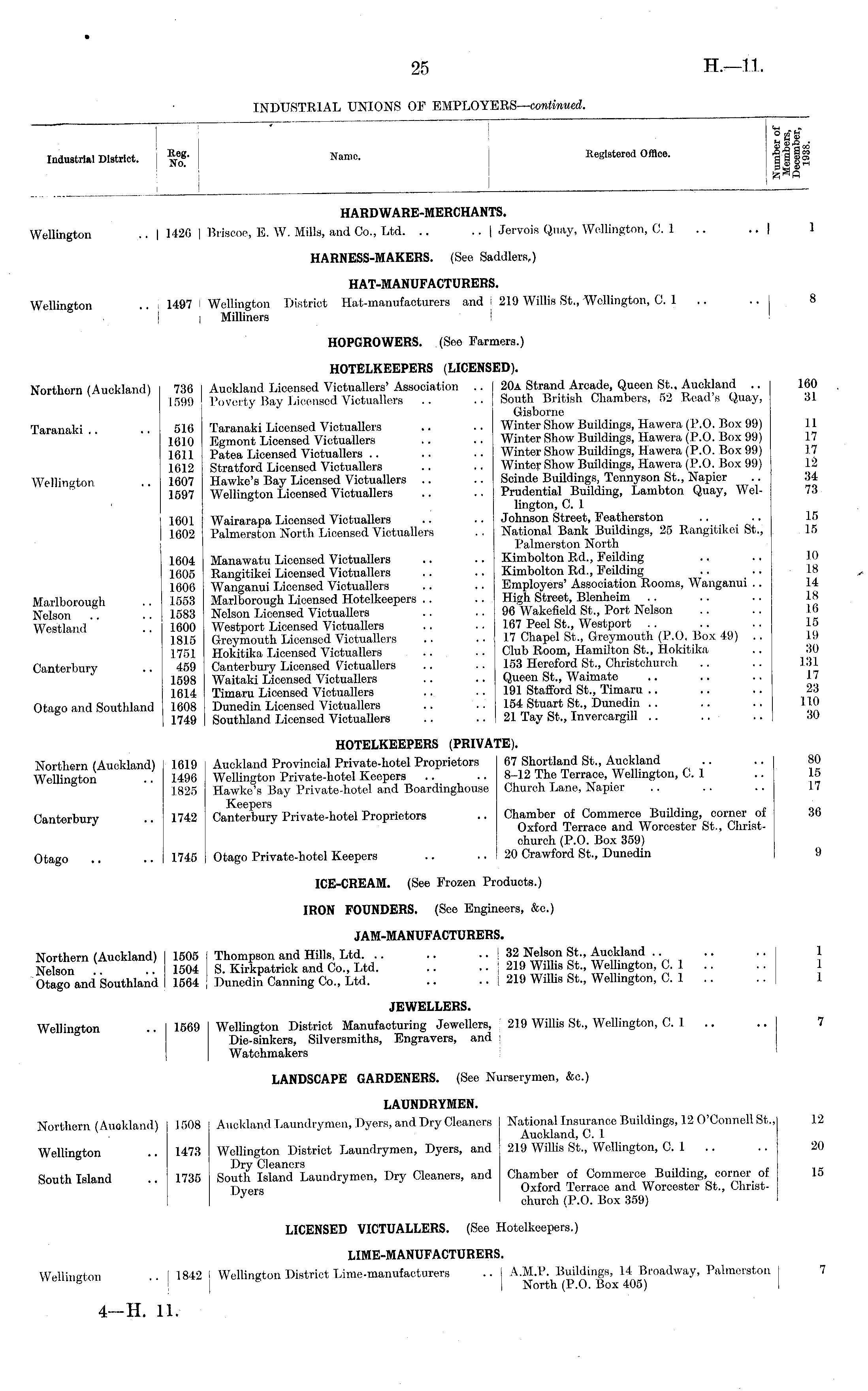I ° _ Industrial District. Name. Registered Office. !|||| ; HARDWARE-MERCHANTS. Wellington .. | 1426 | Briscoe, E. W. Mills, and Co., Ltd. .. .. | Jervois Quay, Wellington, C. 1 .. ..| 1 HARNESS-MAKERS. (See Saddlers,) HAT-MANUFACTURERS. Wellington .. 1497 Wellington District Hat-manufacturers and 219 Willis St., Wellington, C. 1 .. .. j 8 | | Milliners HOPGROWERS. (See Farmers.) HOTELKEEPERS (LICENSED). Northern (Auckland) 736 I Auckland Licensed Victuallers' Association .. 20a Strand Arcade, Queen St., Auckland .. 160 1599 Povcrtv Bav Licensed Victuallers .. .. South British Chambers, 52 Reads Quay, .11 Gisborne Taranaki .. 516 Taranaki Licensed Victuallers .. .. Winter Show Buildings, Hawera (P.O. Box 99) 11 1610 Egmont Licensed Victuallers .. .. Winter Show Buildings, Hawera (P.O. Box 99) 17 1611 Patea Licensed Victuallers .. .. .. Winter Show Buildings, Hawera (P.O. Box 99) 17 1612 Stratford Licensed Victuallers .. . • Winter Show Buildings, Hawera (P.O. Box 99) 12 Wellington .. 1607 Hawke's Bay Licensed Victuallers .. .. Scinde Buildings, Tennyson St., Napier .. 34 1597 Wellington Licensed Victuallers .. .. Prudential Building, Lambton Quay, Wei- 73 lington, C. 1 1601 Wairarapa Licensed Victuallers .. .. Johnson Street, Featherston .. .. 15 1602 Palmerston North Licensed Victuallers .. National Bank Buildings, 25 Rangitikei St., 15 Palmerston North 1604 Manawatu Licensed Victuallers .. .. Kimbolton Rd., Feilding .. .. 10 1605 Rangitikei Licensed Victuallers .. .. Kimbolton Rd., Feilding 1606 Wanganui Licensed Victuallers .. .. Employers' Association Rooms, Wanganui .. 14 Marlborough .. 1553 Marlborough Licensed Hotelkeepers .. .. High Street, Blenheim Nelson .. .. 1583 Nelson Licensed Victuallers .. 96 Wakefield St., Port Nelson .. .. 16 Westland .. 1600 Westport Licensed Victuallers .. .. 167 Peel St., Westport •• •• •• J 815 Greymouth Licensed Victuallers .. 17 Chapel St., Greymouth (1.(). Box 4-9) 1751 Hokitika Licensed Victuallers .. .. Club Room, Hamilton St.. Hokitika .. 30 Canterbury .. 459 Canterbury Licensed Victuallers .. ■■ 153 Hereford St., Christchurch .. .. 131 1598 Waitaki Licensed Victuallers .. .. Queen St., Waimate .. .. .. 17 1614 Timaru Licensed Victuallers .. • ■ 191 Stafford St., Timaru .. . • • -•> Otago and Southland 1608 Dunedin Licensed Victuallers .. 154 Stuart St., Dunedin .. .. .. 110 1749 Southland Licensed Victuallers .. .. I 21 Tay St., Invercargill .. .. .. 30 HOTELKEEPERS (PRIVATE). Northern (Auckland) 1619 Auckland Provincial Private-hotel Proprietors 67 Shortland St., Auckland .. .. 80 Wellington .. 1496 Wellington Private-hotel Keepers .. .. 8-12 The Terrace, Wellington, C. 1 .. 15 1825 Hawke's Bay Private-hotel and Boardinghouse Church Lane, Napier .. .. .. 17 Jve6p6rS Canterbury • • 1742 Canterbury Private-hotel Proprietors .. Chamber of Commerce Building, corner of 36 Oxford Terrace and Worcester St., Christchurch (P.O. Box 359) Otago .. .. 1745 Otago Private-hotel Keepers .. 20 Crawford St., Dunedin 9 ICE-CREAM. (See Frozen Products.) IRON FOUNDERS. (See Engineers, &c.) JAM-MANUFACTURERS. Northern (Auckland) 1505 i Thompson and Hills, Ltd. .. .. .. 32 Nelson St., Auckland .. Nelson .. .. 1504 S. Kirkpatrick and Co., Ltd. .. .. 219 Willis St., Wellington, C. 1 Otago and Southland I 1564 | Dunedin Canning Co., Ltd. .. .. ; 219 Willis St., Wellington, C. 1 1 JEWELLERS. Wellington .. 1569 I Wellington District Manufacturing Jewellers, 219 Willis St., Wellington, C. 1 .. 7 Die-sinkers, Silversmiths, Engravers, and \ Watchmakers LANDSCAPE GARDENERS. (See Nurserymen, &c.) LAUNDRYMEN. Northern (Auckland) 1508 Auckland Laundrymen, Dyers, and Dry Cleaners National Insurance Buildings, 12 O'Connell St., 12 v . Auckland, C. 1 Wellington .. 1473 Wellington District Laundrymen, Dyers, and 219 Willis St., Wellington, C. 1 .. 20 Dry Cleaners . South Island .. 1735 South Island Laundrymen, Dry Cleaners, and Chamber of Commerce Building, corner of 15 p vers Oxford Terrace and Worcester St., Chnst- ' church (P.O. Box 359) LICENSED VICTUALLERS. (See Hotelkeepers.) LIME-MANUFACTURERS. Wellington . I 1842 I Wellington District Lime-manufacturers .. I A.M.P. Buildings, 14 Broadway, Palmerston I 7 I | I North (P.O. Box 405) I