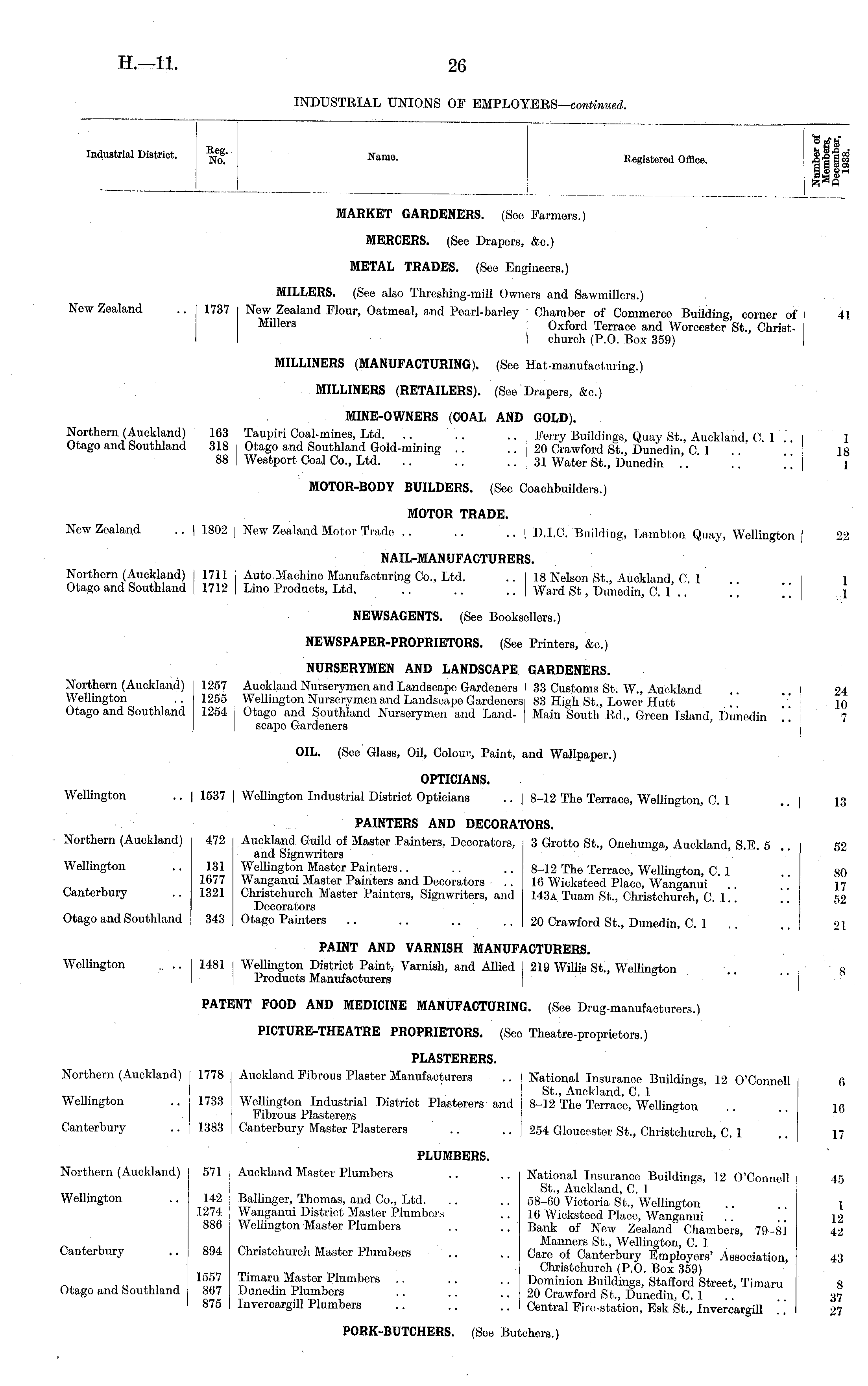 . °tfa Industrial District. *<«• Name. lteglstered Office. lIsS |||S gas MARKET GARDENERS. (See Farmers.) MERCERS. (See Drapers, &c.) METAL TRADES. (See Engineers.) MILLERS. (See also Threshing-mill Owners and Sawmillers.) New Zealand .. 1737 New Zealand Flour, Oatmeal, and Pearl-barley I Chamber of Commerce Building, corner of 41 Millers Oxford Terrace and Worcester St., ChristI church (P.O. Box 359) MILLINERS (MANUFACTURING). (See Hat-manufacturing.) MILLINERS (RETAILERS). (See Drapers, &c.) MINE-OWNERS (COAL AND GOLD). Northern (Auckland) I 163 I Taupiri Coal-mines, Ltd. .. .. .. Ferry Buildings, Quay St., Auckland, 0. 1 1 Otago and Southland i 318 j Otago and Southland Gold-mining .. .. j 20 Crawford St., Dunedin, C 1 "I 18 88 | Westport Coal Co., Ltd. .. .. 31 Water St., Dunedin !! ."j i MOTOR-BODY BUILDERS. (See Coachbuilders.) MOTOR TRADE. New Zealand .. | 1802 | New Zealand Motor Trade .. .. .. | D.I.C. Building, Lambton Quay, Wellington | 22 NAIL-MANUFACTURERS. Northern (Auckland) ! 1711 . Auto Machine Manufacturing Co., Ltd. .. | 18 Nelson St., Auckland, C. 1 .. I l Otago and Southland j 1712 [ Lino Products, Ltd. .. .. .. | Ward St, Dunedin, C. l'.. NEWSAGENTS. (See Booksellers.) NEWSPAPER-PROPRIETORS. (See Printers, &c.) NURSERYMEN AND LANDSCAPE GARDENERS. Northern (Auckland) 1257 | Auckland Nurserymen and Landscape Gardeners 33 Customs St. W., Auckland .. . 24 Wellington .. 1255 Wellington Nurserymen and Landscape Gardenors 83 High St., Lower Hutt '' " 10 Otago and Southland 1254 Otago and Southland Nurserymen and Land- Main South Rd„ Green Island, Dunedin !! 7 I scape Gardeners OIL. (See Glass, Oil, Colour, Paint, and Wallpaper.) OPTICIANS. Wellington .. | 1537 | Wellington Industrial District Opticians .. | 8-12 The Terrace, Wellington, C. 1 | 13 PAINTERS AND DECORATORS. Northern (Auckland) 472 Auckland Guild of Master Painters, Decorators, 3 Grotto St., Onehunga, Auckland, S.E. 5 . 52 and Signwriters Wellington .. 131 Wellington Master Painters.. .. .. 8-12 The Terrace, Wellington, C. 1 80 1677 Wanganui Master Painters and Decorators . . 16 Wicksteed Placo, Wanganui .. '' 17 Canterbury .. 1321 Christchurch Master Painters, Signwriters, and 143a Tuam St., Christchurch, C. 1.. . . 52 Decorators Otago and Southland 343 Otago Painters .. .. .. .. 20 Crawford St., Dunedin, C. 1 .. .. 21 PAINT AND VARNISH MANUFACTURERS. Wellington . .. j 1481 I Wellington District Paint, Varnish, and Allied | 219 Willis St., Wellington .. j' 8 I | Products Manufacturers PATENT FOOD AND MEDICINE MANUFACTURING. (See Drug-manufacturers.) PICTURE-THEATRE PROPRIETORS. (See Theatre-proprietors.) PLASTERERS. Northern (Auckland) 1778 | Auckland Fibrous Plaster Manufacturers .. National Insurance Buildings, 12 O'Connell C> St., Auckland, C. 1 Wellington .. 1733 Wellington Industrial District Plasterers and 8-12 The Terrace, Wellington .. US Fibrous Plasterers Canterbury .. 1383 | Canterbury Master Plasterers .. .. 254 Gloucester St., Christchurch, C. 1 .. 17 PLUMBERS. Northern (Auckland) 571 Auckland Master Plumbers .. .. National Insurance Buildings, 12 O'Connell 45 St., Auckland, C. 1 Wellington .. 142 Ballinger, Thomas, and Co., Ltd. .. .. 58-60 Victoria St., Wellington 1 1274 Wanganui District Master Plumbers .. 16 Wicksteed Place, Wanganui " " 12 886 Wellington Master Plumbers .. .. Bank of New Zealand Chambers, 79-81 42 Manners St., Wellington, C. 1 Canterbury .. 894 Christchurch Master Plumbers .. .. Care of Canterbury Employers' Association, 43 ,, , , Christchurch (P.O. Box 359) 1657 Imiaru Master 1 lumbers .. .. .. Dominion Buildings, Stafford Street, Timaru 8 Otago and Southland 867 Dunedin Plumbers .. .. .. 20 Crawford St, Dunedin CI 37 875 Invercargill Plumbers Central Fire-station, Esk St., Invercargill .'27 PORK-BUTCHERS. (See Butchers.)