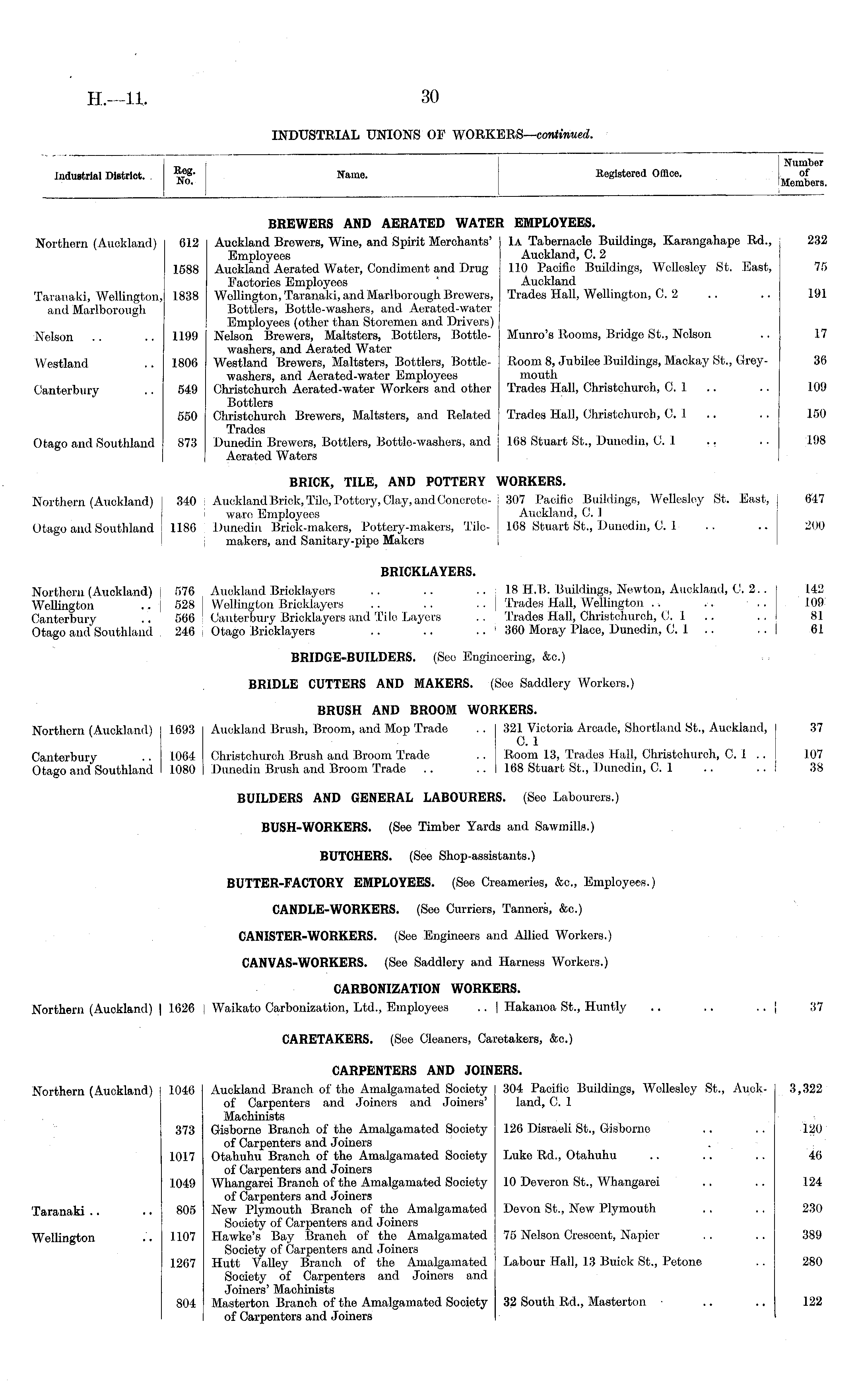 Number Industrial District. I Name. Registered Office. of I Members. BREWERS AND AERATED WATER EMPLOYEES. Northern (Auckland) 612 Auckland Brewers, Wine, and Spirit Merchants' 1a Tabernacle Buildings, Karangahape Rd., 232 Employees Auckland, C. 2 1588 Auckland Aerated Water, Condiment and Drug 110 Pacific Buildings, Wellesley St. East, 75 Factories Employees " Auckland Taranaki, Wellington, 1838 Wellington, Taranaki, and Marlborough Brewers, Trades Hall, Wellington, C. 2 .. .. 191 and Marlborough Bottlers, Bottle-washers, and Aerated-water Employees (othor than Storemen and Drivers) Nelson .. .. 1199 Nelson Brewers, Maltsters, Bottlers, Bottle- Munro's Rooms, Bridge St., Nelson .. 17 washers, and Aerated Water Westland .. 1806 Westland Brewers, Maltsters, Bottlers, Bottle- Room 8, Jubilee Buildings, Mackay St., Grey- 36 washers, and Aerated-water Employees mouth Canterbury .. 549 Christchurch Aerated-water Workers and other Trades Hall, Christchurch, C. 1 .. .. 109 Bottlers 550 Christchurch Brewers, Maltsters, and Related Trades Hall, Christchurch, 0.1 .. . . 150 Trades Otago and Southland 873 Dunedin Brewers, Bottlers, Bottle-washers, and 168 Stuart St., Dunedin, C. 1 . . • • 198 Aerated Waters BRICK, TILE, AND POTTERY WORKERS. Northern (Auckland) j 340 Auckland Brick, Tile, Pottery, Clay, and Conorete- J 307 Pacific Buildings, Wellesley St. East, j 647 ware Employees I Auckland, 0. 1 Otago and Southland ' 1186 Dunedin Brick-makers, Pottery-makers, Tile- J 168 Stuart St., Dunedin, 0. 1 .. .. 200 makers, and Sanitary-pipe Makers BRICKLAYERS. Northern (Auckland) 576 Auckland Bricklayers .. .. .. 18 H.B. Buildings, Newton, Auckland, 0. 2.. 142 Wellington .. , 528 ! Wellington Bricklayers .. .. . . : Trades Hall, Wellington .. .. . . 109 Canterbury .. 566 Canterbury Bricklayers and Tile Layers .. Trades Hall, Christchurch, 0. I .. 81 Otago and Southland 246 Otago Bricklayers ' .. .. .. 360 Moray Place, Dunedin, 0. 1 .. • • I 61 BRIDGE-BUILDERS. (See Engineering, &c.) BRIDLE CUTTERS AND MAKERS. (See Saddlery Workers.) BRUSH AND BROOM WORKERS. Northern (Auckland) 1693 Auckland Brush, Broom, and Mop Trade . . 321 Victoria Arcade, Shortland St., Auckland, 37 Canterbury .. 1064 Christchurch Brush and Broom Trade .. Room 13, Trades Hall, Christchurch, C. I .. 107 Otago and Southland 1080 Dunedin Brush and Broom Trade .. .. 168 Stuart St., Dunedin, C. 1 .. .. ! 38 BUILDERS AND GENERAL LABOURERS. (See Labourers.) BUSH-WORKERS. (See Timber Yards and Sawmills.) BUTCHERS. (See Shop-assistants.) BUTTER-FACTORY EMPLOYEES. (See Creameries, &c., Employees.) CANDLE-WORKERS. (See Curriers, Tanners, &c.) CANISTER-WORKERS. (See Engineers and Alliod Workers.) CANVAS-WORKERS. (See Saddlery and Harness Workers.) CARBONIZATION WORKERS. Northern (Auckland) | 1626 1 Waikato Carbonization, Ltd., Employees .. | Hakanoa St., Huntly .. .. .. | 37 CARETAKERS. (See Cleaners, Caretakers, &c.) CARPENTERS AND JOINERS. Northern (Auckland) 1046 Auckland Branch of tho Amalgamated Society 304 Pacific Buildings, Wellesley St., Auck- 3,322 of Carpenters and Joiners and Joiners' land, C. 1 Machinists 373 Gisborne Branch of the Amalgamated Society 126 Disraeli St., Gisborne .. .. 120 of Carpenters and Joiners 1017 Otahuhu Branch of the Amalgamated Society Luke Rd., Otahuhu .. .. .. 46 of Carpenters and Joiners 1049 Whangarei Branch of the Amalgamated Society 10 Deveron St., Whangarei .. .. 124 of Carpenters and Joiners Taranaki .. .. 805 New Plymouth Branch of the Amalgamated Devon St., New Plymouth .. .. 230 Society of Carpenters and Joiners Wellington . . 1107 Hawke's Bay Branch of the Amalgamated 75 Nelson Crescent, Napier .. .. 389 Society of Carpenters and Joiners 1267 Hutt Valley Branch of the Amalgamated Labour Hall, 13 Buick St., Petone .. 280 Society of Carpenters and Joiners and Joiners' Machinists 804 Masterton Branch of the Amalgamated Society 32 South Rd., Masterton .. .. 122 of Carpenters and Joiners
