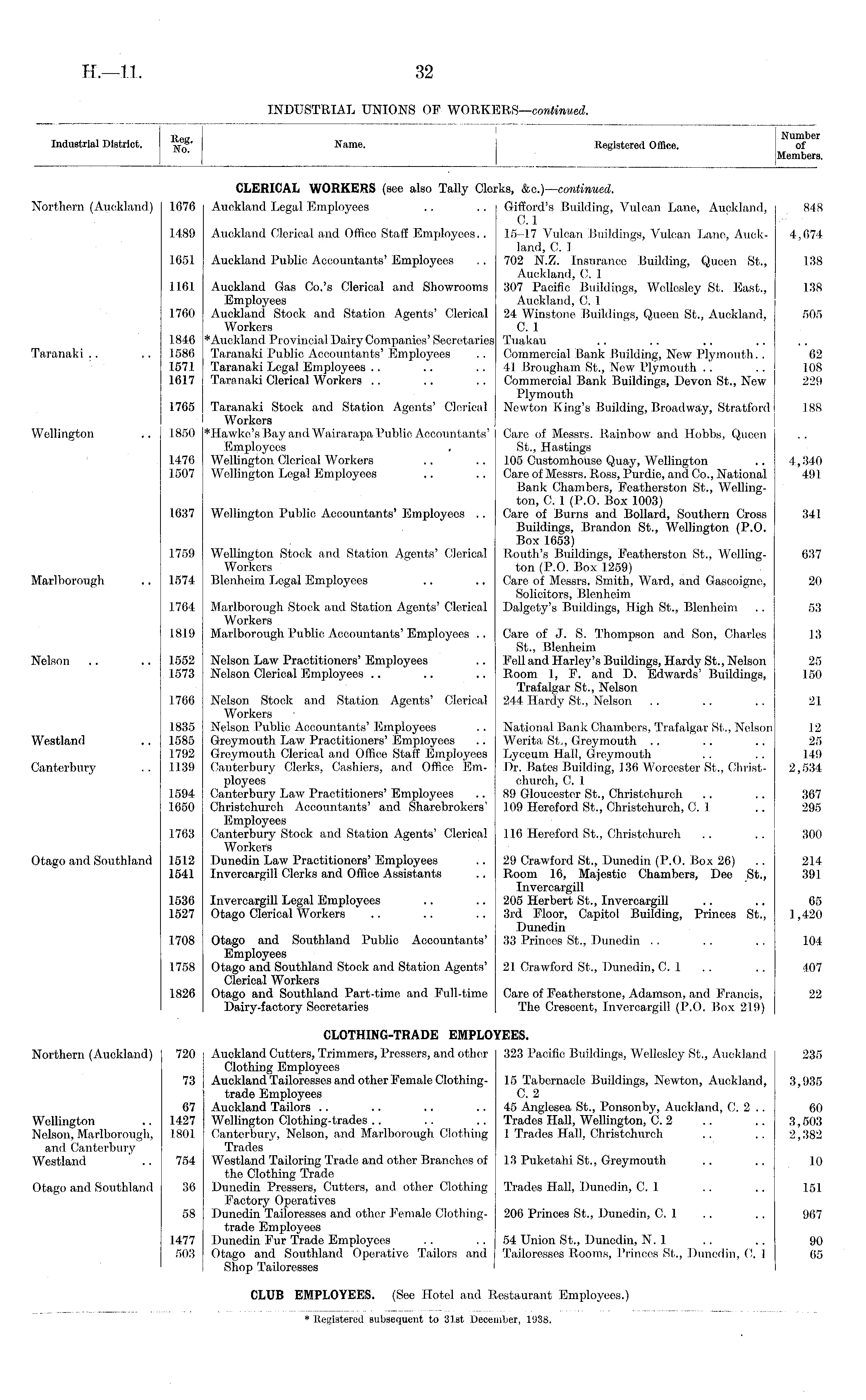 ])„„ * ! Number Industrial District. w ~f* Name. | Registered Office. I of jMembers. CLERICAL WORKERS (see also Tally Clerks, &c.)—continued. Northern (Auckland) 1676 Auckland Legal Employees .. . . Gifford's Building, Vulcan Lane, Auckland, 848 0.1 1489 Auckland Clerical and Office Staff Employees.. 15-17 Vulcan Buildings, Vulcan Lane, Auck- 4,674 land, 0. 1 1651 Auckland Public Accountants' Employees .. 702 N.Z. Insurance Building, Queen St., 138 Auckland, C. 1 1161 Auckland Gas Co.'s Clerical and Showrooms 307 Pacific Buildings, Wellesley St. East., 138 Employees Auckland, C. 1 1760 Auckland Stock and Station Agents' Clerical 24 Winstone Buildings, Queen St., Auckland, 505 Workers C. 1 1846 * Auckland Provincial Dairy Companies' Secretaries Tuakau Taranaki .. .. 1586 Taranaki Public Accountants' Employees .. Commercial Bank Building, New Plymouth.. 62 1571 Taranaki Legal Employees .. .. 41 Brougham St., New Plymouth . . .. 108 1617 Taranaki Clerical Workers .. .. .. Commercial Bank Buildings, Devon St., New 229 Plymouth 1765 Taranaki Stock and Station Agents' Clerical Newton King's Building, Broadway, Stratford 188 Workers Wellington .. 1850 *Hawke's Bay and Wairarapa Public Accountants' Care of Messrs. Rainbow and Hobbs, Queen Employees . St., Hastings 1476 Wellington Clerical Workers .. .. 105 Customhouse Quay, Wellington .. 4,340 1507 Wellington Legal Emjjloyees .. .. Care of Messrs. Ross, Purdie, and Co., National 491 Bank Chambers, Peatherston St., Wellington, C. 1 (P.O. Box 1003) 1637 Wellington Public Accountants' Employees .. Care of Burns and Bollard, Southern Cross 341 Buildings, Brandon St., Wellington (P.O. Box 1653) 1759 Wellington Stock and Station Agents' Clerical Routh's Buildings, Eeatherston St., Welling- 637 Workers ton (P.O. Box 1259) Marlborough .. 1574 Blenheim Legal Employees .. .. Care of Messrs. Smith, Ward, and Gascoigne, 20 Solicitors, Blenheim 1764 Marlborough Stock and Station Agents' Clerical Dalgety's Buildings, High St., Blenheim .. 53 Workers 1819 Marlborough Public Accountants'Employees .. Care of J. S. Thompson and Son, Charles 13 St., Blenheim Nelson .. .. 1552 Nelson Law Practitioners'Employees .. Fell and Harley's Buildings, Hardy St., Nelson 25 1573 Nelson Clerical Employees .. .. .. Room 1, F. and D. Edwards' Buildings, 150 Trafalgar St., Nelson 1766 Nelson Stock and Station Agents' Clerical 244 Hardy St., Nelson . . .. .. 21 Workers 1835 Nelson Public Accountants' Employees .. National Bank Chambers, Trafalgar St., Nelson 12 Westland .. 1585 Greymouth Law Practitioners' Employees .. Werita St., Greymouth .. .. .. 25 1792 Greymouth Clerical and Office Staff Employees Lyceum Hall, Greymouth .. .. 149 Canterbury .. 1139 Canterbury Clerks, Cashiers, and Office Em- Dr. Bates Building, 136 Worcester St., Christ- 2,534 ployees church, C. 1 1594 Canterbury Law Practitioners' Employees .. 89 Gloucester St., Christchurch .. .. 367 1650 Christchurch Accountants' and Sharebrokers' 109 Hereford St., Christchurch, C. 1 .. 295 Employees 1763 Canterbury Stock and Station Agents' Clerical 116 Hereford St., Christchurch .. .. 300 Workers Otago and Southland 1512 Dunedin Law Practitioners' Employees .. 29 Crawford St., Dunedin (P.O. Box 26) .. 214 1541 Invercargill Clerks and Office Assistants .. Room 16, Majestic Chambers, Dee St., 391 Invercargill 1536 Invercargill Legal Employees .. .. 205 Herbert St., Invercargill .. .. 65 1527 Otago Clerical Workers .. .. .. 3rd Floor, Capitol Building, Princes St., 1,420 Dunedin 1708 Otago and Southland Public Accountants' 33 Princes St., Dunedin . . . . .. 104 Employees 1758 Otago and Southland Stock and Station Agents' 21 Crawford St., Dunedin, C. 1 .. .. 407 Clerical Workers 1826 Otago and Southland Part-time and Full-time Care of Featherstone, Adamson, and Francis, 22 Dairy-factory Secretaries The Crescent, Invercargill (P.O. Box 219) CLOTHING-TRADE EMPLOYEES. Northern (Auckland) 720 Auckland Cutters, Trimmers, Pressers, and other 323 Pacific Buildings, Wellesley St., Auckland 235 Clothing Employees 73 Auckland Tailoresses and other Female Clothing- 15 Tabernacle Buildings, Newton, Auckland, 3,935 trade Employees C. 2 67 Auckland Tailors .. .. .. 45 Anglesea St., Ponsonby, Auckland, C. 2 .. 60 Wellington .. 1427 Wellington Clothing-trades .. .. .. Trades Hall, Wellington, C. 2 .. .. 3,503 Nelson, Marlborough, 1801 Canterbury, Nelson, and Marlborough Clothing 1 Trades Hall, Christchurch .. .. 2,382 and Canterbury Trades Westland .. 754 Westland Tailoring Trade and other Branches of 13 Puketahi St., Greymouth .. .. 10 the Clothing Trade Otago and Southland 36 Dunedin Pressors, Cutters, and other Clothing Trades Hall, Dunedin, C. I .. .. 151 Factory Operatives 58 Dunedin Tailoresses and other Female Clothing- 206 Princes St., Dunedin, C. 1 .. .. 967 trade Employees 1477 Dunedin Fur Trade Employees .. 54 Union St., Dunedin, N. 1 .. .. 90 503 Otago and Southland Operative Tailors and Tailoresses Rooms, Princes St., Dunedin, C. 1 65 Shop Tailoresses CLUB EMPLOYEES. (See Hotel and Restaurant Employees.) * Registered subsequent to 31st December, 1038.