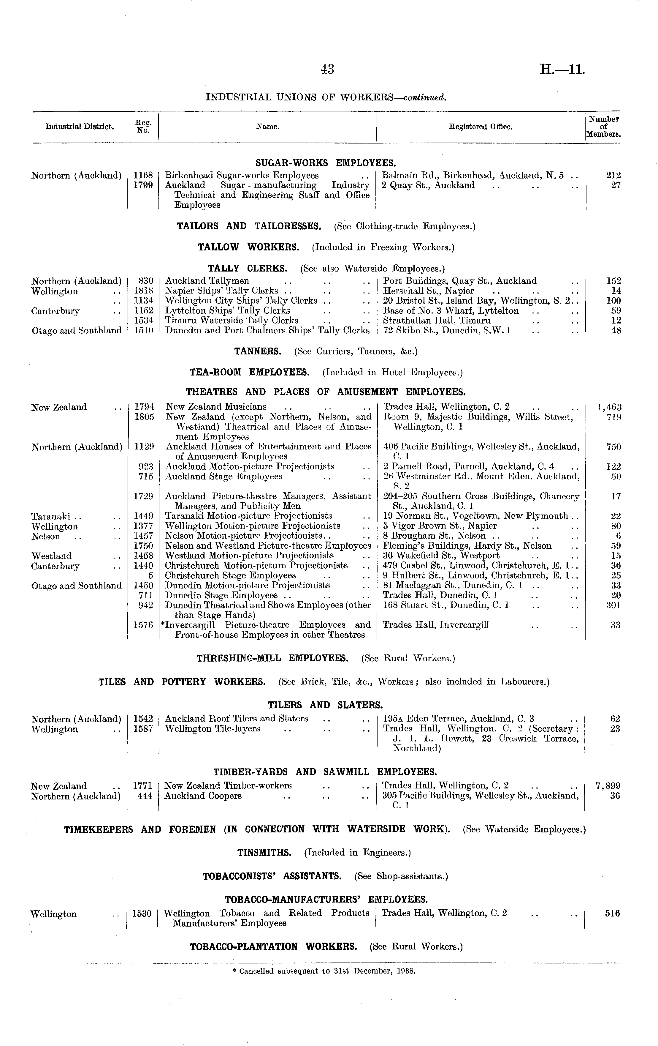 Ti pit Number Industrial District. v', Name. Registered Office. of Jm j Members. SUGAR-WORKS EMPLOYEES. Northern (Auckland) 1168 Birkenhead Sugar-works Employees .. Balmain Rd., Birkenhead, Auckland, N. 5 .. 212 1799 Auckland Sugar - manufacturing Industry 2 Quay St., Auckland .. .. .. 27 Technical and Engineering Staff and Office Employees TAILORS AND TAILORESSES. (See Clothing-trade Employees.) TALLOW WORKERS. (Included in Freezing Workers.) TALLY CLERKS. (See also Waterside Employees.) Northern (Auckland) 830 Auckland Tallymen .. .. .. Port Buildings, Quay St., Auckland .. 152 Wellington .. 1818 Napier Ships'Tally Clerks .. .. .. Herschall St., Napier .. .. .. 14 1134 Wellington City Ships'Tally Clerks .. .. 20 Bristol St., Island Bay, Wellington, S. 2.. 100 Canterbury .. 1152 Lyttelton Ships' Taliy Clerks .. .. Base of No. 3 Wharf, Lyttelton . . .. 59 1534 Timaru Waterside Tally Clerks .. .. Strathallan Hall, Timaru .. .. 12 Otago and Southland 1510 Dunedin and Port Chalmers Ships' Tally Clerks 72 Skibo St., Dunedin, S.W. 1 .. .. 48 TANNERS. (See Curriers, Tanners, &c.) TEA-ROOM EMPLOYEES. (Included in Hotel Employees.) THEATRES AND PLACES OF AMUSEMENT EMPLOYEES. New Zealand .. 1794 New Zealand Musicians .. .. .. Trades Hall, Wellington, C. 2 .. .. 1,463 1805 New Zealand (except Northern, Nelson, and Room 9, Majestic Buildings, Willis Street, 719 Westland) Theatrical and Places of Amuse- Wellington, C. 1 ment Employees Northern (Auckland) 1129 Auckland Houses of Entertainment and Places 406 Pacific Buildings, Wellesley St., Auckland, 750 of Amusement Employees C. 1 923 Auckland Motion-picture Projectionists .. 2 Parnell Road, Parnell, Auckland, C. 4 .. 122 715 Auckland Stage Employees .. 26 Westminster Rd., Mount Eden, Auckland, 50 S. 2 1729 Auckland Picture-theatre Managers, Assistant 204-205 Southern Cross Buildings, Chancery I 17 Managers, and Publicity Men St., Auckland, C. 1 Taranaki .. ■ ■ 1449 Taranaki Motion-picture Projectionists .. 19 Norman St., Vogeltown, New Plymouth . . 22 Wellington .. 1377 Wellington Motion-picture Projectionists .. 5 Vigor Brown St., Napier .. .. 80 Nelson .. .. 1457 Nelson Motion-picture Projectionists.. .. 8 Brougham St., Nelson .. .. .. 6 1750 Nelson and Westland Picture-theatre Employees Fleming's Buildings, Hardy St., Nelson .. 59 Westland . . 1458 Westland Motion-picture Projectionists .. 36 Wakefield St., Westport .. .. 15 Canterbury .. 1440 Christchurch Motion-picture Projectionists .. 479 Cashel St., Linwood, Christchurch, E. 1.. 36 5 Christchurch Stage Employees .. 9 Hulberfc St., Linwood, Christchurch, E. 1.. 25 Otago and Southland 1450 Dunedin Motion-picture Projectionists .. 81 Maclaggan St., Dunedin, C. 1 .. .. 33 711 Dunedin Stage Employees .. .. . . Trades Hall, Dunedin, C. 1 .. . . 20 942 Dunedin Theatrical and Shows Employees (other 168 Stuart St., Dunedin, C. 1 .. .. 301 than Stage Hands) 1576 *lnvercargill Picture-theatre Employees and Trades Hall, Invercargill .. .. 33 Eront-of-house Employees in other Theatres THRESHING-MILL EMPLOYEES. (See Rural Workers.) TILES AND POTTERY WORKERS. (See Brick, Tile, &c., Workers; also included in Labourers.) TILERS AND SLATERS. Northern (Auckland) 1542 Auckland Roof Tilers and Slaters .. .. 195a Eden Terrace, Auckland, C. 3 .. 62 Wellington .. 1587 Wellington Tile-layers .. .. .. Trades Hall, Wellington, C. 2 (Secretary : 23 J. I. L. Hewett, 23 Creswick Terraoe, | Northland) TIMBER-YARDS AND SAWMILL EMPLOYEES. New Zealand .. 1771 New Zealand Timber-workers .. .. j Trades Hall, Wellington, C. 2 .. .. 7,899 Northern (Auckland) 444 Auckland Coopers .. .. .. I 305 PaciBc Buildings, Wellealey St., Auckland, 36 I C. 1 TIMEKEEPERS AND FOREMEN (IN CONNECTION WITH WATERSIDE WORK). (See Waterside Employees.) TINSMITHS. (Included in Engineers.) TOBACCONISTS' ASSISTANTS. (See Shop-assistants.) TOBACCO-MANUFACTURERS' EMPLOYEES. Wellington . . j 1530 | Wellington Tobacco and Related Products j Trades Hall, Wellington, C. 2 .. .. i 516 I Manufacturers' Employees I TOBACCO-PLANTATION WORKERS. (See Rural Workers.) « Cancelled subsequent to 31st December, 1988.