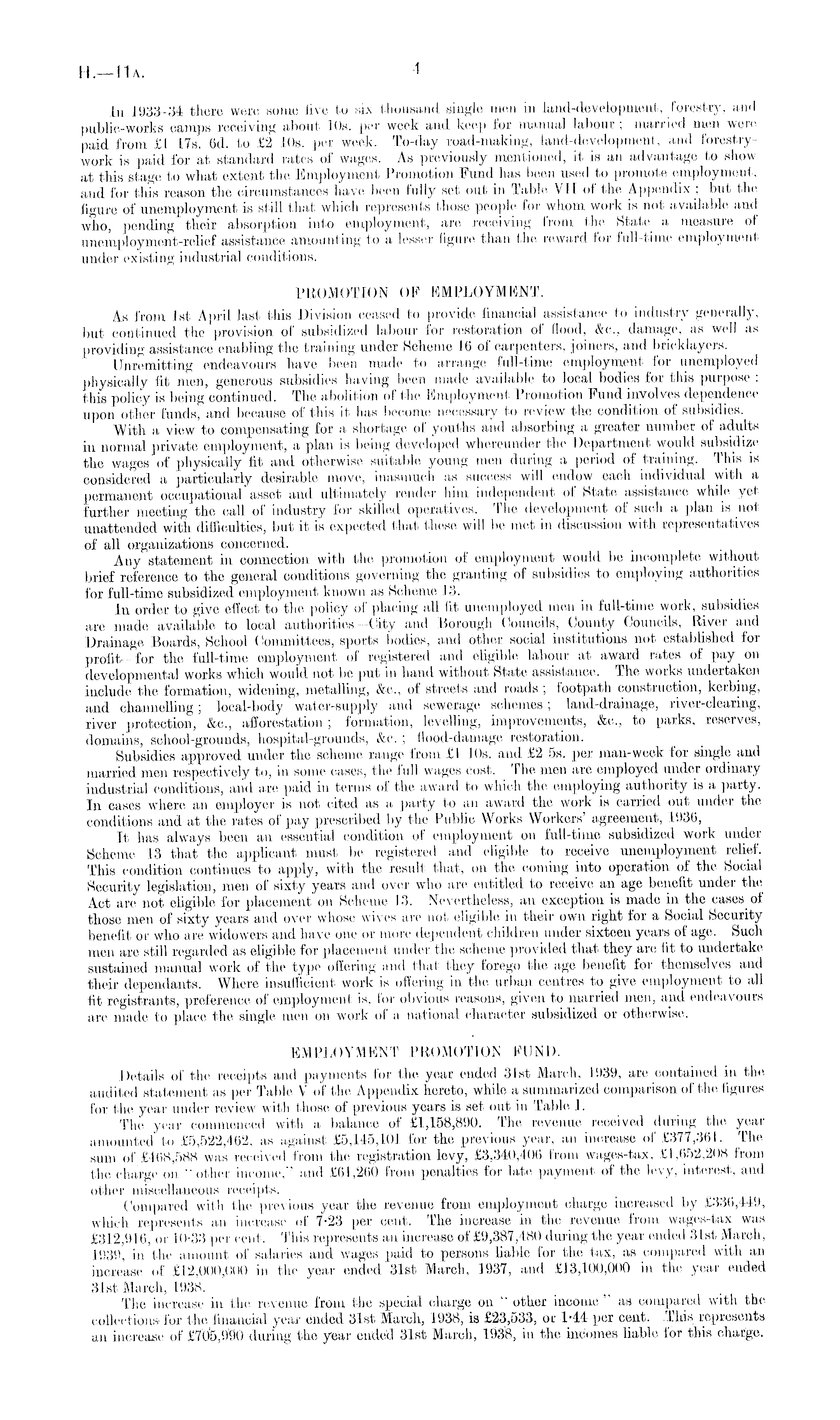 In 1933-34 there were some live to six thousand single men in land-development, forestry, and public-works camps receiving about 10s. per week and keep for manual labour; married men were, paid from £1 17s. 6d. to £2 10s. per week. To-day road-making, land-development, and forestrywork is paid for at standard rates of wages. As previously mentioned, it is an advantage to show at this stage to what extent the Employment Promotion Fund has been used to promote employment, and for this reason the circumstances have been fully set out in Table VII of the Appendix ; but the figure of unemployment is still that which represents those people for whom work is not available and who, pending their absorption into employment, are receiving from the State a measure of unemployment-relief assistance amounting to a lesser figure than the reward for full-time employment under existing industrial conditions. PROMOTION OF EMPLOYMENT. As from Ist April last this Division ceased to provide financial assistance to industry generally, but continued the provision of. subsidized labour for restoration of flood, &c., damage, as well as providing assistance enabling the training under Scheme 16 of carpenters, joiners, and bricklayers. Unremitting endeavours have been made to arrange full-time employment for unemployed physically fit men, generous subsidies having been made available to local bodies for this purpose : this policy is being continued. The abolition of the Employment Promotion Fund involves dependence upon other funds, and because of this it has become necessary to review the condition of subsidies. With a view to compensating for a shortage of youths and absorbing a greater number of adults in normal private employment, a plan is being developed whereunder the Department would subsidize the wages of physically fit and otherwise suitable young men during a period of training. This is considered a particularly desirable move, inasmuch as success will endow each individual with a permanent occupational asset and ultimately render him independent of State assistance while yet further meeting the call of industry for skilled operatives. The development of such a plan is not unattended with difficulties, but it is expected that these will be met in discussion with representatives of all organizations concerned. Any statement in connection with the promotion of employment would be incomplete without brief reference to the general conditions governing the granting of subsidies to employing authorities for full-time subsidized employment known as Scheme 13. In order to give effect to the policy of placing all fit unemployed men in full-time work, subsidies are made available to local authorities —City and Borough Councils, County Councils, River and Drainage Boards, School Committees, sports bodies, and other social institutions not established forprofit—for the full-time employment of registered and eligible labour at award rates of pay on developmental works which would not be put in hand without State assistance. The works undertaken include the formation, widening, metalling, &c., of streets and roads ; footpath construction, kcrbing, and channelling; local-body water-supply and sewerage schemes; land-drainage, river-clearing, river protection, &c., afforestation; formation, levelling, improvements, &c., to parks, reserves, domains, school-grounds, hospital-grounds, &c. ; flood-damage restoration. Subsidies approved under the scheme range from £1 10s. and £2 ss. per man-week for single and married men respectively to, in some cases, the full wages cost. The men are employed under ordinary industrial conditions, and are paid in terms of the award to which the employing authority is a party. In cases where an employer is not cited as a party to an award the work is carried out under the conditions and at the rates of pay prescribed by the Public Works Workers' agreement, 1936, It has always been an essential condition of employment on full-time subsidized work under Scheme 13 that the applicant must be registered and eligible to receive unemployment relief. This condition continues to apply, with the result that, on the coming into operation of the Social Security legislation, men of sixty years and over who are entitled to receive an age benefit under the Act are not eligible for placement on Scheme 13. Nevertheless, an exception is made in the cases of those men of sixty years and over whose wives are not eligible in their own right for a Social Security benefit or who are widowers and have one or more dependent children under sixteen years of age. Such men are still regarded as eligible for placement under the scheme provided that they are fit to undertake sustained manual work of the type offering and that they forego the age benefit for themselves and their dependants. Where insufficient work is offering in the urban centres to give employment to all fit registrants, preference of employment is, for obvious reasons, given to married men, and endeavours are made to place the single men on work of a national character subsidized or otherwise. EMPLOYMENT PROMOTION FUND. Details of the receipts and payments for the year ended 31st March, 1939, are contained in the audited statement as per Table V of the Appendix hereto, while a summarized comparison of the figures for the year under review with those of previous years is set out in Table I. The year commenced with a balance of £1,158,890. The revenue received during the year amounted to £5,522,462, as against £5,145,101 for the previous year, an increase of £377,361. The sum of £468,588 was received from the registration levy, £3,340,406 from wages-tax, £1,652,208 from the charge on " other income," and £61,260 from penalties for late payment of the levy, interest, and other miscellaneous receipts. Compared with the previous year the revenue from employment charge increased by £336,449, which represents an increase of 7-23 per cent. The 