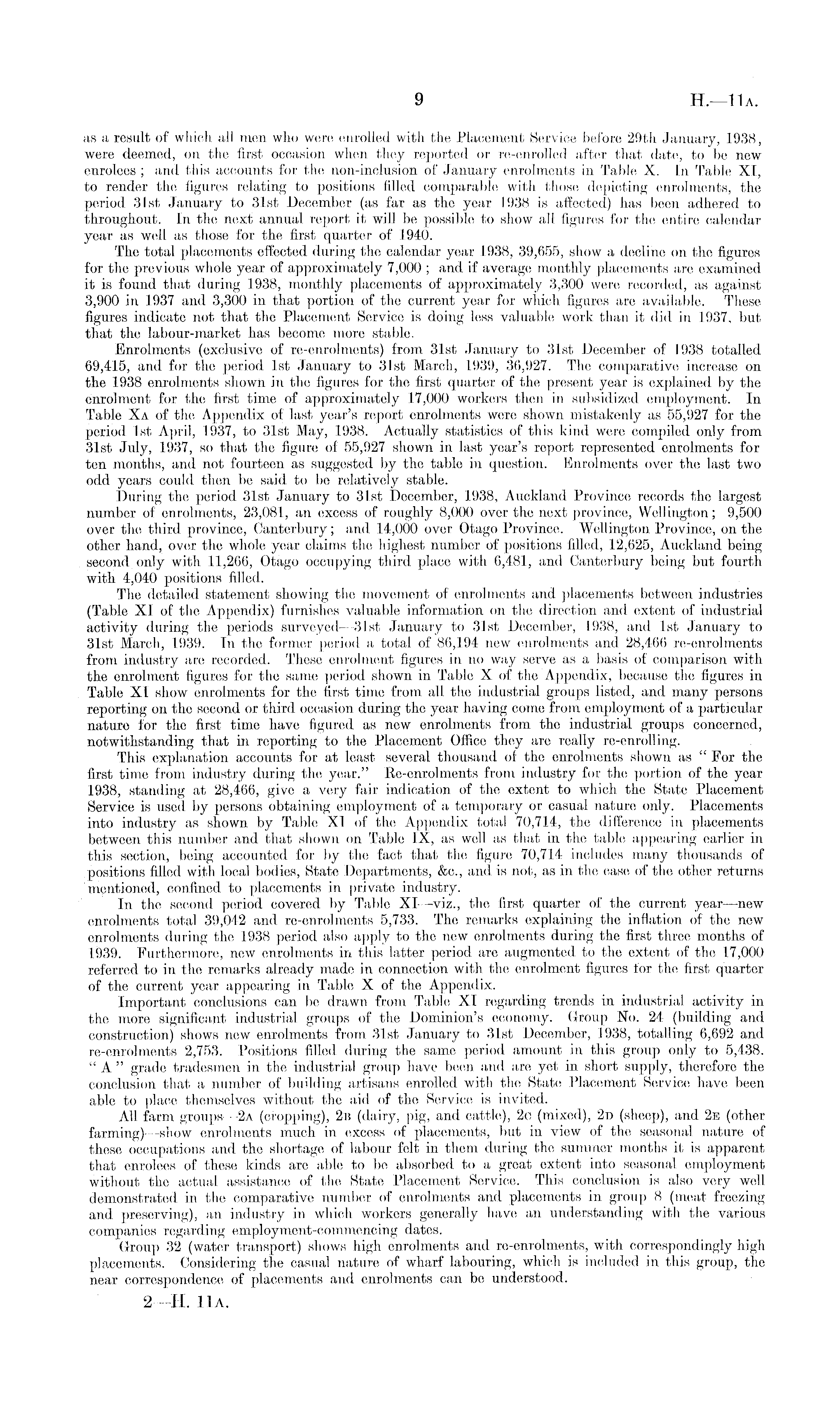 as a result of which all men who were enrolled with the Placement Service before 29th January, 1938, were deemed, on the first occasion when they reported or re-enrolled after that date, to be new enrolees ; and this accounts for the non-inclusion of January enrolments in Table X. In Table XI, to render the figures relating to positions filled comparable with those depicting enrolments, the period 31st January to 31st December (as far as the year 1938 is affected) has been adhered to throughout. In the next annual report it will be possible to show all figures for the entire calendar year as well as those for the first quarter of 1940. The total placements effected during the calendar year 1938, 39,655, show a decline on the figures for the previous whole year of approximately 7,000 ; and if average monthly placements are examined it is found that during 1938, monthly placements of approximately 3,300 were recorded, as against 3,900 in 1937 and 3,300 in that portion of the current year for which figures are available. These figures indicate not that the Placement Service is doing less valuable work than it did in 1937, but that the labour-market has become more stable. Enrolments (exclusive of re-enrolments) from 31st January to 31st December of 1938 totalled 69,415, and for the period Ist January to 31st March, 1939, 36,927. The comparative increase on the 1938 enrolments shown in the figures for the first quarter of the present year is explained by the enrolment for the first time of approximately 17,000 workers then in. subsidized employment. In Table Xa of the Appendix of last year's report enrolments were shown mistakenly as 55,927 for the period Ist April, 1937, to 31st May, 1938. Actually statistics of this kind were compiled only from 31st July, 1937, so that the figure of 55,927 shown in last year's report represented enrolments for ten months, and not fourteen as suggested by the table in question. Enrolments over the last two odd years could then be said to be relatively stable. During the period 31st January to 31st December, 1938, Auckland Province records the largest number of enrolments, 23,081, an excess of roughly 8,000 over the next province, Wellington; 9,500 over the third province, Canterbury; and 14,000 over Otago Province. Wellington Province, on the other hand, over the whole year claims the highest number of positions filled, 12,625, Auckland being second only with 11,266, Otago occupying third place with 6,481, and Canterbury being but fourth with 4,040 positions filled. The detailed statement showing the movement of enrolments and placements between industries (Table XI of the Appendix) furnishes valuable information on the direction and extent of industrial activity during the periods surveyed—3lst January to 31st December, 1938, and Ist January to 31st March, 1939. In the former period a total of 86,194 new enrolments and 28,466 re-enrolments from industry are recorded. These enrolment figures in no way serve as a basis of comparison with the enrolment figures for the same period shown in Table X of the Appendix, because the figures in Table XI show enrolments for the first time from all the industrial groups listed, and many persons reporting on the second or third occasion during the year having come from employment of a particular nature for the first time have figured as new enrolments from the industrial groups Concerned, notwithstanding that in reporting to the Placement Office they are really re-enrolling. This explanation accounts for at least several thousand of the enrolments shown as "For the first time from industry during the year." Re-enrolments from industry for the portion of the year 1938, standing at 28,466, give a very fair indication of the extent to which the State Placement Service is used by persons obtaining employment of a temporary or casual nature only. Placements into industry as shown by Table XI of the Appendix total 70,714, the difference in placements between this number and that shown on Table IX, as well as that in the table appearing earlier in this section, being accounted for by the fact that the figure 70,714 includes many thousands of positions filled with local bodies, State Departments, &c., and is not, as in the case of the other returns mentioned, confined to placements in private industry. In the second period covered by Table XI —viz., the first quarter of the current year—new enrolments total 39,042 and re-enrolments 5,733. The remarks explaining the inflation of the new enrolments during the 1938 period also apply to the new enrolments during the first three months of 1939. Furthermore, new enrolments in this latter period are augmented to the extent of the 17,000 referred to in the remarks already made in connection with the enrolment figures for the first quarter of the current year appearing in Table X of the Appendix. Important conclusions can be drawn from Table XI regarding trends in industrial activity in the more significant industrial groups of the Dominion's economy. Group No. 24 (building and construction) shows new enrolments from 31st January to 31st December, 1938, totalling 6,692 and re-enrolments 2,753. Positions filled during the same period amount in this group only to 5,438. " A " grade tradesmen in the industrial group have been and are yet in short supply, therefore the conclusion that a number of building artisans enrolled with the State Placement Service have been able to place themselves without the aid of the Service is invited. All farm groups —2a (cropping), 2b (dairy, pig, and cattle), 2c (mixed), 2d (sheep), and 2e (other farming) —show enrolments much in excess of placements, but in view of the seasonal nature of these occupations and the shortage of labour felt in them during the summer months it is apparent that enrolees of these kinds are able to be absorbed to a great extent into seasonal employment without the actual assistance of the State Placement Service. This conc