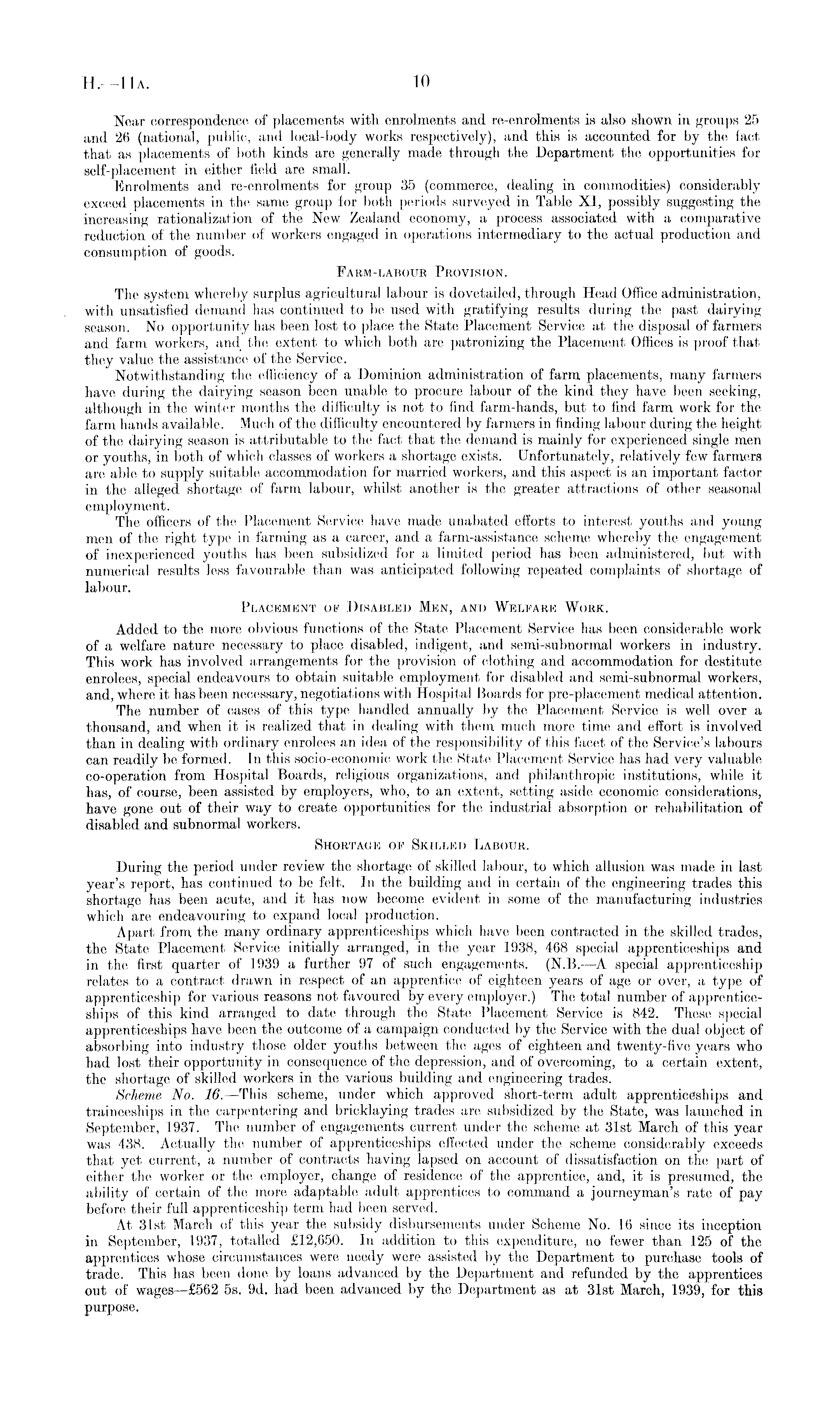 Near correspondence of placements with enrolments and re-enrolments is also shown in groups 25 and 26 (national, public, and local-body works respectively), and this is accounted for by the fact that as placements of both kinds are generally made through the Department the opportunities for self-placement in either field are small. Enrolments and re-enrolments for group 35 (commerce, dealing in commodities) considerably exceed placements in the same group for both periods surveyed in Table XI, possibly suggesting the increasing rationalization of the New Zealand economy, a process associated with a comparative reduction of the number of workers engaged in operations intermediary to the actual production and consumption of goods. Farm-labour Provision. The system whereby surplus agricultural labour is dovetailed, through Head Office administration, with unsatisfied demand has continued to be used with gratifying results during the past dairying season. No opportunity has been lost to place the State Placement Service at the disposal of farmers and farm workers, and the extent to which both are patronizing the Placement Offices is proof that they value the assistance of the Service. Notwithstanding the efficiency of a Dominion administration of farm placements, many farmers have during the dairying season been unable to procure labour of the kind they have been seeking, although in the winter months the difficulty is not to find farm-hands, but to find farm work for the farm hands available. Much of the difficulty encountered by farmers in finding labour during the height of the dairying season is attributable to the fact that the demand is mainly for experienced single men or youths, in both of which classes of workers a shortage exists. Unfortunately, relatively few farmers are able to supply suitable accommodation for married workers, and this aspect is an important factor in the alleged shortage of farm labour, whilst another is the greater attractions of other seasonal employment. The officers of the Placement Service have made unabated efforts to interest youths and young men of the right type in farming as a career, and a farm-assistance scheme whereby the engagement of inexperienced youths has been subsidized for a limited period has been administered, but with numerical results less favourable than was anticipated following repeated complaints of shortage of labour. Placement of Disabled Men, and Welfare Work. Added to the more obvious functions of the State Placement Service has been considerable work of a welfare nature necessary to place disabled, indigent, and semi-subnormal workers in industry. This work has involved arrangements for the provision of clothing and accommodation for destitute enrolees, special endeavours to obtain suitable employment for disabled and semi-subnormal workers, and, where it has been necessary, negotiations with Hospital Boards for pre-plaeement medical attention. The number of cases of this type handled annually by the Placement Service is well over a thousand, and when it is realized that in dealing with them much more time and effort is involved than in dealing with ordinary enrolees an idea of the responsibility of this facet of the Service's labours can readily be formed. In this socio-economic work the State Placement Service has had very valuable co-operation from Hospital Boards, religious organizations, and philanthropic institutions, while it has, of course, been assisted by employers, who, to an extent, setting aside economic considerations, have gone out of their way to create opportunities for the industrial absorption or rehabilitation of disabled and subnormal workers. Shortage of Skilled Labour. During the period under review the shortage of skilled labour, to which allusion was made in last year's report, has continued to be felt. In the building and in certain of the engineering trades this shortage has been acute, and it has now become evident in some of the manufacturing industries which are endeavouring to expand local production. Apart from the many ordinary apprenticeships which have been contracted in the skilled trades, the State Placement Service initially arranged, in the year 1938, 468 special apprenticeships and in the first quarter of 1939 a further 97 of such engagements. (N.B.- —A special apprenticeship relates to a contract drawn in respect of an apprentice of eighteen years of age or over, a type of apprenticeship for various reasons not favoured by every employer.) The total number of apprenticeships of this kind arranged to date through the State Placement Service is 842. These special apprenticeships have been the outcome of a campaign conducted by the Service with the dual object of absorbing into industry those older youths between the ages of eighteen and twenty-five years who had lost their opportunity in consequence of the depression, and. of overcoming, to a certain extent, the shortage of skilled workers in the various building and engineering trades. Scheme No. 16.—This scheme, under which approved short-term adult apprenticeships and traineeships in the carpentering and bricklaying trades are subsidized by the State, was launched in September, 1937. The number of engagements current under the scheme at 31st March of this year was 438. Actually the number of apprenticeships efiected under the scheme considerably exceeds that yet current, a number of contracts having lapsed on account of dissatisfaction on the part of either the worker or the employer, change of residence of the apprentice, and, it is presumed, the ability of certain of the more adaptable adult apprentices to command a journeyman's rate of pay before their full apprenticeship term had been served. At 31st March of this year the subsidy disbursements under Scheme No. 16 since its inception in September, 1937, totalled £12,650. In addition to this expenditure, no fewer than 125 of the apprentices whose circumstances were needy were ass
