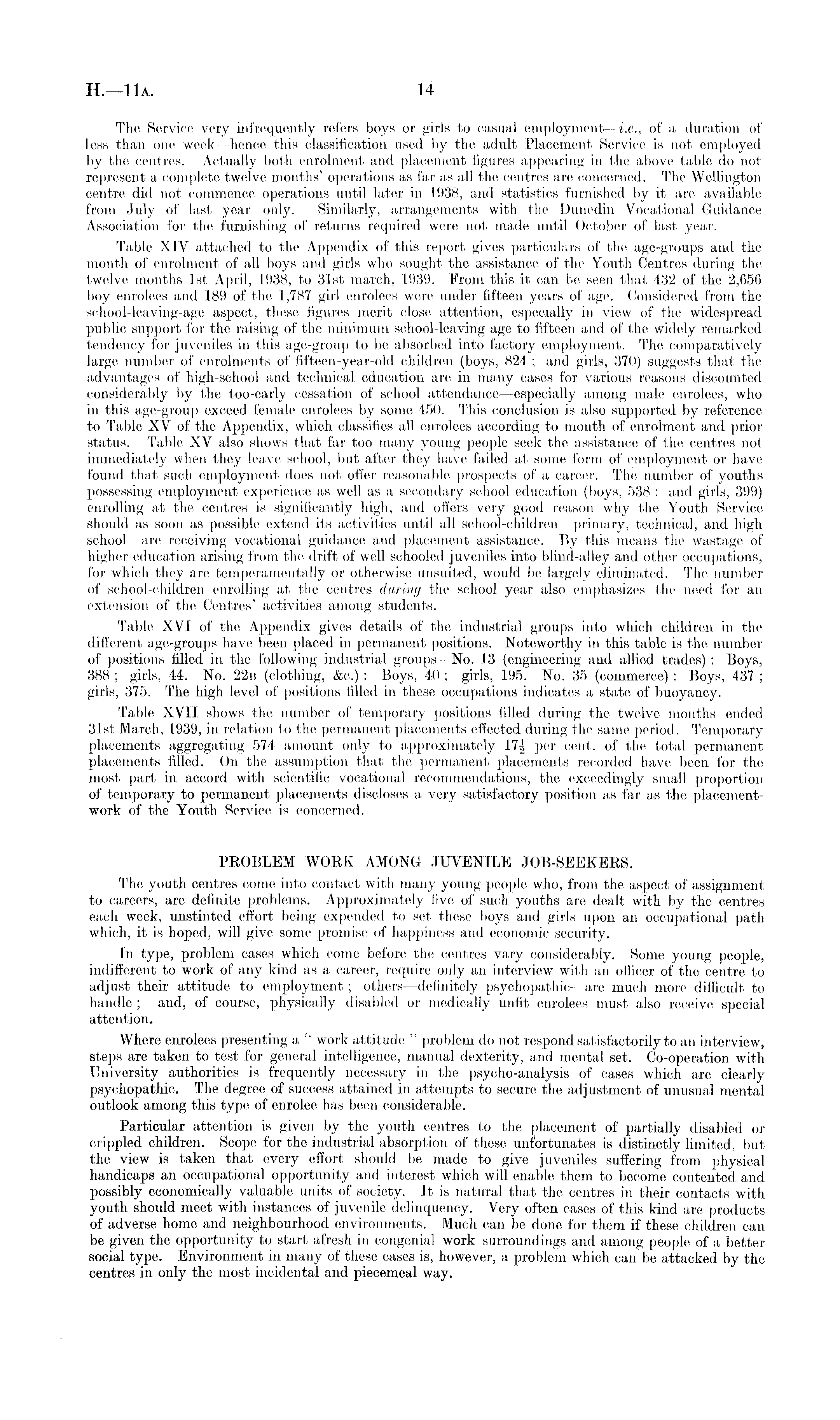 The Service very infrequently refers boys or girls to casual employment—i.e., of a duration of less than one week—hence this classification used by the adult Placement Service is not employed by the centres. Actually both enrolment and placement figures appearing in the above table do not represent a complete twelve months' operations as far as all the centres are concerned. The Wellington centre did not commence operations until later in 1938, and statistics furnished by it are available from .July of last year only. Similarly, arrangements with the Dunedin Vocational Guidance Association for the furnishing of returns required were not made until October of last year. Table XIV attached to the Appendix of this report gives particulars of the age-groups and the month of enrolment of all boys and girls who sought the assistance of the Youth Centres during the twelve months Ist April, 1938, to 31st march, 1939. From this it can be seen that 432 of the 2,656 boy enrolees and 189 of the 1,787 girl enrolees were under fifteen years of age. Considered from the school-leaving-age aspect, these figures merit close attention, especially in view of the widespread public support for the raising of the minimum school-leaving age to fifteen and of the widely remarked tendency for juveniles in this age-group to be absorbed into factory employment. The comparatively large number of enrolments of fifteen-year-old children (boys, 824 ; and girls, 370) suggests that the advantages of high-school and technical education are in many cases for various reasons discounted considerably by the too-early cessation of school attendance—especially among male enrolees, who in this age-group exceed female enrolees by some 450. This conclusion is also supported by reference to Table XV of the Appendix, which classifies all enrolees according to month of enrolment and prior status. Table XV also shows that far too many young people seek the assistance of the centres not immediately when they leave school, but after they have failed at some form of employment or have found that such employment does not offer reasonable prospects of a career. The number of youths possessing employment experience as well as a secondary school education (boys, 538 ; and girls, 399) enrolling at the centres is significantly high, and offers very good reason why the Youth Service should as soon as possible extend its activities until all school-children—primary, technical, and high school —are receiving vocational guidance and placement assistance. By this means the wastage of higher education arising from the drift of well schooled juveniles into blind-alley and other occupations, for which they are temperamentally or otherwise unsuited, would be largely eliminated. The number of school-children enrolling at the centres during the school year also emphasizes the need for an extension of the Centres' activities among students. Table XVI of the Appendix gives details of the industrial groups into which children in the different age-groups have been placed in permanent positions. Noteworthy in this table is the number of positions filled in the following industrial groups—No. 13 (engineering and allied trades) : Boys, 388 ; girls, 44. No. 22b (clothing, &c.) : Boys, 40 ; girls, 195. No. 35 (commerce) : Boys, 437 ; girls, 375. The high level of positions filled in these occupations indicates a state of buoyancy. Table XVII shows the number of temporary positions tilled during the twelve months ended 31st March, 1939, in relation to the permanent placements effected during the same period. Temporary placements aggregating 574 amount only to approximately 17f per cent, of the total permanent placements filled. On the assumption that the permanent placements recorded have been for the most part in accord with scientific vocational recommendations, the exceedingly small proportion of temporary to permanent placements discloses a very satisfactory position as far as the placementwork of the Youth Service is concerned. PROBLEM WORK AMONG JUVENILE JOB-SEEKERS. The youth centres come into contact with many young people who, from the aspect of assignment to careers, are definite problems. Approximately five of such youths are dealt with by the centres each week, unstinted effort being expended to set these boys and girls upon an occupational path which, it is hoped, will give some promise of happiness and economic security. In type, problem cases which come before the centres vary considerably. Some young people, indifferent to work of any kind as a career, require only an interview with an officer of the centre to adjust their attitude to employment ; others —definitely psychopathic-—are much more difficult to handle ; and, of course, physically disabled or medically unfit enrolees must also receive special attention. Where enrolees presenting a " work attitude " problem do not respond satisfactorily to an interview, steps are taken to test for general intelligence, manual dexterity, and mental set. Co-operation with University authorities is frequently necessary in the psycho-analysis of cases which are clearly psychopathic. The degree of success attained in attempts to secure the adjustment of unusual mental outlook among this type of enrolee has been considerable. Particular attention is given by the youth centres to the placement of partially disabled or crippled children. Scope for the industrial absorption of these unfortunates is distinctly limited, but the view is taken that every effort should be made to give juveniles suffering from physical handicaps an occupational opportunity and interest which will enable them to become contented and possibly economically valuable units of society. It is natural that the centres in their contacts with youth should meet with instances of juvenile delinquency. Very often cases of this kind are products of adverse home and neighbourhood environments. Much can be done for them if these childre