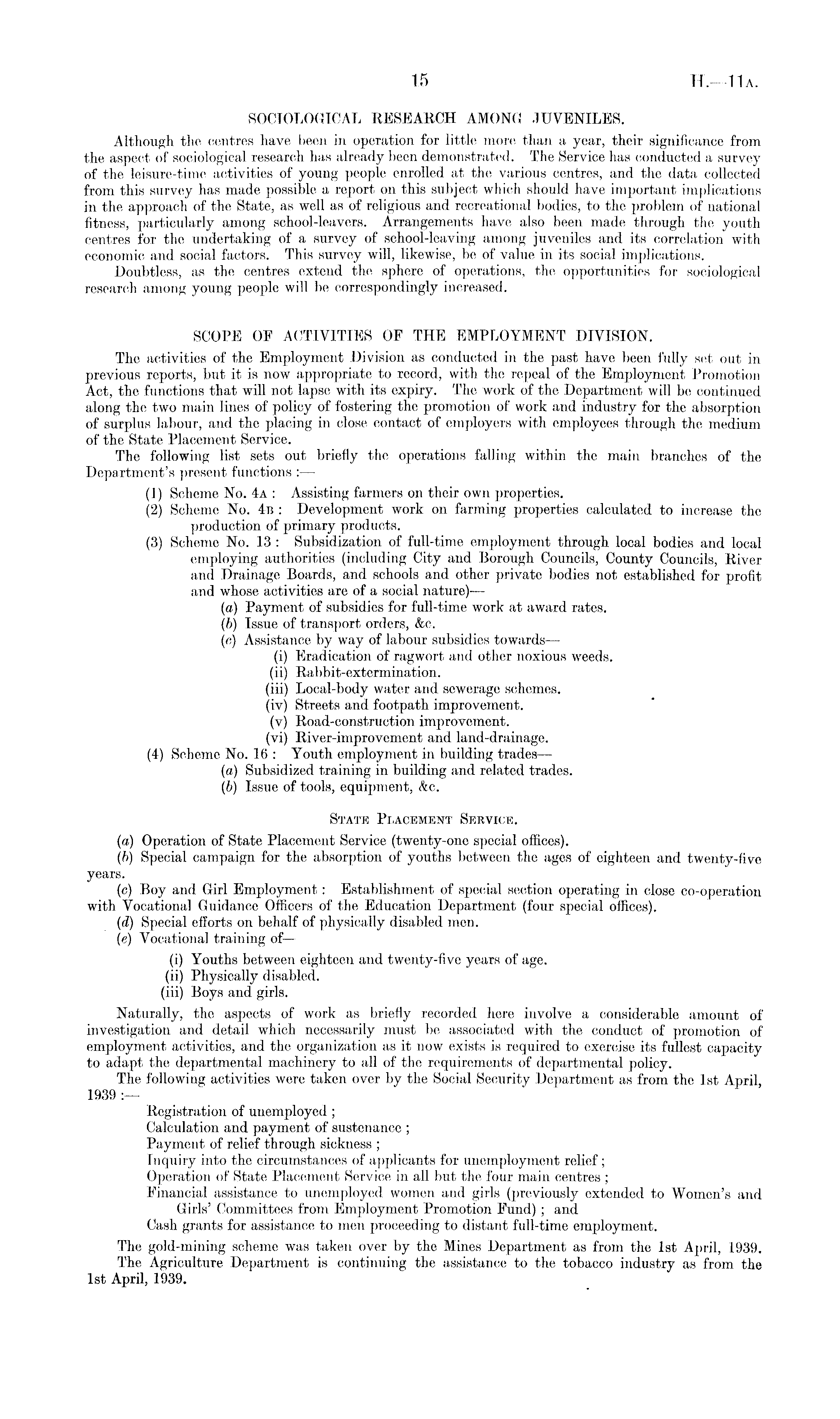 SOCIOLOGICAL RESEARCH AMONG JUVENILES. Although, the centres have been in operation for little more than a year, their significance from the aspect of sociological research has already been demonstrated. The Service has conducted a survey of the leisure-time activities of young people enrolled at the various centres, and the data collected from this survey has made possible a report on this subject which should have important implications in the approach of the State, as well as of religious and recreational bodies, to the problem of national fitness, particularly among school-leavers. Arrangements have also been made through the youth centres for the undertaking of a survey of school-leaving among juveniles and its correlation with economic and social factors. This survey will, likewise, be of value in its social implications. Doubtless, as the centres extend the sphere of operations, the opportunities for sociological research among young people will be correspondingly increased. SCOPE OF ACTIVITIES OF THE EMPLOYMENT DIVISION. The activities of the Employment Division as conducted in the past have been fully set out in previous reports, but it is now appropriate to record, with the repeal of the Employment Promotion Act, the functions that will not lapse with its expiry. The work of the Department will be continued along the two main lines of policy of fostering the promotion of work and industry for the absorption of surplus labour, and the placing in close contact of employers with employees through the medium of the State Placement Service. The following list sets out briefly the operations falling within the main branches of the Department's present functions : — (1) Scheme No. 4a : Assisting farmers on their own properties. (2) Scheme No. 4b : Development work on farming properties calculated to increase the production of primary products. (3) Scheme No. 13 : Subsidization of full-time employment through local bodies and local employing authorities (including City and Borough Councils, County Councils, River and Drainage Boards, and schools and other private bodies not established for profit and whose activities are of a social nature) — (a) Payment of subsidies for full-time work at award rates. (b) Issue of transport orders, &c. (c) Assistance by way of labour subsidies towards— (i) Eradication of ragwort and other noxious weeds. (ii) Rabbit-extermination. (iii) Local-body water and sewerage schemes. (iv) Streets and footpath improvement. (v) Road-construction improvement. (vi) River-improvement and land-drainage. (4) Scheme No. 16 : Youth employment in building trades— (a) Subsidized training in building and related trades. (b) Issue of tools, equipment, Ac. State Placement Service. (a) Operation of State Placement Service (twenty-one special offices). (b) Special campaign for the absorption of youths between the ages of eighteen and twenty-five years. (c) Boy and Girl Employment: Establishment of special section operating in close co-operation with Vocational Guidance Officers of the Education Department (four special offices). (id) Special efforts on behalf of physically disabled men. (e) Vocational training of— (i) Youths between eighteen and twenty-five years of age. (ii) Physically disabled. (iii) Boys and girls. Naturally, the aspects of work as briefly recorded here involve a considerable amount of investigation and detail which necessarily must be associated with the conduct of promotion of employment activities, and the organization as it now exists is required to exercise its fullest capacity to adapt the departmental machinery to all of the requirements of departmental policy. The following activities were taken over by the Social Security Department as from the Ist April, 1939 : — Registration of unemployed; Calculation and payment of sustenance ; Payment of relief through sickness ; Inquiry into the circumstances of applicants for unemployment relief; Operation of State Placement Service in all but the four main centres ; Financial assistance to unemployed women and girls (previously extended to Women's and Girls' Committees from Employment Promotion Fund); and Cash grants for assistance to men proceeding to distant full-time employment. The gold-mining scheme was taken over by the Mines Department as from the Ist April, 1939. The Agriculture Department is continuing the assistance to the tobacco industry as from the Ist April, 1939.