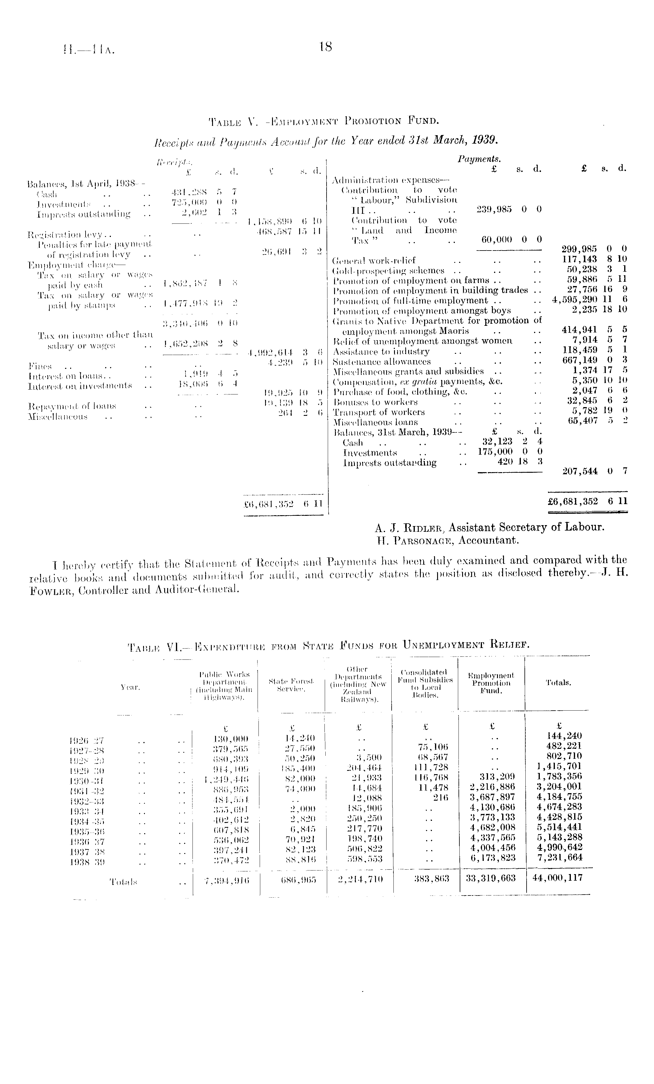 Table V. —Employment Promotion Fund. Receipts and Payments Account for the Year ended 31st March, 1939. Receipts. Payments. £ s. d. £ s. d. £ s- d. £ s. d. Balances, Ist April, 1938- Administration expenses--431 288 5 7 Contribution to vote Investments !!! 7251000 0 0 '' Labour," Subdivision Imprests outstanding .. 2,602 1 3 I• • •• •• » 1 1,158,890 6 10 Contribution to vote Registration levy 468,587 15 11 "Land and Income Penalties for late payment •• » 299,985 0 0 E m dIo vmenT eharee— " " ■ General work . re i icf 117,143 810 J Tax on salary °or wages Gold-prospecting schemes .. .. .. £0,238 Z 1 ™iri w»,«h ] 862 487 1 8 Promotion of employment on farms .. .. 59,88b 5 11 Tax oil salary or wages ' ' Promotion ol employment In bnilding M« .. }« » paid by atomps .. 1,477...8 1. i S » "15 S>s 3 340 406 0 10 Grants to Native Department for promotion of Tax on income other than ' employment amongst Maoris .. .. 414,941 5 5 salary or wages .. 1,652,208 2 8 Belief of unemployment amongst women .. 7,914 5 7 4,992,614 3 6 Assistance to industry .. .. .. 118,459 5 1 4,239 510 Sustenance allowances .. .. •• 667,149 0 3 Interest on loans.'.' " 1,919 4 5 Miscellaneous grants and subsidies . .. 1,374 17 5 Interest on investments .. 18,006 6 4 Compensation, ex graUa payments, &c. 5,350 10 1 19,925 10 9 Purchase of food, clothing, &e. .. . z,U47 o t) Repayment of loans .. .. 10,JM » Bonuae. to worker. 32,M5 « J • saaaicr :: :: :: AS" ? Balances, 31st March, 1939 —• £ s. d. Cash .. .. 32,123 2 4 Investments .. .. 175,000 0 0 Imprests outstanding .. 420 18 3 207,544 0 7 £6,681,352 6 11 £6,681,352 6 11 A. J. Ridler, Assistant Secretary of Labour. H. Parsonage, Accountant. I hereby certify that the Statement of Receipts and Payments has been duly examined and compared with the relative books and documents submitted for audit, and correctly states the position as disclosed thereby.—J. H. Fowler, Controller and Auditor-General.