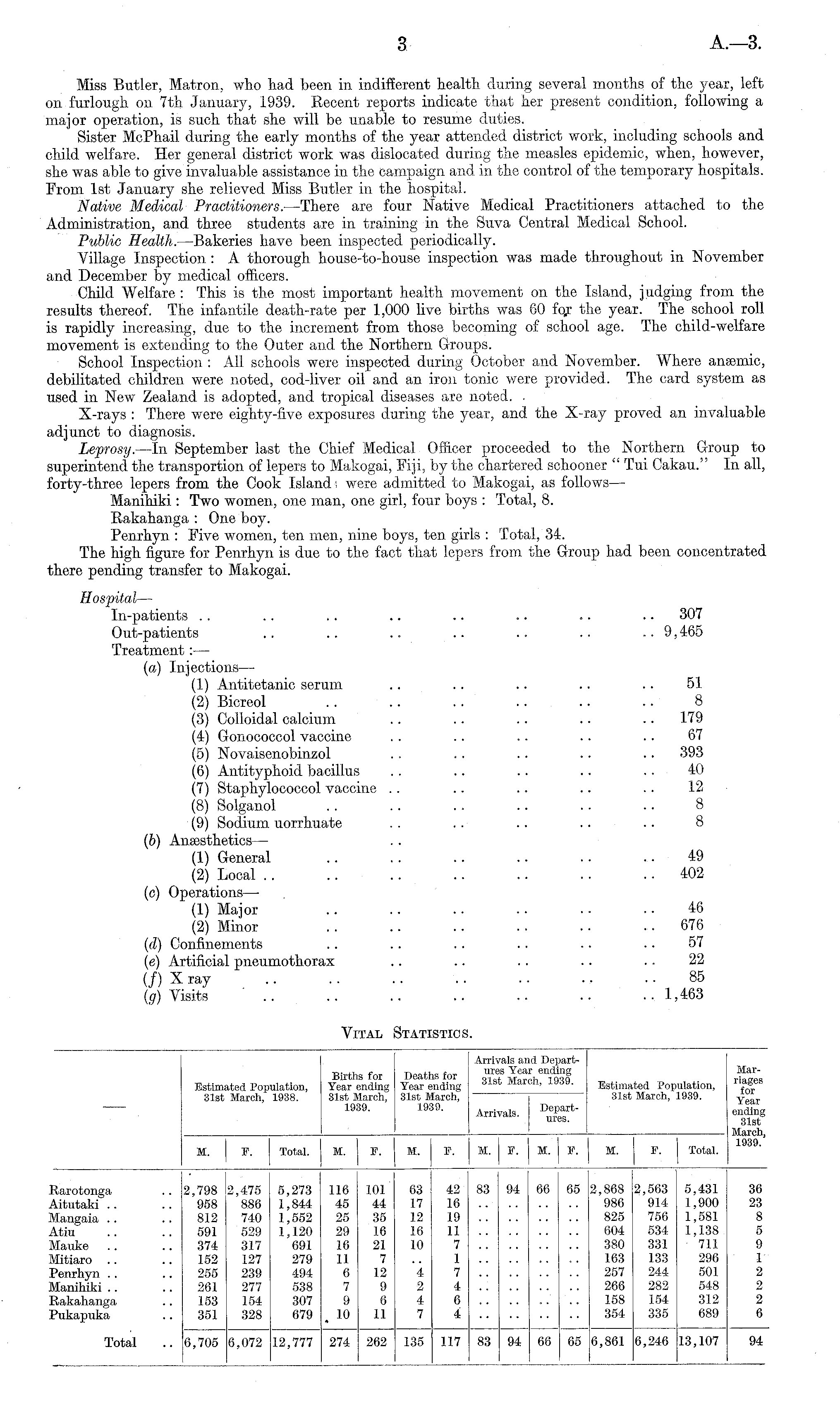 Miss Butler, Matron, who had been in indifferent health during several months of the year, left on furlough on 7th January, 1939. Recent reports indicate that her present condition, following a major operation, is such that she will be unable to resume duties. Sister McPhail during the early months of the year attended district work, including schools and child welfare. Her general district work was dislocated during the measles epidemic, when, however, she was able to give invaluable assistance in the campaign and in the control of the temporary hospitals. From Ist January she relieved Miss Butler in the hospital. Native Medical Practitioners.—There are four Native Medical Practitioners attached to the Administration, and three students are in training in the Suva Central Medical School. Public Health.—Bakeries have been inspected periodically. Village Inspection : A thorough house-to-house inspection was made throughout in November and December by medical officers. Child Welfare : This is the most important health, movement on the Island, judging from the results thereof. The infantile death-rate per 1,000 live births was 60 foj" the year. The school roll is rapidly increasing, due to the increment from those becoming of school age. The child-welfare movement is extending to the Outer and the Northern Groups. School Inspection : All schools were inspected during October and November. Where anaemic, debilitated children were noted, cod-liver oil and an iron tonic were provided. The card system as used in New Zealand is adopted, and tropical diseases are noted. • X-rays : There were eighty-five exposures during the year, and the X-ray proved an invaluable adjunct to diagnosis. Leprosy. —In September last the Chief Medical Officer proceeded to the Northern Group to superintend the transportion of lepers to Makogai, Fiji, by the chartered schooner " Tui Cakau." In all, forty-three lepers from the Cook Island; were admitted to Makogai, as follows— Manihiki: Two women, one man, one girl, four boys : Total, 8. Rakahanga : One boy. Penrhyn : Five women, ten men, nine boys, ten girls : Total, 34. The high figure for Penrhyn is due to the fact that lepers from the Group had been concentrated there pending transfer to Makogai. Hospital— In-patients .. .. .. .. .. .. .. .. 307 Out-patients .. .. .. .. .. .. .. 9,465 Treatment: — (a) Injections— (1) Antitetanic serum .. .. .. .. .. 51 (2) Bicreol . . .. . . .. . ■ . • 8 (3) Colloidal calcium .. .. .. .. .. 179 (4) Gonococcol vaccine .. .. .. .. .. 67 (5) Novaisenobinzol .. .. .. .. .. 393 (6) Antityphoid bacillus . . .. .. .. .. 40 (7) Staphylococcol vaccine .. .. .. .. . . 12 (8) Solganol .. .. .. .. . ■ • • 8 (9) Sodium uorrhuate .. .. .. .. .. 8 (b) Anaesthetics— (1) General .. .. .. .. .. . ■ 49 (2) Local .. .. .. .. .. .. . • 402 (c) Operations — (1) Major .. .. .. .. . ■ ■ • 46 (2) Minor . . .. .. .. .. . .676 (d) Confinements .. .. .. .. .. .. 57 (e) Artificial pneumothorax .. .. .. .. . ■ 22 (/) X ray .. .. .. .. ■■ •• • ■ 85 (g) Visits .. .. .. .. .. .. 1,463