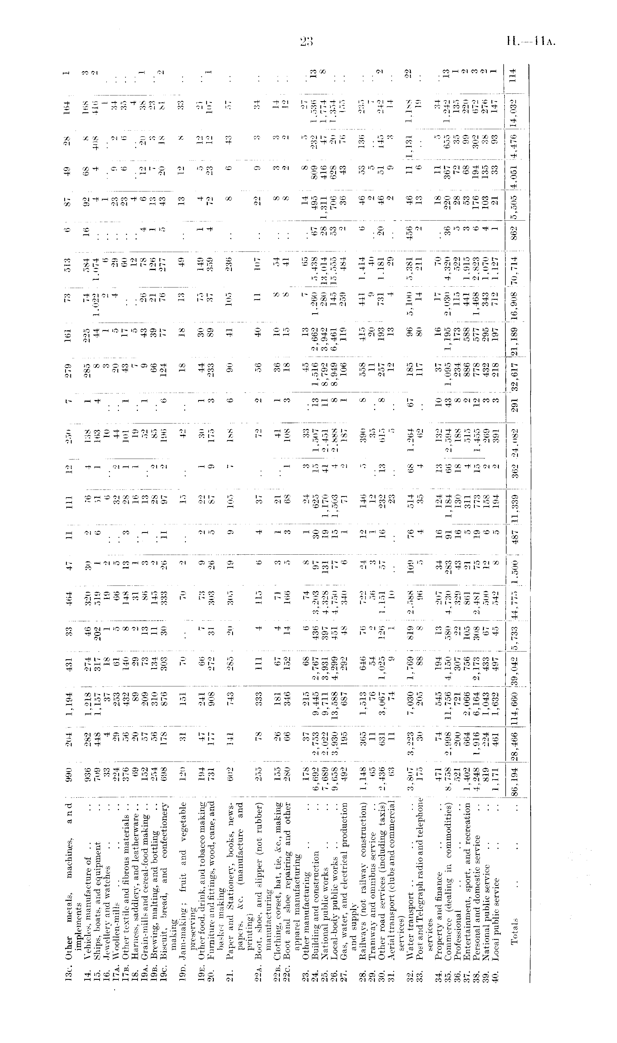 13c. Other metals, machines, and 990 204 1,194 431 33 464 47 11 111 12 250 7 279. 161 73 513 6 87 49 j 28 j 164 1 implements i 14. Vehicles, manufacture of .. .. 936 282 1,218 274 46 320' 30 2 16 4 138 1 285 225 74 584 16 92 68 8 168 15. Ships, boats, and equipment .. 709 448 1,157 317 202 519 1 6 >1 1 163 4 8 44 1,022 1,074 .. 4 4 408 416 16. Jewellery and watches .. .. 33 4 37 18 1 19 2 6 10 3 1 2 6 1 .. 1 . 17a. Woollen-mills .. .. 224 29 253 61 5 66 5 32 2 44 20 5 4 29 23 9 2 34 17b. Other textile and fibrous materials .. 376 56 432 140 8 148 13 3 28 1 101 1 43 17 .. 60 23 6 6 35 18. Harness, saddlery, and leatherware.. 69 20 89 29 2 31 1 16 1 19 7 5 12 4 . . 4 19a. Grain-mills and cereal-food making .. 152 57 209 73 13 86 3 1 13 52 1 9 43 26 78 4 6 12 20 38 19b. Brewing, malting, and bottling .. 254 56 310 134 11 145 2 28 2 85 66 39 21 126 1 13 7 3 23 19c. Biscuit, bread, and confectionery 698 178 876 303 30 333 26 11 97 2 196 6 124 77 76 277 5 43 20 18 making 19d. Jam-making; fruit and vegetable 120 31 151 70 70 2 15 42 18 18 13 49 13 12 8 33 preserving 19e. Other food, drink, and tobacco making 194 47 241 66 7 73 9 2 22 1 30 1 44 30 75 149 1 4 5 12 21 20. Furniture and fittings, wood, cane, and 731 177 908 272 31 303 26 5 87 9 175 3 233 89 37 359 4 72 23 12 107 1 basket making 21. Paper and Stationery, books, news- 602 141 743 285 20 305 ! 19 9 105 7 188 6 90 41 105 236 .. 8 6 43 57 papers, &c. (manufacture and printing) 22a. Boot, shoe, and slipper (not rubber) 255 78 333 111 4 115 6 4 37 72 2 56 40 11 107 .. 22 9 3 34 manufacturing 22b. Clothing, corset, hat, tie, &c., making 155 26 181 67 4 71 3 1 21 41 1 36 10 8 54 8 3 3 14 22c. Boot and shoe repairing and other 280 66 346 152 14 166 5 3 68 1 108 3 18 15 8 41 8 2 2 12 apparel manufacturing 23. Other manufacturing .. .. 178 37 215 68 6 74 8 1 24 3 33 45 13 7 65 14 8 5 27 24. Building and construction .. 6,692 2,753 9,445 2,767 436 3,203 97 30 625 15 1,507 13 1,516 2,662 1,260 5,438 67 495 809 232 1,536 13 25. National public works .. .. 7,689 2,022 9,711 3,931 397 4,328 131 19 1,170 41 2,451 11 8,792 3,942 280 13,014 28 1,311 416 47 1,774 8 26. Local-body public works .. .. 9,658 3,930 13,588 4,299 451 4,750 77 15 1,503 4 2,888 8 8,949 6,461 145 15,555 53 706 628 20 1,354 27. Gas, water, and electrical production 492 195 687 292 48 340 6 1 71 2 187 1 106 119 259 484 2 36 43 76 155 and supply 28. Railways (not railway construction) 1,148 365 1,513 646 76 722 24 12 146 5 390 8 558 415 441 1,414 6 46 53 136 235 29. Tramway and omnibus service .. 65 11 76 54 2 56 3 1 12 35 11 20 9 40 2 5 7 30. Other road services (including taxis) 2,436 631 3,067 1,025 126 1,151 57 16 232 13 615 8 257 193 731 1,181 20 46 51 145 242 31. Aerial transport (clubs and commercial 63 11 74 9 1 10 .. 23 5 12 13 4 29 2 9 3 14 services) 32. Water transport .. .. .. 3,807 3,223 7,030 1,769 819 2,588 109 76 514 68 1,264 67 185 96 5,100 5,381 456 46 11 1,131 1,188 22 33. Post and Telegraph radio and telephone 175 30 205 88 8 96 5 4 35 4 62 117 80 14 211 2 13 6 19 services 34. Property and finance .. .. 471 74 545 194 13 207 34 16 124 13 132 10 37 16 17 70 18 11 5 34 35. Commerce (dealing in commodities) 8,758 2,998 11,756 4,150 580 4,730 283 91 1,184 66 2,594 43 1,095 1,195 2,030 4,320 36 220 367 655 1,242 13 36. Professional .. .. .. 521 200 721 307 22' 329 43 16 130 18 188 8 234 173 115 522 5 28 72 35 135 1 37. Entertainment, sport, and recreation 1,402 664 2,066 756 105 861 21 5 311 4 515 2 886 588 441 1,915 3 53 68 99 220 38. Personal and domestic service .. 4,248 1,916 6,164 2,173 308 2,481 75 19 773 15 1,455 ' 12 778 577 1,468 2,823 6 176 194 302 672 3 39. National public service .. .. 819 224 1,043 433 67 500 12 6 158 2 269 3 432 295 343 1,070 4 103 135 38 276 40. Local public service .. .. 1,171 461 1,632 497 45 542 8 5 194 2 391 3 218 197 712 1,127 1 21 33 93 147 1 Totals .. .. .. 86,194 28,466 114,660 39,042 5,733 44,775 1,500 487 11,339 362 24,082 291 32,617 21,189 16,908 70,714 862 5,505 4,051 4,476 14,032 114