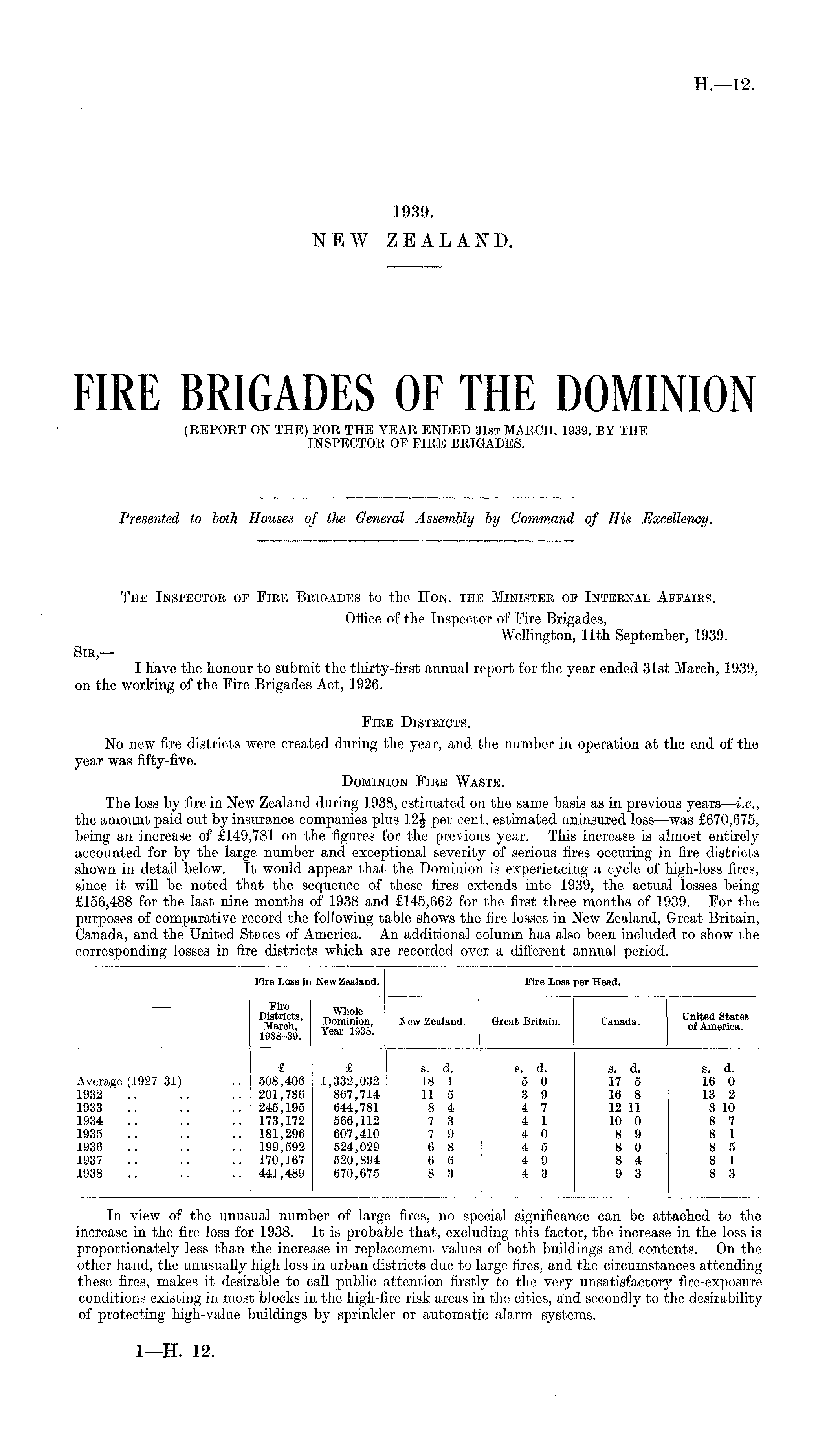 The Inspector of Fire Brigades to the Hon. the Minister of Internal Affairs. Office of the Inspector of Fire Brigades, Wellington, 11th September, 1939. Sir, — I have the honour to submit the thirty-first annual report for the year ended 31st March, 1939, on the working of the Fire Brigades Act, 1926. Fire Districts. No new fire districts were created during the year, and the number in operation at the end of the year was fifty-five. Dominion Fire Waste. The loss by fire in New Zealand during 1938, estimated on the same basis as in previous years—i.e., the amount paid out by insurance companies plus 12J per cent, estimated uninsured loss —was £670,675, being an increase of £14-9,781 on the figures for the previous year. This increase is almost entirely accounted for by the large number and exceptional severity of serious fires occuring in fire districts shown in detail below. It would appear that the Dominion is experiencing a cycle of high-loss fires, since it will be noted that the sequence of these fires extends into 1939, the actual losses being £156,488 for the last nine months of 1938 and £145,662 for the first three months of 1939. For the purposes of comparative record the following table shows the fire losses in New Zealand, Great Britain, Canada, and the United States of America. An additional column has also been included to show the corresponding losses in fire districts which are recorded over a different annual period.