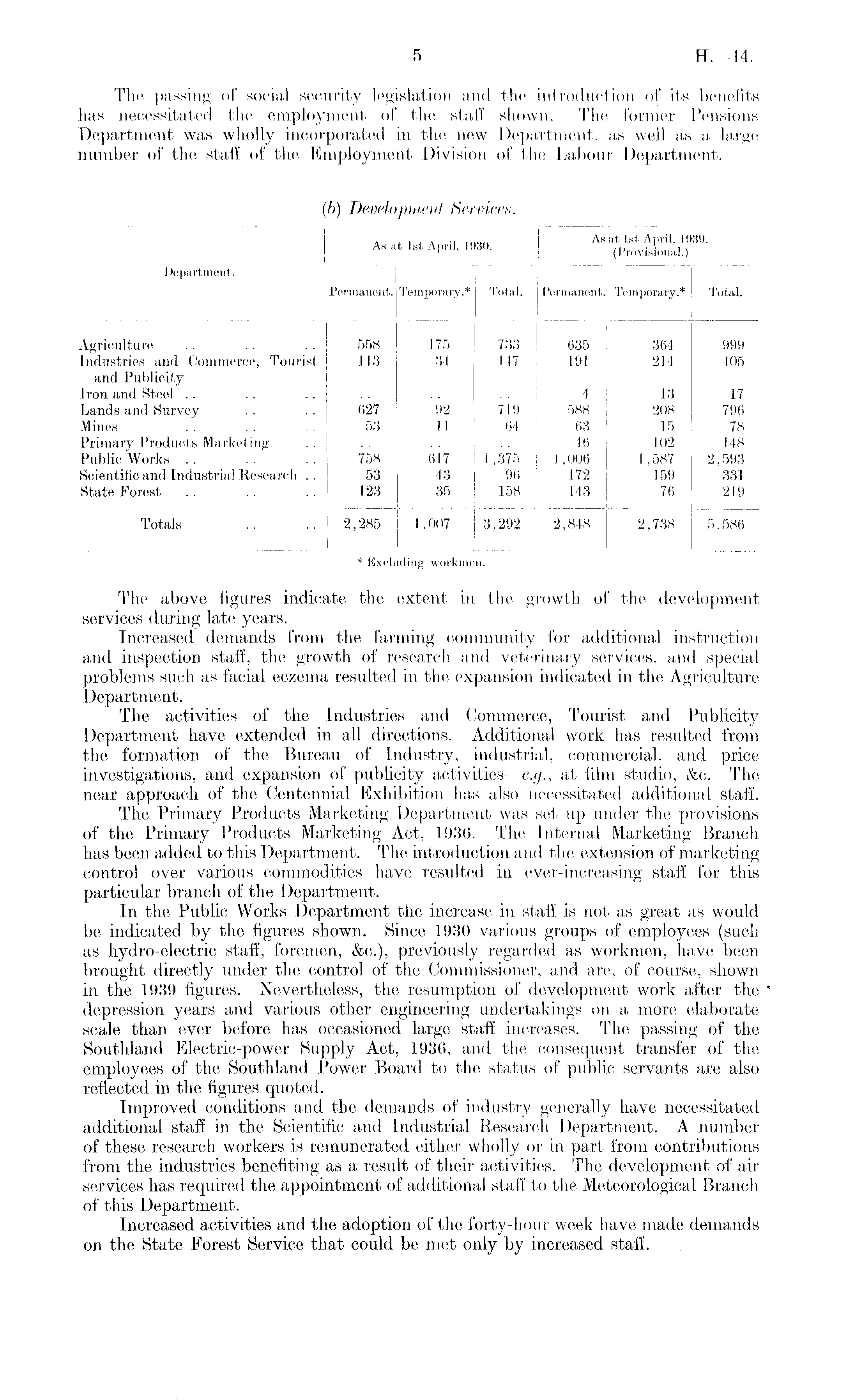 The above figures indicate the extent in the growth of the development services during late years. Increased demands from the farming community for additional instruction and inspection staff, the growth of research and veterinary services, and special problems such as facial eczema resulted in the expansion indicated in the Agriculture Department. The activities of the Industries and Commerce, Tourist and Publicity Department have extended in all directions. Additional work has resulted from the formation of the Bureau of Industry, industrial, commercial, and price investigations, and expansion of publicity activities—e.g., at film studio, &c. The near approach of the Centennial Exhibition has also necessitated additional staff. The Primary Products Marketing Department was set up under the provisions of the Primary Products Marketing Act, 1936. The Internal Marketing Branch has been added to this Department. The introduction and the extension of marketing control over various commodities have resulted in ever-increasing staff for this particular branch of the Department. In the Public Works Department the increase in staff is not as great as would be indicated by the figures shown. Since 1930 various groups of employees (such as hydro-electric staff, foremen, &c.), previously regarded as workmen, have been brought directly under the control of the Commissioner, and are, of course, shown in the 1939 figures. Nevertheless, the resumption of development work after the depression years and various other engineering undertakings on a more elaborate scale than ever before has occasioned large staff increases. The passing of the Southland Electric-power Supply Act, 1936, and the consequent transfer of the employees of the Southland Power Board to the status of public servants are also reflected in the figures quoted. Improved conditions and the demands of industry generally have necessitated additional staff in the Scientific and Industrial Research Department. A number of these research workers is remunerated either wholly or in part from contributions from the industries benefiting as a result of their activities. The development of air services has required the appointment of additional staff to the Meteorological Branch of this Department. Increased activities and the adoption of the forty-hour week have made demands on the State Forest Service that could be met only by increased staff.