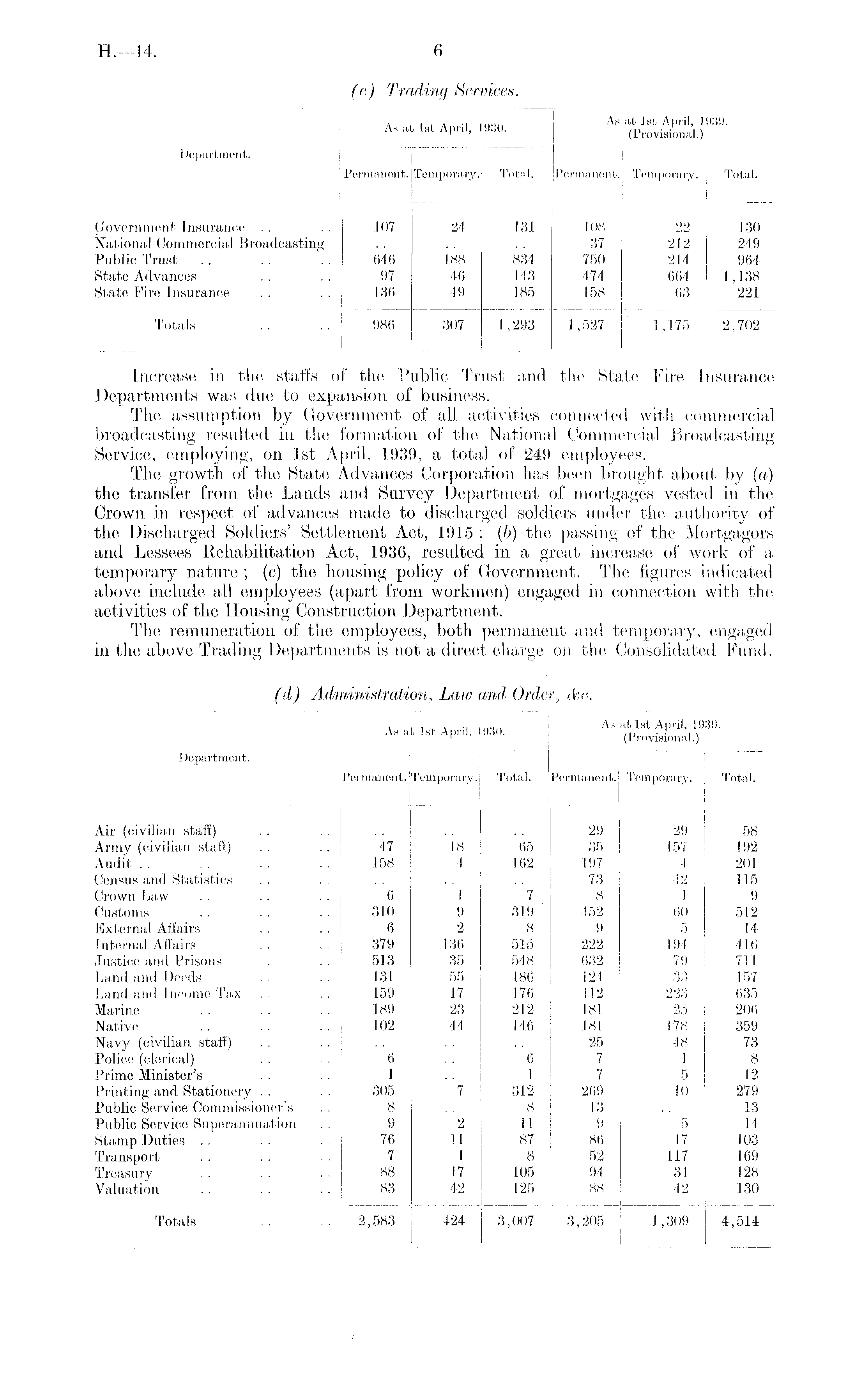 Increase in the staffs of the Public Trust and the State Fire Insurance Departments was due to expansion of business. The assumption by Government of all activities connected with commercial broadcasting resulted in the formation of the National Commercial Broadcasting Service, employing, on Ist April, 1939, a total of 249 employees. The growth of the State Advances Corporation has been brought about by (a) the transfer from the Lands and Survey Department of mortgages vested in the Crown in respect of advances made to discharged soldiers under the authority of the Discharged Soldiers' Settlement Act, 1915 ; (b) the passing of the Mortgagors and Lessees Rehabilitation Act, 1936, resulted in a great increase of work of a temporary nature ; (c) the housing policy of Government. The figures indicated above include all employees (apart from workmen) engaged in connection with the activities of the Housing Construction Department. The remuneration of the employees, both permanent and temporary, engaged in the above Trading Departments is not a direct charge on the Consolidated Fund.