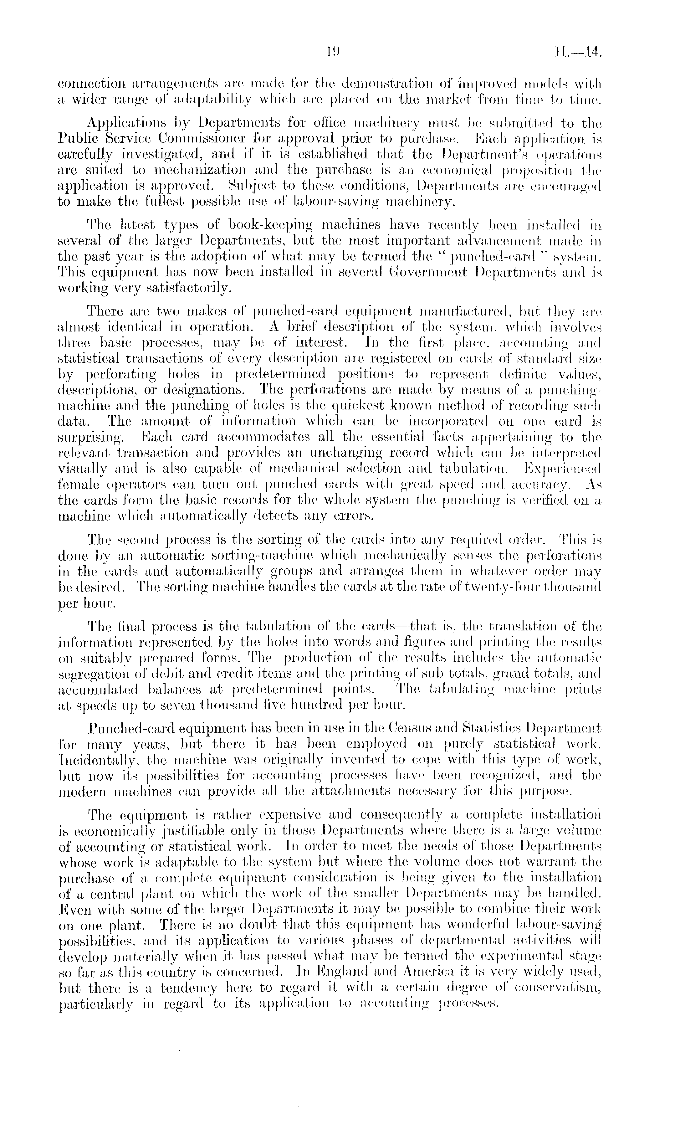 connection arrangements are made for the demonstration of improved models with a wider range of adaptability which are placed on the market from time to time. Applications by Departments for office machinery must be submitted to the Public Service Commissioner for approval prior to purchase. Each application is carefully investigated, and if it is established that the Department's operations are suited to mechanization and the purchase is an economical proposition the application is approved. Subject to these conditions, Departments are encouraged to make the fullest possible use of labour-saving machinery. The latest types of book-keeping machines have recently been installed in several of the larger Departments, but the most important advancement made in the past year is the adoption of what may be termed the " punched-card " system. This equipment has now been installed in several Government Departments and is working very satisfactorily. There are two makes of punched-card equipment manufactured, but they are almost identical in operation. A brief description of the system, which involves three basic processes, may be of interest. In the first place, accounting and statistical transactions of every description are registered on cards of standard size by perforating holes in predetermined positions to represent definite values, descriptions, or designations. The perforations are made by means of a punchingmachine and the punching of holes is the quickest known method of recording such data. The amount of information which can be incorporated on one card is surprising. Each card accommodates all the essential facts appertaining to the relevant transaction and provides an unchanging record which can be interpreted visually and is also capable of mechanical selection and tabulation. Experienced female operators can turn out punched cards with great speed and accuracy. As the cards form the basic records for the whole system the punching is verified on a machine which automatically detects any errors. The second process is the sorting of the cards into any required order. This is done by an automatic sorting-machine which mechanically senses the perforations in the cards and automatically groups and arranges them in whatever order may be desired. The sorting machine handles the cards at the rate of twenty-four thousand per hour. The final process is the tabulation of the cards —that is, the translation of the information represented by the holes into words and figures and printing the results on suitably prepared forms. The production of the results includes the automatic segregation of debit and credit items and the printing of sub-totals, grand totals, ami accumulated balances at predetermined points. The tabulating machine prints at speeds up to seven thousand five hundred per hour. Punched-card equipment has been in use in the Census and Statistics Department for many years, but there it has been employed on purely statistical work. Incidentally, the machine was originally invented to cope with this type of work, but now its possibilities for accounting processes have been recognized, and the modern machines can provide all the attachments necessary for this purpose. The equipment is rather expensive and consequently a complete installation is economically justifiable only in those Departments where there is a large volume of accounting or statistical work. In order to meet the needs of those Departments whose work is adaptable to the system but where the volume does not warrant the purchase of a complete equipment consideration is being given to the installation of a central plant on which the work of the smaller Departments may be handled. Even with some of the larger Departments it may be possible to combine their work on one plant. There is no doubt that this equipment has wonderful labour-saving possibilities, and its application to various phases of departmental activities will develop materially when it has passed what may be termed the experimental stage so far as this country is concerned. In England and America it is very widely used, but there is a tendency here to regard it with a certain degree of conservatism, particularly in regard to its application to accounting processes.