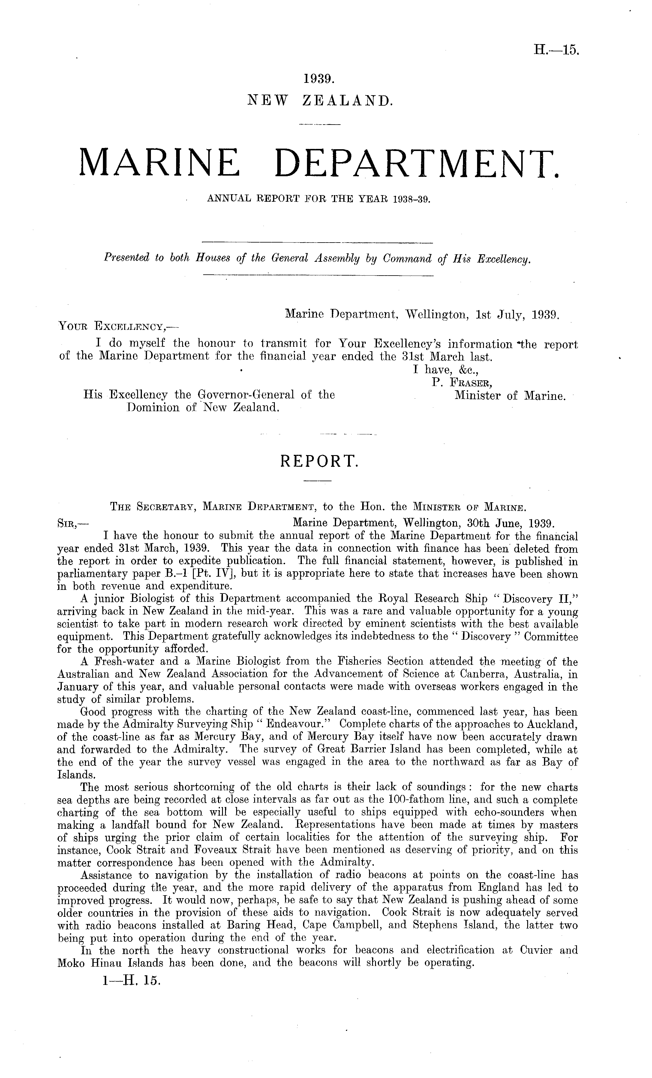 The Secretary, Marine Department, to the Hon. the Minister of Marine. Sir, — Marine Department, Wellington, 30th June, 1939. I have the honour to submit the annual report of the Marine Department for the financial year ended 31st March, 1939. This year the data in connection with finance has been deleted from the report in order to expedite publication. The full financial statement, however, is published in parliamentary paper 8.-l [Pt. IV], but it is appropriate here to state that increases have been shown in both revenue and expenditure. A junior Biologist of this Department accompanied the Royal Research Ship " Discovery II," arriving back in New Zealand in the mid-year. This was a rare and valuable opportunity for a young scientist to take part in modern research work directed by eminent scientists with the best available equipment. This Department gratefully acknowledges its indebtedness to the " Discovery " Committee for the opportunity afforded. A Fresh-water and a Marine Biologist from the Fisheries Section attended the meeting of the Australian and New Zealand Association for the Advancement of Science at Canberra, Australia, in January of this year, and valuable personal contacts were made with overseas workers engaged in the study of similar problems. Good progress with the charting of the New Zealand coast-line, commenced last year, has been made by the Admiralty Surveying Ship " Endeavour." Complete charts of the approaches to Auckland, of the coast-line as far as Mercury Bay, and of Mercury Bay itself have now been accurately drawn and forwarded to the Admiralty. The survey of Great Barrier Island has been completed, while at the end of the year the survey vessel was engaged in the area to the northward as far as Bay of Islands. The most serious shortcoming of the old charts is their lack of soundings : for the new charts sea depths are being recorded at close intervals as far out as the 100-fathom line, and such a complete charting of the sea bottom will be especially useful to ships equipped with echo-sounders when making a landfall bound for New Zealand. Representations have been made at times by masters of ships urging the prior claim of certain localities for the attention of the surveying ship. For instance, Cook Strait and Foveaux Strait have been mentioned as deserving of priority, and on this matter correspondence has been opened with the Admiralty. Assistance to navigation by the installation of radio beacons at points on the coast-line has proceeded during the year, and the more rapid delivery of the apparatus from England has led to improved progress. It would now, perhaps, be safe to say that New Zealand is pushing ahead of some older countries in the provision of these aids to navigation. Cook Strait is now adequately served with radio beacons installed at Baring Head, Cape Campbell, and Stephens Island, the latter two being put into operation during the end of the year. In the north the heavy constructional works for beacons and electrification at Cuvier and Moko Hinau Islands has been done, and the beacons will shortly be operating.