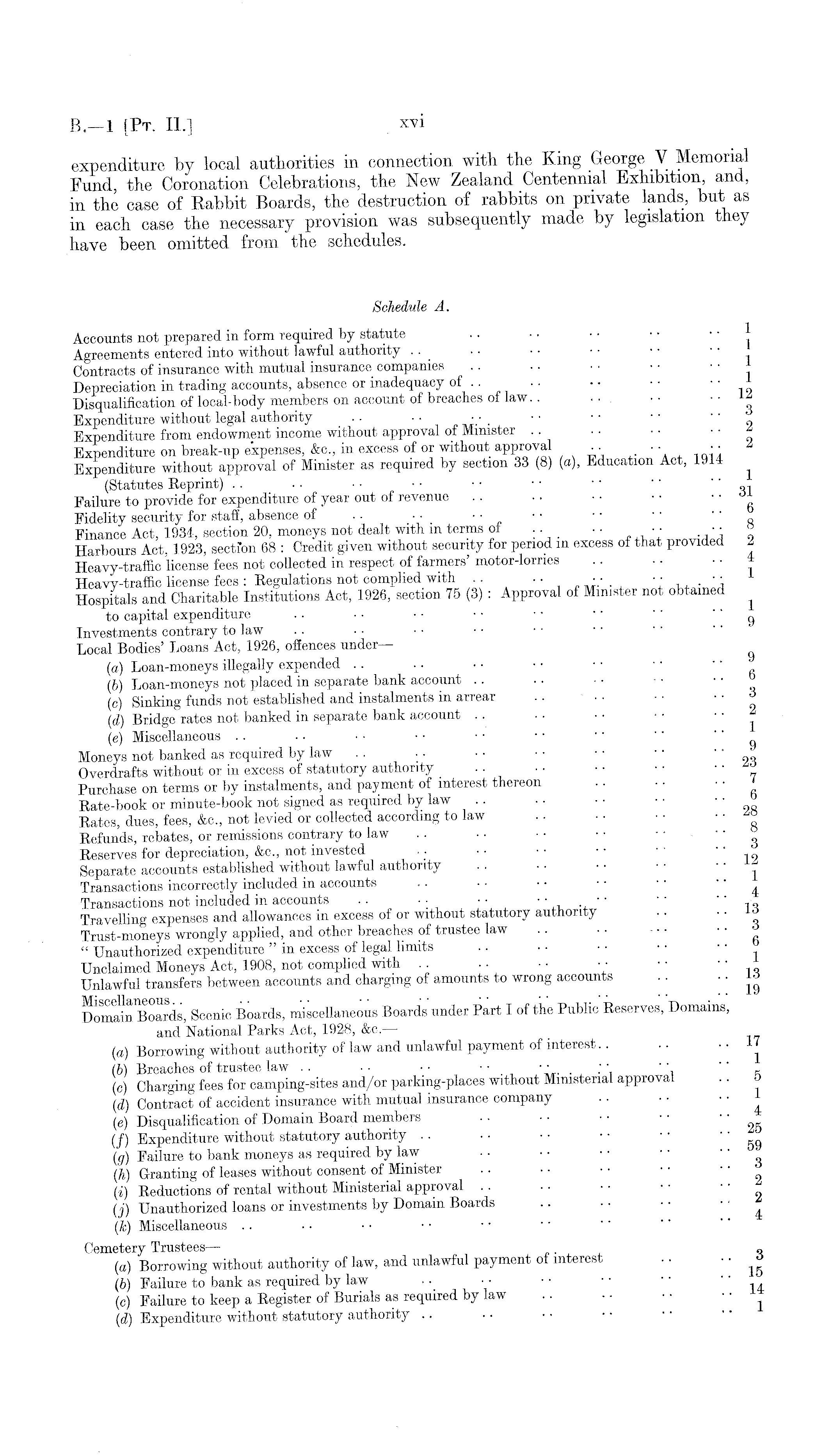 expenditure by local authorities in connection with the King George V Memorial Fund the Coronation Celebrations, the New Zealand Centennial Exhibition, and, in the case of Rabbit Boards, the destruction of rabbits on private lands, but as in each case the necessary provision was subsequently made by legislation they have been omitted from the schedules. Schedule A. Accounts not prepared in form required by statute .. • • • • • • 1 Agreements entered into without lawful authority . . . • • • • • * Contracts of insurance with mutual insurance companies . . .. • • • • • • Depreciation in trading accounts, absence or inadequacy of .. • • • • • • "19 Disqualification of local-body members on account of breaches of law.. .. ' 3 Expenditure without legal authority .. "" , »• , " ' ' ' ' "9 Expenditure from endowment income without approval of Minister . . .. ■ ■ • • £ Expenditure on break-up expenses, &c. ; in excess of or without approval .. . ■ Expenditure without approval of Minister as required by section 33 (8) (a), Education Act, 1914 (Statutes Reprint) .... • • ■ • • • • ■ • • ' ' 31 Failure to provide for expenditure of year out of revenue . . • • ■ • • • 6 Fidelity security for stafi, absence of . . ■■ . • • • • • • '' „ Finance Act, 1934, section 20, moneys not dealt with m terms of . . • • • • • • Harbours Act, 1923, section 68 : Credit given without security for period in excess of that provided 2 Heavy-traffic license fees not collected in respect of farmers' motor-lorries .. .. j Heavy-traffic license fees : Regulations not complied with .. .. •; ' Hospitals and Charitable Institutions Act, 1926, section 75 (3) : Approval of Minister not obtained to capital expenditure .. ■ • • • • ■ • • • • " " 0 Investments contrary to law Local Bodies' Loans Act, 1926, ofEences under— (a) Loan-moneys illegally expended .. .. • • • ■ • • • • • • (b) Loan-moneys not placed in separate bank account . . . . • • • • (c) Sinking funds not established and instalments in arrear ... •.. ■ • ■ ■ £ (d) Bridge rates not banked in separate bank account (e) Miscellaneous . . .. • • • • • • • • • • " Moneys not banked as required by law .. • • ■ ■ • ■ • • "03 Overdrafts without or in excess of statutory authority . . • • • • • • • • Purchase on terms or by instalments, and payment of interest thereon . . • ■ • • Rate-book or minute-book not signed as required by law .. • • • ■ " ° Rates, dues, fees, &c., not levied or collected according to law . • • ■ ■ • Refunds, rebates, or remissions contrary to law .. • • • ■ 3 Reserves for depreciation, &c., not invested .. • • • • • • • • Separate accounts established without lawful authority .. • • ■ • • ■ j Transactions incorrectly included in accounts . . • • • • • • • ■ Transactions not included in accounts . . • ■ • ■ • • • • • • n Travelling expenses and allowances in excess of or without statutory authority • . • • Trust-moneys wrongly applied, and other breaches of trustee law .. • ■ -• • • • " Unauthorized expenditure " in excess of legal limits .. • • • • • • ■ • Unclaimed Moneys Act, 1908, not complied with .. • • • • • • " . Unlawful transfers between accounts and charging of amounts to wrong accounts . . 19 Domain Boards, Scenic Boards, miscellaneous Boards under Part I of the Public Reserves, Domains, and National Parks Act, 1928, &c.— (a) Borrowing without authority of law and unlawful payment of interest.. . ■ (b) Breaches of trustee law .. .. •• •• ■■ ;• '' " (0) Charging fees for camping-sites and/or parking-places without Ministerial approval . . 0 (d) Contract of accident insurance with mutual insurance company .. • • "4 (e) Disqualification of Domain Board members .. • • • ■ • • "25 (/) Expenditure without statutory authority . . . ■ ■ • • • • • "59 (g) Failure to bank moneys as required by law • • • • ■ ■ • ■ • ■ (h) Granting of leases without consent of Minister .. . ■ ■ • • • • • (1) Reductions of rental without Ministerial approval . . .. ■ ■ • • (j) Unauthorized loans or investments by Domain Boards .. ■ • ■ • (k) Miscellaneous Cemetery Trustees — p . o (a) Borrowing without authority of law, and unlawful payment of interest .. (b) Failure to bank as required by law . • • ■ • • ■ • * "14 (c) Failure to keep a Register of Burials as required by law .. • • • • (d) Expenditure without statutory authority ..