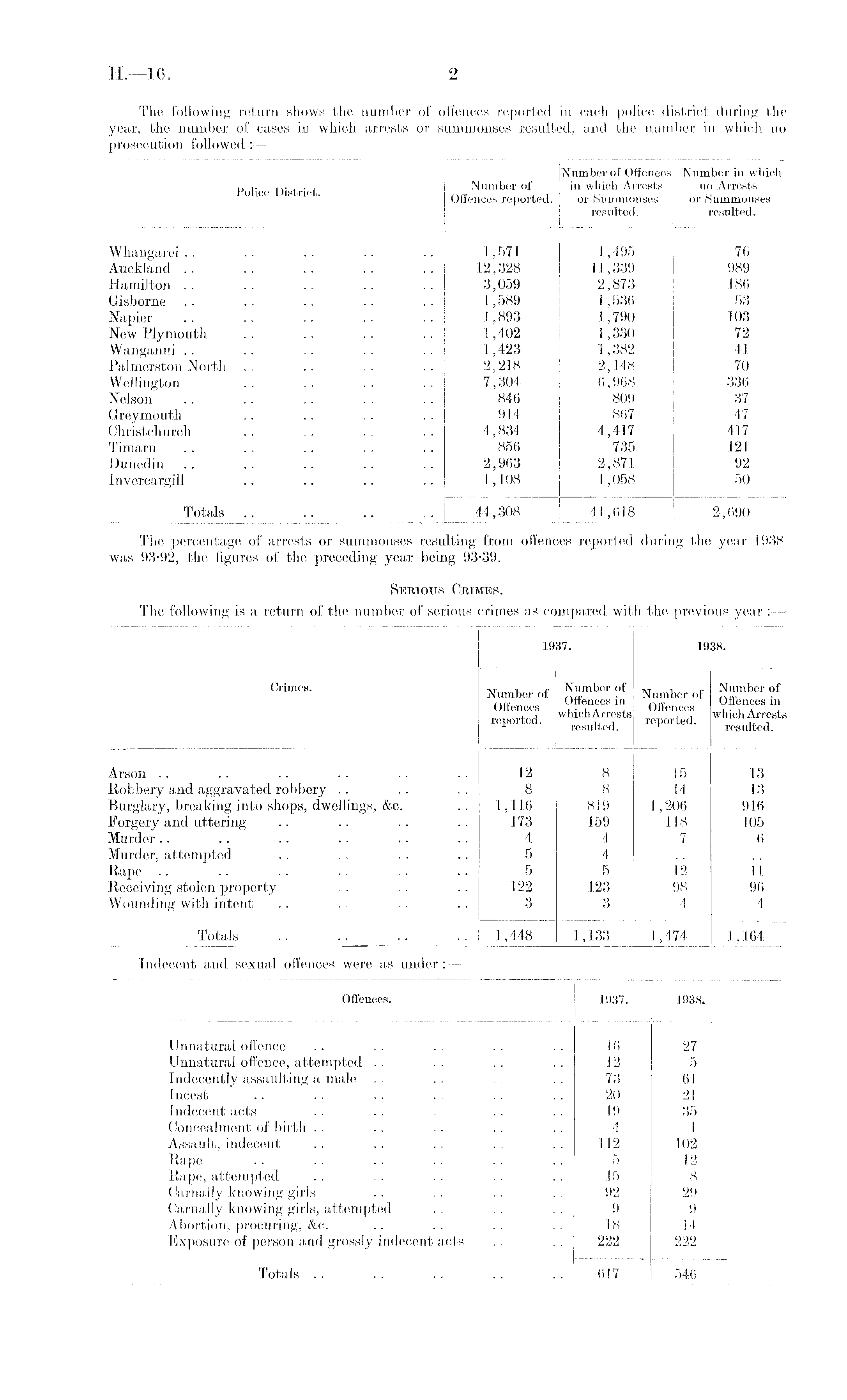 The percentage of arrests or summonses resulting from offences reported during the year 1938 was 93-92, the figures of the preceding year being 93-39.