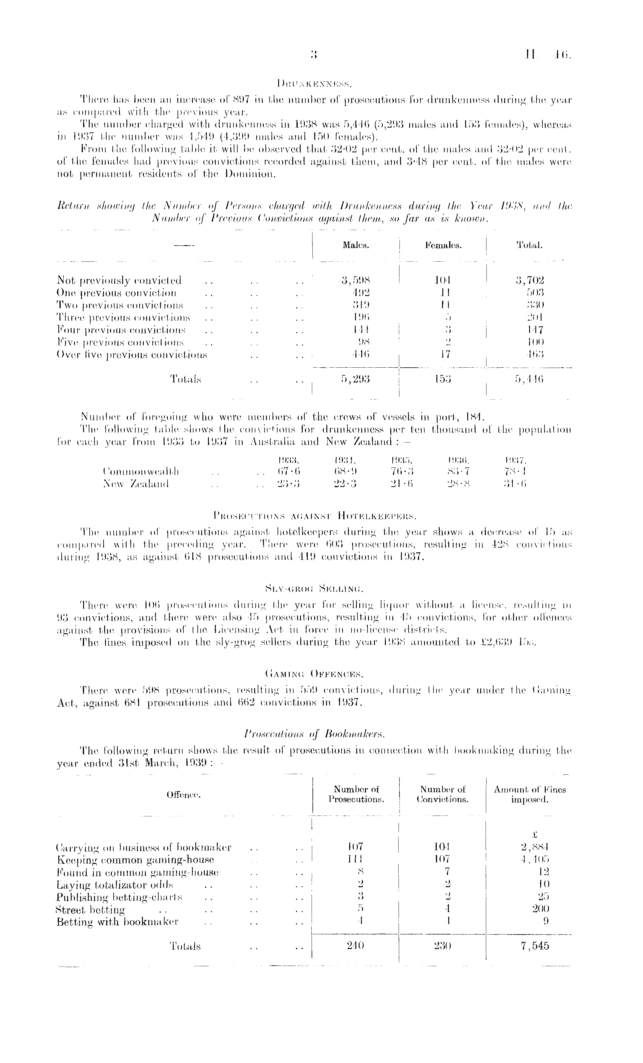 Number of foregoing who were members of the crews of vessels in port, 184. The following table shows the convictions for drunkenness per ten thousand of the population for each year from 1933 to 1937 in Australia and New Zealand :— 1933. 1934. 1935. 1936. 1937. Commonwealth .. .. 67-6 68-9 76-3 83-7 78-4 New Zealand .. .. 23-3 22-3 21-6 28-8 31-6 Prosecutions against Hotelkeepers. The number of prosecutions against hotelkeepers during the year shows a decrease of 15 as compared with the preceding year. There were 603 prosecutions, resulting in 428 convictions during 1938, as against 618 prosecutions and 419 convictions in 1937. Sly-grog Selling. There were 106 prosecutions during the year for selling liquor without a license, resulting in 93 convictions, and there were also 45 prosecutions, resulting in 45 convictions, for other offences against the provisions of the Licensing Act in force in no-license districts. The fines imposed on the sly-grog sellers during the year 1938 amounted to, £2,639 15s. Gaming Offences. There were 598 prosecutions, resulting in 559 convictions, during the year under the Gaming Act, against 681 prosecutions and 662 convictions in 1937. Prosecutions of Bookmakers. The following return shows the result of prosecutions in connection with bookmaking during the year ended 31st March, 1939 : —