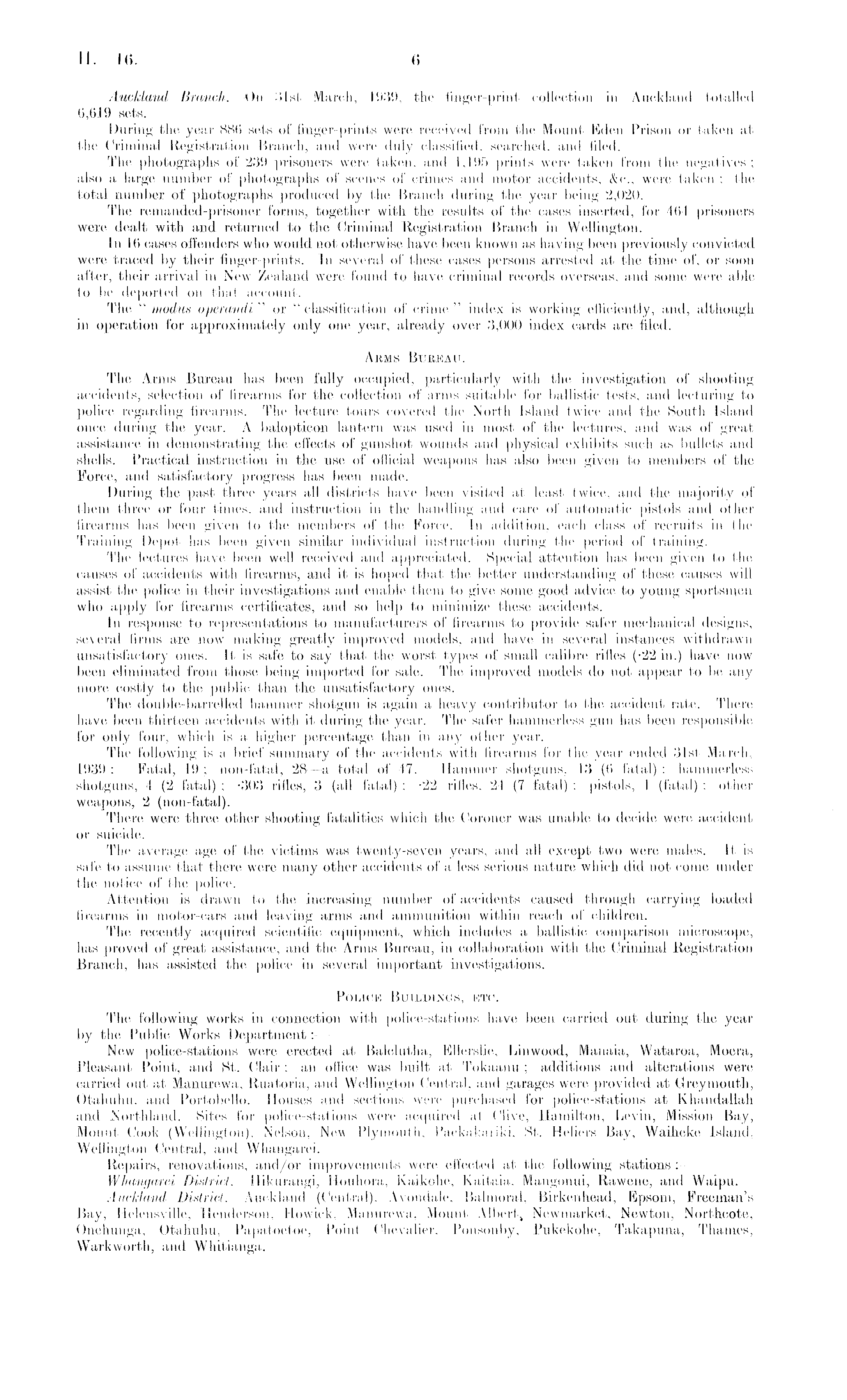 Auckland Branch. —On 31st March, 1939, the finger-print collection in Auckland totalled 6,619 sets. During the year 886 sets of finger-prints were received from the Mount Eden Prison or taken at the Criminal Registration Branch, and were duly classified, searched, and filed. The photographs of 239 prisoners were taken, and 1,! 95 prints were taken from the negatives ; also a large number of photographs of scenes of crimes and motor accidents, &c., were taken ; the total number of photographs produced by the Branch during the year being 2,020. The remanded-prisoner forms, together with the results of the cases inserted, for 464 prisoners were dealt with and returned to the Criminal Registration Branch in Wellington. In 16 cases offenders who would not otherwise have been known as having been previously convicted were traced by their finger-prints. In several of these cases persons arrested at the time of, or soon after, their arrival in New Zealand were found to have criminal records overseas, and some were able to be deported on that account. The " modus operandi " or " classification of crime " index is working efficiently, and, although in operation for approximately only one year, already over 3,000 index cards are filed. Akms Bureau. The Arms Bureau has been fully occupied, particularly with the investigation of shooting accidents, selection of firearms for the collection of arms suitable for ballistic tests, and lecturing to police regarding firearms. The lecture tours covered the North Island twice and the South Island once during the year. A balopticon lantern was used in most of the lectures, and was of great assistance in demonstrating the effects of gunshot woixnds and physical exhibits such as bullets and shells. Practical instruction in the use of official weapons has also been given to members of the Force, and satisfactory progress has been made. During the past three years all districts have been visited at least twice, and the majority of them three or four times, and instruction in the handling and care of automatic pistols and other firearms has been given to the members of the Force. In addition, each class of recruits in the Training Depot has been given similar individual instruction during the period of training. The lectures have been well received and appreciated. Special attention has been given to the causes of accidents with firearms, and it is hoped that the better understanding of these causes will assist the police in their investigations and enable them to give some good advice to young sportsmen who apply for firearms certificates, and so help to minimize these accidents. In response to representations to manufacturers of firearms to provide safer mechanical designs, several firms are now making greatly improved models, and have in several instances withdrawn unsatisfactory ones. It is safe to say that the worst types of small calibre rifles (-22 in.) have now been eliminated from those being imported for sale. The improved models do not appear to be any more costly to the public than the unsatisfactory ones. The double-barrelled hammer shotgun is again a heavy contributor to the accident rate. There have been thirteen accidents with it during the year. The safer hammerless gun has been responsible for only four, which is a higher percentage than in any other year. The following is a brief summary of the accidents with firearms for the year ended 31st March, 1939 : Fatal, 19 ; non-fatal, 28 —a total of 47. Hammer shotguns, 13 (6 fatal) ; hammerless shotguns, 4 (2 fatal) ; -303 rifles, 3 (all fatal) ; -22 rifles, 24 (7 fatal) ; pistols, 1 (fatal) ; other weapons, 2 (non-fatal). There were three other shooting fatalities which the Coroner was unable to decide were accident or suicide. The average age of the victims was twenty-seven years, and all except two were males. It is safe to assume that there were many other accidents of a less serious nature which did not come under the notice of the police. Attention is drawn to the increasing number of accidents caused through carrying loaded firearms in motor-cars and leaving arms and ammunition within reach of children. The recently acquired scientific equipment, which includes a ballistic comparison microscope, has proved of great assistance, and the Arms Bureau, in collaboration with the Criminal Registration Branch, has assisted the police in several important investigations. Police Buildings, etc. The following works in connection with police-stations have been carried out during the year by the Public Works Department:— New police-stations were erected at Balclutha, Ellerslie, Linwood, Manaia, Wataroa, Moera, Pleasant Point, and St. Clair ; an office was built at Tokaanu ; additions and alterations were carried out at Manurewa, Ruatoria, and Wellington Central, and garages were provided at Greymouth, Otahuhu, and Portobello. Houses and sections were purchased for police-stations at Khandallah and Northland. Sites for police-stations were acquired at Clive, Hamilton, Levin, Mission Bay, Mount Cook (Wellington), Nelson, New Plymouth, Paekakariki, St. Heliers Bay, Waiheke Island, Wellington Central, and Whangarei. Repairs, renovations, and/or improvements were effected at the following stations : — Whangarei District.—Hikurangi, Houhora, Kaikohe, Kaitaia, Mangonui, Rawene, and Waipu. Auckland, District. —Auckland (Central), Avondale, Balmoral, Birkenhead, Epsom, Freeman's Bay, Helensville, Henderson, Howick, Manurewa, Mount Albert, Newmarket, Newton, Northcote, Onehunga, Otahuhu, Papatoetoe, Point Chevalier, Ponsonby, Pukekohe, Takapuna, Thames, Warkworth, and Whitianga.