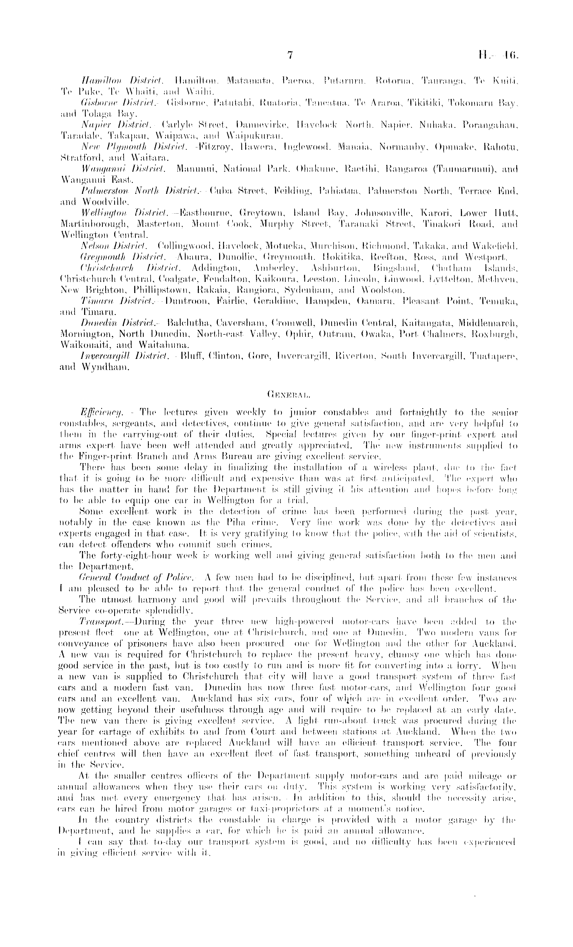 Hamilton District.—Hamilton, Mataraata, Paeroa, Putaruru, Rotorua, Tauranga, To Kuiti, Te Puke, Te Whaiti, and Waihi. Gisborne District. —Gisborne, Patutahi, Ruatoria, Taneatua, Te Araroa, Tikitiki, Tokomaru Bay, and Tolaga Bay. Napier District.—Carlyle Street, Dannevirke, Havelock North, Napier, Nuhaka, Porangahau, Taradale, Takapau, Waipawa, and Waipukurau. New Plymouth District.—Fitzroy, Hawera, Inglewood, Manaia, Normanby, Opunake, Rahotu, Stratford, and Waitara. Wanganui District.—Manunui, National Park, Ohakune, Raetihi, Rangaroa (Taumarunui), and Wanganui East. Palmerston North District. —Cuba Street, Feilding, Pahiatua, Palmerston North, Terrace End, and Woodville. Wellington District. —Eastbourne, Greytown, Island Bay, Johnsonville, Karori, Lower Hutt, Martinborough, Masterton, Mount Cook, Murphy Street, Taranaki Street, Tinakori Road, and Wellington Central. Nelson District. —Collingwood, Havelock, Motueka, Murchison, Richmond, Takaka, and Wakefield. Greymouth District.—Ahaura, Dunollie, Greymouth, Hokitika, Reefton, Ross, and Westport. Christchurch District. —Addington, Amberley, Ashburton, Bingsland, Chatham Islands, Christchurc.h Central, Coalgate, Fendalton., Kaikoura, Leeston, Lincoln, Lin wood, Lyttelton, Methven, New Brighton, Phillipstown, Rakaia, Rangiora, Sydenham, and Woolston. Timaru District.—Duntroon, Fairlie, Geraldine, Hampden, Oamaru, Pleasant Point, Temuka, and Timaru. Dunedin District. —Balclutha, Caversham, Cromwell, Dunedin Central, Kaitangata, Middlemarch, Mornington, North Dunedin, North-east Valley, Ophir, Outram, Owaka, Port Chalmers, Roxburgh, Waikouaiti, and Waitahuna. Invercargill District. —Bluff, Clinton, Gore, Invercargill, Riverton, South Invercargill, Tuatapere, and Wyndham. General. Efficiency. — The lectures given weekly to junior constables and fortnightly to the senior constables, sergeants, and detectives, continue to give general satisfaction, and are very helpful to them in the carrying-out of their duties. Special lectures given by our finger-print expert and arms expert have been well attended and greatly appreciated. The new instruments supplied to the Finger-print Branch and Arms Bureau are giving excellent service. There has been some delay in finalizing the installation of a wireless plant, due to the fact that it is going to be more difficult and expensive than was at first anticipated. The expert who has the matter in hand for the Department is still giving it his attention and hopes before long to be able to equip one car in Wellington for a trial. Some excellent work in the detection of crime has been performed during the past year, notably in the case known as the Piha crime. Very fine work was done by the detectives and experts engaged in that case. It is very gratifying to know that the police, with the aid of scientists, can detect offenders who commit such crimes. The forty-eight-hour week is working well and giving general satisfaction both to the men and the Department. General Conduct of Police. —A few men had to be disciplined, but apart from these few instances I am pleased to be able to report that the general conduct of the police has been excellent. The utmost harmony and good will prevails throughout the Service, and all branches of the Service co-operate splendidly. Transport.—During the year three new high-powered motor-cars have been added to the present fleet—one at Wellington, one at Christchurch, and one at Dunedin. Two modern vans for conveyance of prisoners have also been procured —one for Wellington and the other for Auckland. A new van is required for Christchurch to replace the present heavy, clumsy one which has done good service in the past, but is too costly to run and is more fit for converting into a lorry. When a new van is supplied to Christchurch that city will have a good transport system of three fast cars and a modern fast van. Dunedin has now three fast motor-cars, and Wellington four good cars and an excellent van. Auckland has six cars, four of are in excellent order. Two are now getting beyond their usefulness through age and will require to be replaced at an early date. The new van there is giving excellent service. A light run-about truck was procured during the year for cartage of exhibits to and from Court and between stations at Auckland. When the two cars mentioned above are replaced Auckland will have, an efficient transport service. The four chief centres will then have an excellent fleet of fast transport, something unheard of previously in the Service. At the smaller centres officers of the Department supply motor-cars and are paid mileage or annual allowances when they use their cars on duty. This system is working very satisfactorily, and has met every emergency that has arisen. In addition to this, should the necessity arise, cars can be hired from motor garages or taxi-proprietors at a moment's notice. In the country districts the constable in charge is provided with a motor garage by the Department, and he supplies a car, for which he is paid an annual allowance. I can say that to-day our transport system is good, and no difficulty has been experienced in giving efficient service with it.