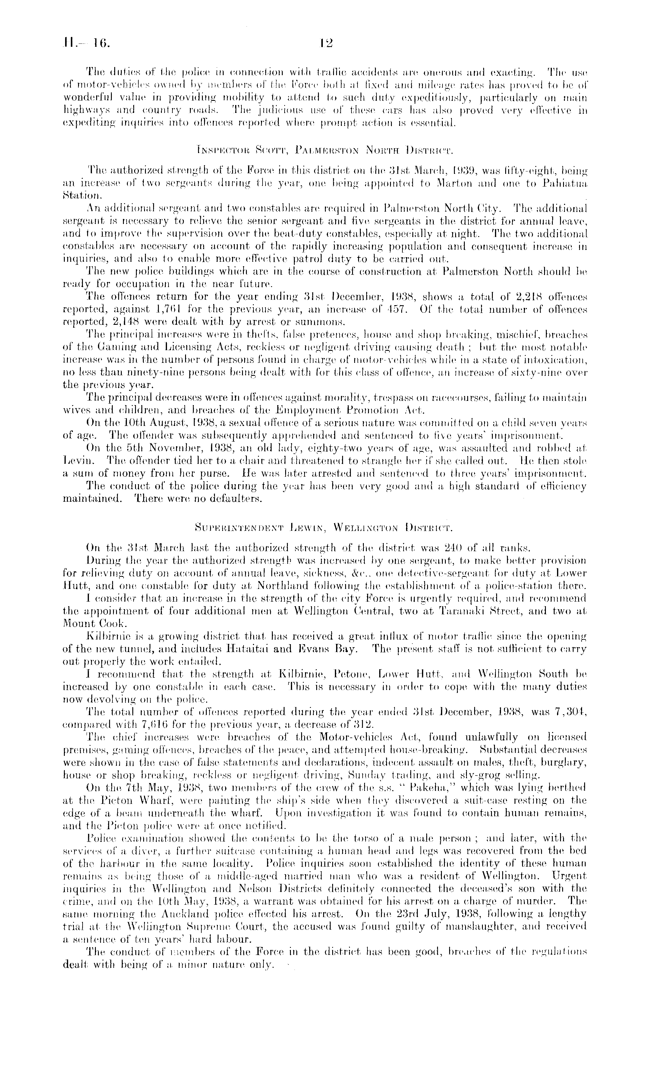 The duties of the police in connection with traffic accidents are onerous and exacting. The use of motor-vehicles owned by members of the Force both at fixed and mileage rates has proved to be of wonderful value in providing mobility to attend to such duty expeditiously, particularly on main highways and country roads. The judicious use of these cars has also proved very effective in expediting inquiries into offences reported where prompt action is essential. Inspector Scott, Palmerston North District. The authorized strength of the Force in this district on the 31st March, 1939, was fifty-eight, being an increase of two sergeants during the year, one being appointed to Marton and one to Pahiatua Station. An additional sergeant and two constables are required in Palmerston North City. The additional sergeant is necessary to relieve the senior sergeant and five sergeants in the district for annual leave, and to improve the supervision over the beat-duty constables, especially at night. The two additional constables are necessary on account of the rapidly increasing population and consequent increase in inquiries, and also to enable more effective patrol duty to be carried out. The new police buildings which are in the course of construction at Palmerston North should be ready for occupation in the near future. The offences return for the year ending 31st December, 1938, shows a total of 2,218 offences reported, against 1,761 for the previous year, an increase of 457. Of the total number of offences reported, 2,148 were dealt with by arrest or summons. The principal increases were in thefts, false pretences, house and shop breaking, mischief, breaches of the Gaming and Licensing Acts, reckless or negligent driving causing death ; but the most notable increase was in the number of persons found in charge of motor-vehicles while in a state of intoxication, no less than ninety-nine persons being dealt with for this class of offence, an increase of sixty-nine over the previous year. The principal decreases were in offences against morality, trespass on racecourses, failing to maintain wives and children, and breaches of the Employment Promotion Act. On the 10th August, 1938, a sexual offence of a serious nature was committed on a child seven years of age. The ofEender was subsequently apprehended and sentenced to five years' imprisonment. On the sth November, 1938, an old lady, eighty-two years of age, was assaulted and robbed at Levin. The offender tied her to a chair and threatened to strangle her if she called out. He then stole a sum of money from her purse. He was later arrested and sentenced to three years' imprisonment. The conduct of the police during the year has been very good and a high standard of efficiency maintained. There were no defaulters. Superintendent Lewin, Wellington District. On the 31st March last the authorized strength of the district was 240 of all ranks. During the year the authorized strength was increased by one sergeant, to make better provision for relieving duty on account of annual leave, sickness, &c., one detective-sergeant for duty at Lower Hutt, and one constable for duty at Northland following the establishment of a police-station there. I consider that an increase in the strength of the city Force is urgently required, and recommend the appointment of four additional men at Wellington Central, two at Taranaki Street, and two at Mount Cook. Kilbirnie is a growing district that has received a great influx of motor traffic since the opening of the new tunnel, and includes Hataitai and Evans Bay. The present staff is not sufficient to carry out properly the work entailed. I recommend that the strength at Kilbirnie, Petone, Lower Hutt, and Wellington South be increased by one constable in each case. This is necessary in order to cope with the many duties now devolving on the police. The total number of offences reported during the year ended 31st December, 1938, was 7,304, compared with 7,616 for the previous year, a decrease of 312. The chief increases were breaches of the Motor-vehicles Act, found unlawfully on licensed premises, gaming offences, breaches of the peace, and attempted house-breaking. Substantial decreases were shown in the case of false statements and declarations, indecent assault on males, theft, burglary, house or shop breaking, reckless or negligent driving, Sunday trading, and sly-grog selling. On the 7th May, 1938, two members of the crew of the s.s. " Pakeha," which was lying berthed at the Picton Wharf, were painting the ship's side when they discovered a suit-case resting on the edge of a beam underneath the wharf. Upon investigation it was found to contain human remains, and the Picton police were at once notified. Police examination showed the contents to be the torso of a male person ; and later, with the services of a diver, a further suitcase containing a human head and legs was recovered from the bed of the harbour in the same locality. Police inquiries soon established the identity of these human remains as being those of a middle-aged married man who was a resident of Wellington. Urgent inquiries in the Wellington and Nelson Districts definitely connected the deceased's son with the crime, and on the 10th May, 1938, a warrant was obtained for his arrest on a charge of murder. The same morning the Auckland police effected his arrest. On the 23rd July, 1938, following a lengthy trial at the Wellington Supreme Court, the accused was found guilty of manslaughter, and received a sentence of ten years' hard labour. The conduct of members of the Force in the district has been good, breaches of the regulations dealt with being of a minor nature only. •