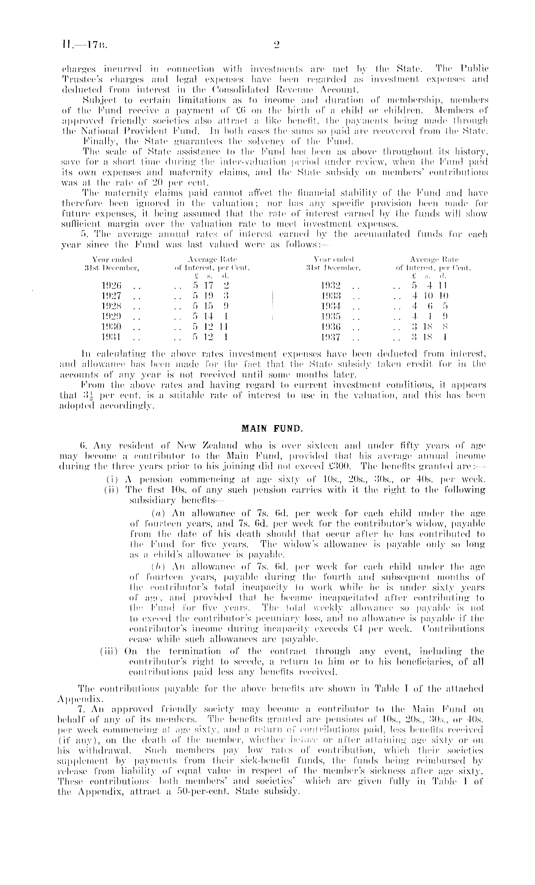 charges incurred in connection with investments are met by the State. The Public Trustee's charges and legal expenses have been regarded as investment expenses and deducted from interest in the Consolidated Revenue Account. Subject to certain limitations as to income and duration of membership, members of the Fund receive a payment of £6 on the birth of a child or children. Members of approved friendly societies also attract a like benefit, the payments being made through the National Provident Fund. In both cases the sums so paid are recovered from the State. Finally, the State guarantees the solvency of the Fund. The scale of State assistance to the Fund has been as above throughout its history, save for a short time during the inter-valuation period under review, when the Fund paid its own expenses and maternity claims, and the State subsidy on members' contributions was at the rate of 20 per cent. The maternity claims paid cannot affect the financial stability of the Fund and have therefore been ignored in the valuation; nor has any specific provision been made for future expenses, it being assumed that the rate of interest earned by the funds will show sufficient margin over the valuation rate to meet investment expenses. 5. The average annual rates of interest earned by the accumulated funds for each year since the Fund was last valued were as follows:— Year ended Average Rate Year ended Average Rate 31st December, of Interest, per Cent. 31st December, of Interest, per Gent. £ s. d. £ s. d. 1926 .. .. 5 17 2 1932 .. .. 5 4 11 1927 . . . . 5 19 3 1933 .. . . 410 10 1928 .. .. 5 15 9 1934 .. ..465 1929 .. .. 5 14 1 1935 .. ..419 1930 .. .. 5 12 11 1936 .. .. 318 8 1931 .. .. 5 12 1 1937 .. .. 3 18 1 In calculating the above rates investment expenses have been deducted from interest, and allowance lias been made for the fact that the State subsidy taken credit for in the accounts of any year is not received until some months later. From the above rates and having regard to current investment conditions, it appears that 3J per cent, is a suitable rate of interest to use in the valuation, and this has been adopted accordingly. MAIN FUND. 6. Any resident of New Zealand who is over sixteen and under fifty years of age may become a contributor to the Main Fund, provided that his average annual income during the three years prior to his joining did not exceed £300. The benefits granted are: — (i) A pension commencing at age sixty of 10s., 205., 305., or 40s. per week. (ii) The first 10s. of any such pension carries with it the right to the following subsidiary benefits— (a) An allowance of 7s. 6d. per week for each child under the age of fourteen years, and 7s. 6d. per week for the contributor's widow, payable from the date of his death should that occur after he has contributed to the Fund for five years. The widow's allowance is payable only so long as a child's allowance is payable. (b) An allowance of 7s. 6d. per week for each child under the age of fourteen years, payable during the fourth and subsequent months of the contributor's total incapacity to work while he is under sixty years of age, and provided that he became incapacitated after contributing to the Fund for five years. The total weekly allowance so payable is not to exceed the contributor's pecuniary loss, and no allowance is payable if the contributor's income during incapacity exceeds £4 per week. Contributions cease while such allowances are payable. (iii) On the termination of the contract through any event, including the contributor's right to secede, a return to him or to his beneficiaries, of all contributions paid less any benefits received. The contributions payable for the above benefits are shown in Table I of the attached Appendix. 7. An approved friendly society may become a contributor to the Main Fund on behalf of any of its members. The benefits granted arc pensions of 10s., 205., 305., or 40s. per week commencing at age sixty, and a return of contributions paid, less benefits received (if any), on the death of the member, whether before or after attaining age sixty or on his withdrawal. Such members pay low rates of contribution, which their societies supplement by payments from their sick-benefit funds, the funds being reimbursed by release from liability of equal value in respect of the member's sickness after age sixty. These contributions —both members' and societies'—which are given fully in Table I of the Appendix, attract a 50-per-cent. State subsidy.