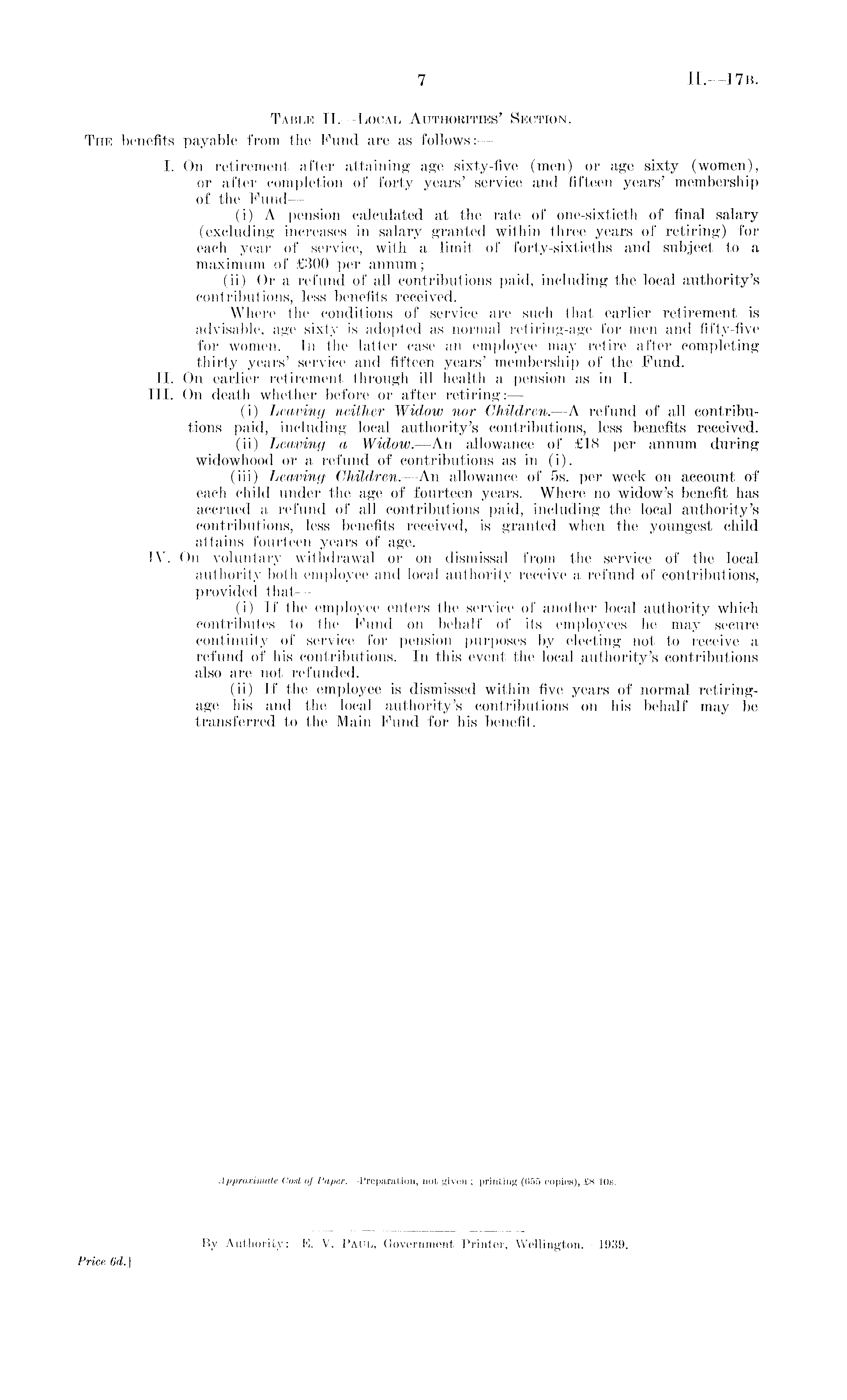 Table ll.—Local Authorities' Section. The benefits payable from the Fund are as follows:— I. On retirement after attaining age sixty-five (men) or age sixty (women), or after completion of forty years' service and fifteen years' membership of the Fund— (i) A pension calculated at the rate of one-sixtieth of final salary (excluding increases in salary granted within three years of retiring) for each year of service, with a limit of forty-sixtieths and subject to a maximum of £300 per annum; (ii) Or a refund of all contributions paid, including the local authority's contributions, less benefits received. Where the conditions of service are such that earlier retirement is advisable, age sixty is adopted as normal retiring-age for men and fifty-five for women. In the latter case an employee may retire after completing thirty years' service and fifteen years' membership of the Fund. 11. On earlier retirement through ill health a pension as in I. 111. On death whether before or after retiring:— (i) Leaving neither Widow nor Children. —A refund of all contributions paid, including local authority's contributions, less benefits received. (ii) Leaving a Widow.—An allowance of £18 per annum during widowhood or a refund of contributions as in (i). (iii) Leaving Children. —An allowance of ss. per week on account of each child under the age of fourteen years. Where no widow's benefit has accrued a refund of all contributions paid, including the local authority's contributions, less benefits received, is granted when the youngest child attains fourteen years of age. IY. On voluntary withdrawal or on dismissal from the service of the local authority both employee and local authority receive a refund of contributions, provided that — (i) If the employee enters the service of another local authority which contributes to the Fund on behalf of its employees he may secure continuity of service for pension purposes by electing not to receive a refund of his contributions. In this event the local authority's contributions also are not refunded. (ii) If the employee is dismissed within five years of normal retiringage bis and the local authority's contributions on his behalf may be transferred to the Main Fund for his benefit.