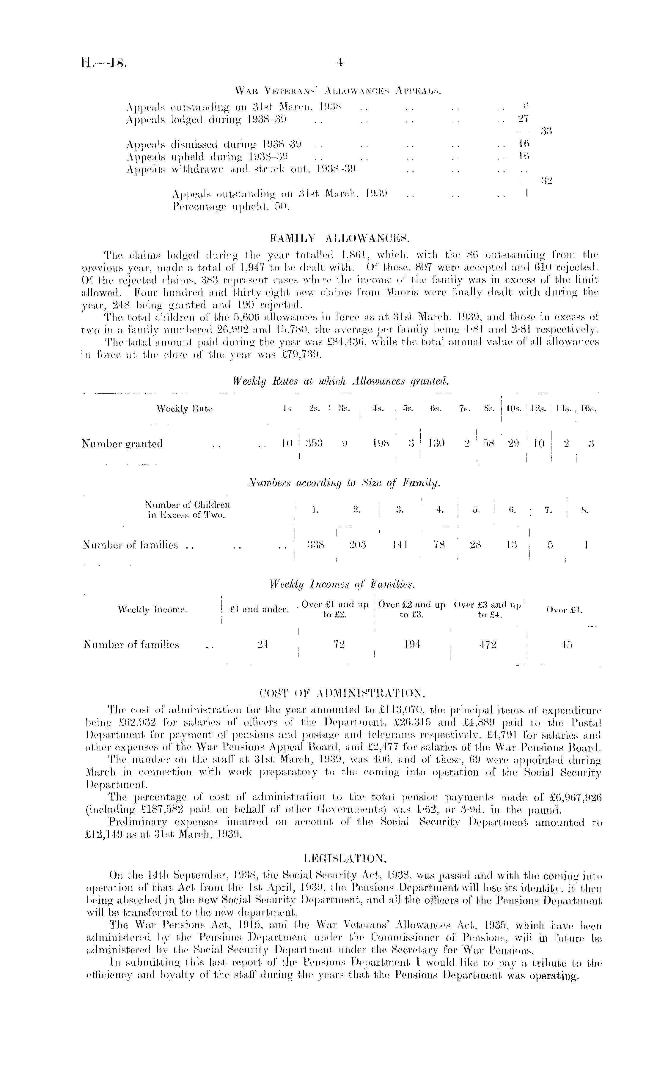 COST OF ADMINISTRATION. The cost of administration for the year amounted to £113,070, the principal items of expenditure being £62,932 for salaries of officers of the Department, £26,315 and £4,889 paid to the Postal Department for payment of pensions and postage and telegrams respectively, £4,791 for salaries and other expenses of the War Pensions Appeal Board, and £2,477 for salaries of the War Pensions Board. The number on the staff at 31st March, 1939, was 406, and of these, 69 were appointed during March in connection with work - preparatory to the coming into operation of the Social Security Department. The percentage of cost of administration to the total pension payments made of £6,967,926 (including £187,582 paid on behalf of other Governments) was 1-62, or 3-9 d. in the pound. Preliminary expenses incurred on account of the Social Security Department amounted to £12,149 as at 31st March, 1939. LEGISLATION. On the 14th September, 1938, the Social Security Act, 1938, was passed and with the coming into operation of that Act from the Ist April, 1939, the Pensions Department will lose its identity, it then being absorbed in the new Social Security Department, and all the officers of the Pensions Department will be transferred to the new department. The War Pensions Act, 1915, and the War Veterans' Allowances Act, 1935, which have been administered by the Pensions Department under the Commissioner of Pensions, will in future be administered by the Social Security Department under the Secretary for War Pensions. In submitting this last report of the Pensions Department I would like to pay a tribute to the efficiency and loyalty of the staff during the years that the Pensions Department was operating.